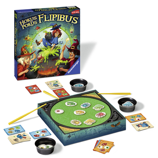 Die Rezepte von Professor Flipibus haben wahrlich magische Wirkung: Für üppigen Haarwuchs etwa braucht man Krötenschleim, Fliegenpilz und Spinnenbeine. Glubschaugen in verschiedenen Farben verleihen dagegen Flügel, vorausgesetzt, die Zutaten landen auf geheimnisvolle Weise im Lehrlings-Kessel. Beschwörend murmeln die Zauberschüler ihr „Hokus-Pokus!“ und berühren mit dem Zauberstab den anvisierten Zutaten-Chip, nur knapp am Rand. Mit gekonntem Kniff und dank der weichen Konsistenz der Meister-Mischung fliegt die Zutat – schwupp – in den Kessel des Zauberschülers! Oder etwa nicht? Zaubern will schließlich gelernt sein. Da geht noch Einiges daneben, bis der Erste „Flipibus!“ ruft und tatsächlich die drei Ingredienzen seines Rezeptes im Kessel vorweisen kann. Wer zuerst erfolgreich drei Zaubertränke gebraut hat, gewinnt das rasante Aktionsspiel.