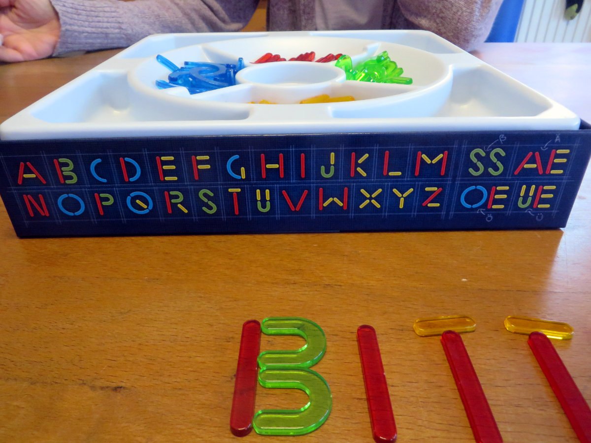 Im Zentrum stehen die transparenten Buchstabenteile – vier unterschiedliche Formen, aus denen sich tatsächlich jeder Buchstabe des Alphabets zusammensetzen lässt. Diese Teile sind nicht nur Material, sondern das eigentliche Herz des Spiels. Sie klacken, sie rutschen, sie überlappen, und plötzlich wird aus einem gebogenen Segment ein „C“, aus geraden Linien ein „H“, aus einem Winkelstück ein „V“. Die Alphabet-Bauübersicht, diw außen auf jeder Seite der Schachtel abgedruckt ist, dient dabei als Bauanleitung und Orientierung. Besonders schön, viele Buchstaben lassen sich aus denselben Teilen bauen, aber es gibt immer nur eine korrekte Art, sie zu formen – ein kleines Puzzle im Puzzle.