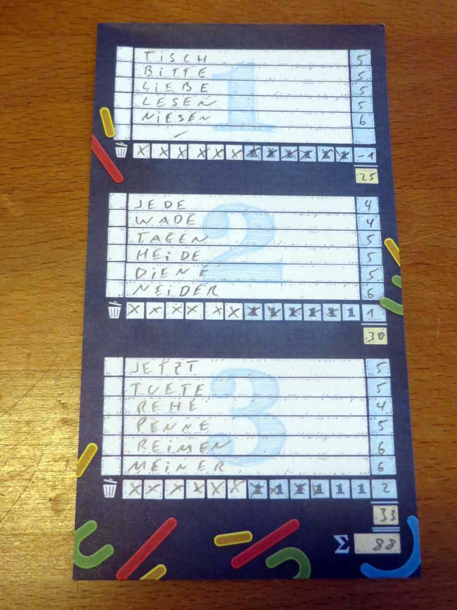 Der Wettlauf endet, sobald ein Spieler sein sechstes Wort gesichert hat. Dann dürfen alle anderen noch genau ein weiteres Wort legen – allerdings ohne neue Teile zu würfeln. Danach folgt die Wertung. Buchstaben zählen Punkte, Bonusfelder bringen zusätzliche Zähler und am Ende der dritten Runde gewinnt, wer insgesamt am meisten gesammelt hat.