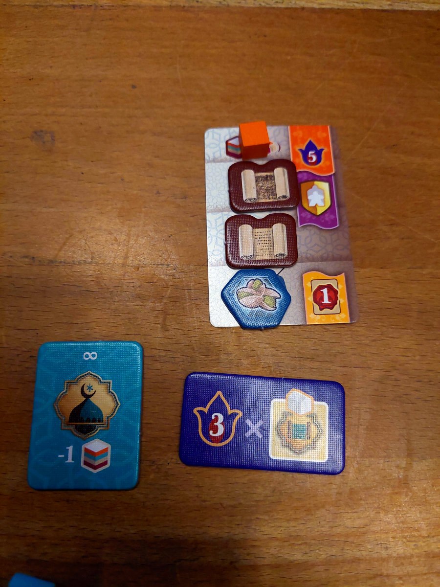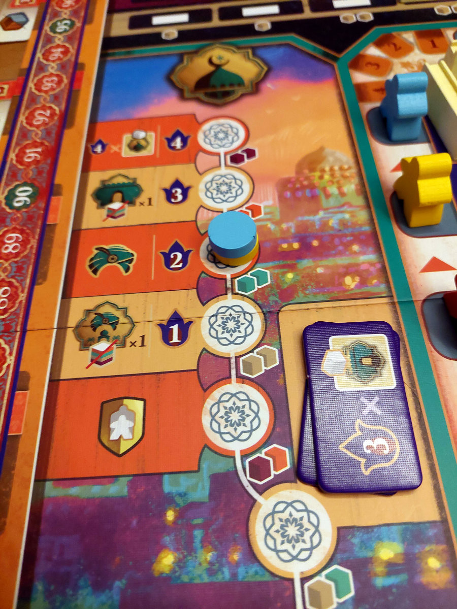 Ein weiterer zentraler Bereich ist die Moschee, die eine Art Fortschrittsleiste darstellt. Wer hier investiert, erhält mächtige Boni, Upgrades und am Ende sogar zusätzliche Wertungspunkte. Gleichzeitig konkurriert die Moschee mit dem Palast, in dem man durch das Platzieren von Höflingen langfristige Punkteeinnahmen generiert. Beide Systeme belohnen Spezialisierung, doch sie verlangen unterschiedliche Ressourcen und Spielstile. „Merw“ lädt dazu ein, sich zu fokussieren, aber es bestraft auch jene, die zu einseitig agieren.