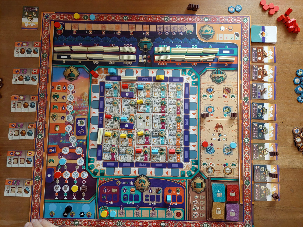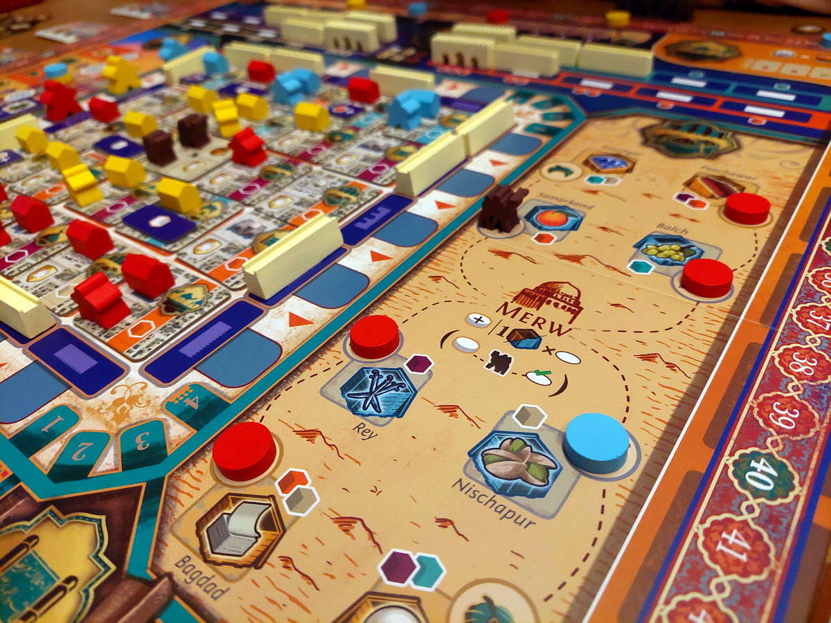 Im 12. Jahrhundert des heutigen Turkmenistans bauen und handeln die Spieler, um Reichtum und Macht zu erlangen. Es gilt, die Stadt auszubauen, sie gegen die heranrückenden Mongolen zu schützen, florierenden Handel zu betreiben und den Glauben zu ehren, indem man der Moschee huldigt. Dieser thematische Rahmen ist nicht nur atmosphärisch, sondern bildet das Fundament eines strategisch dichten Eurogames, das seine Spieler über drei Jahresrunden hinweg in ein eng verzahntes Netz aus Planung, Timing und Prioritätenmanagement wirft.