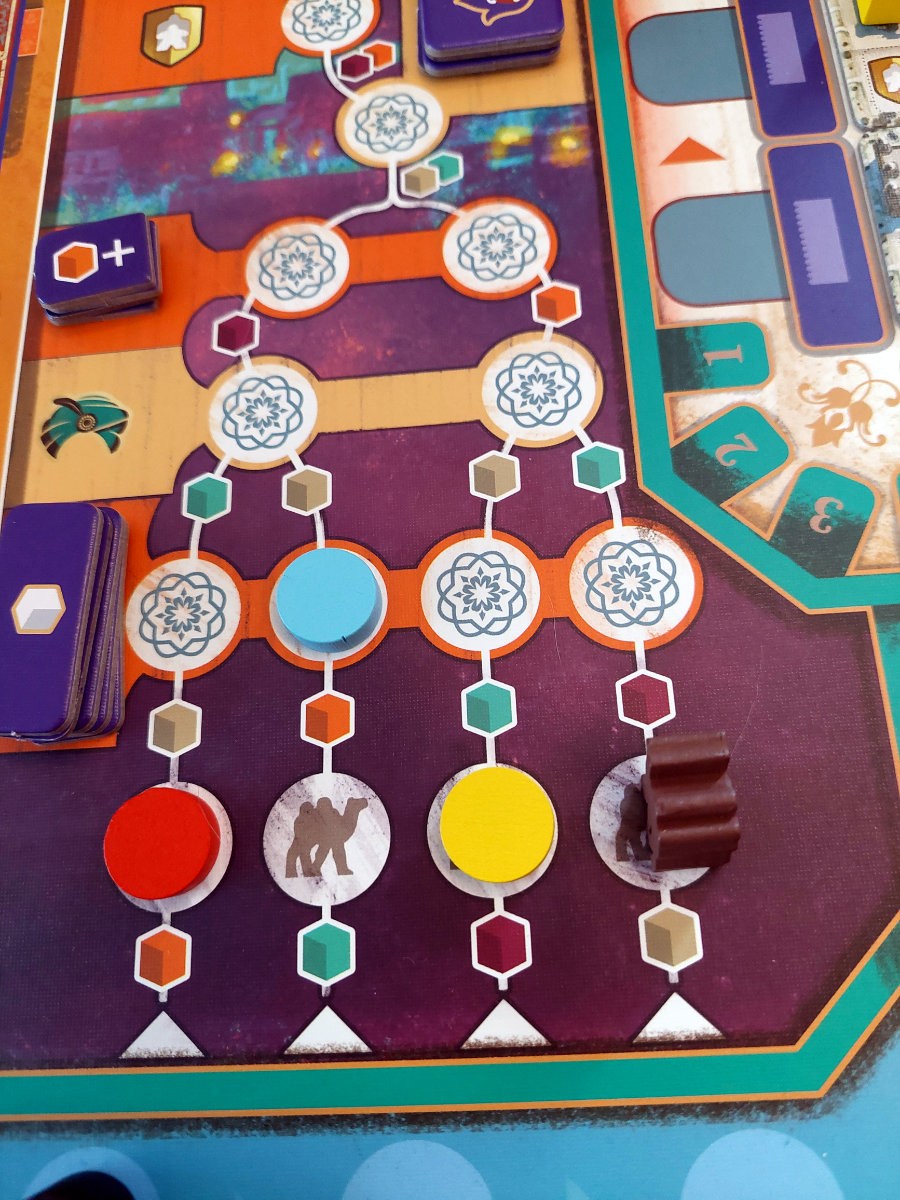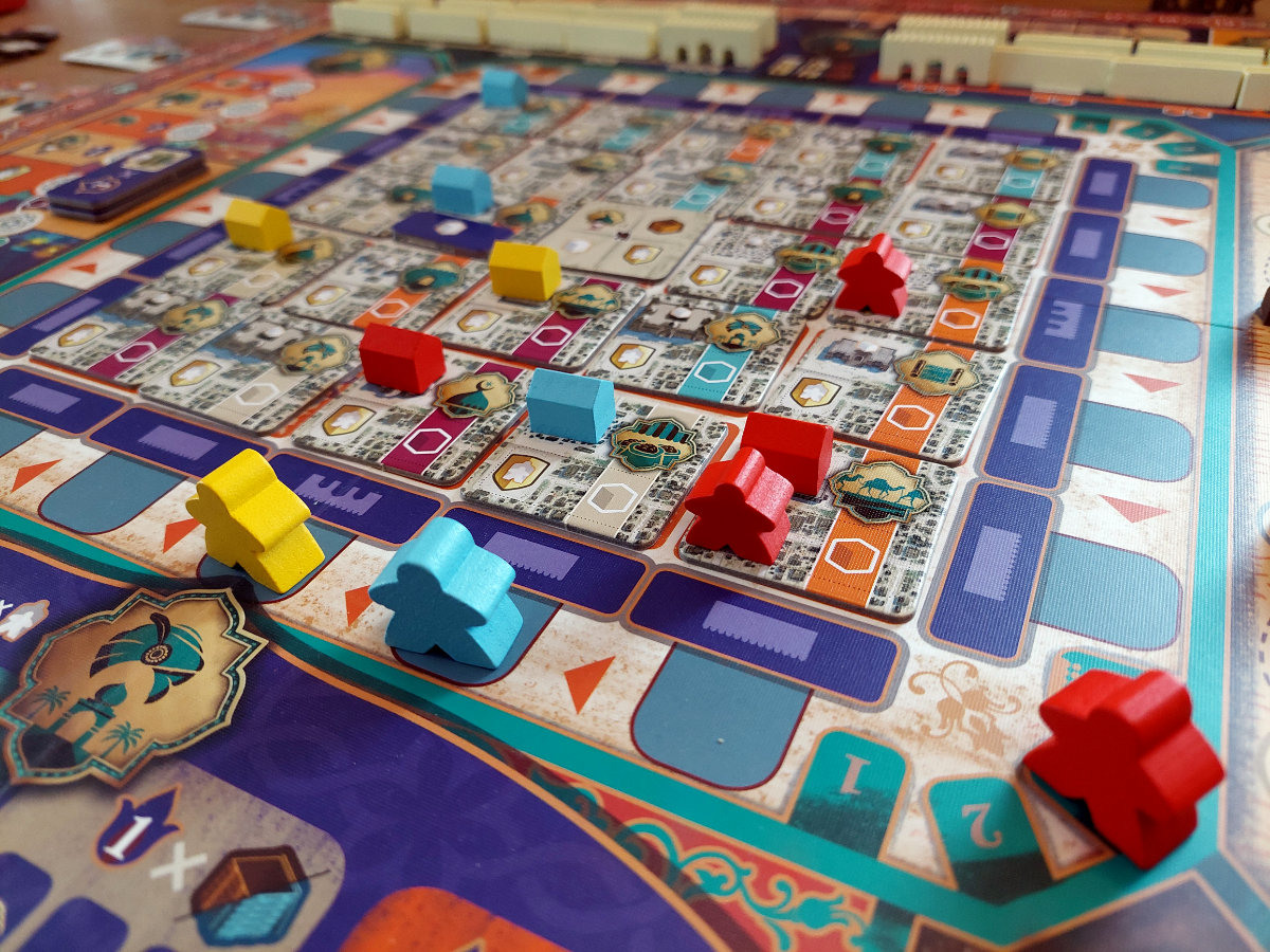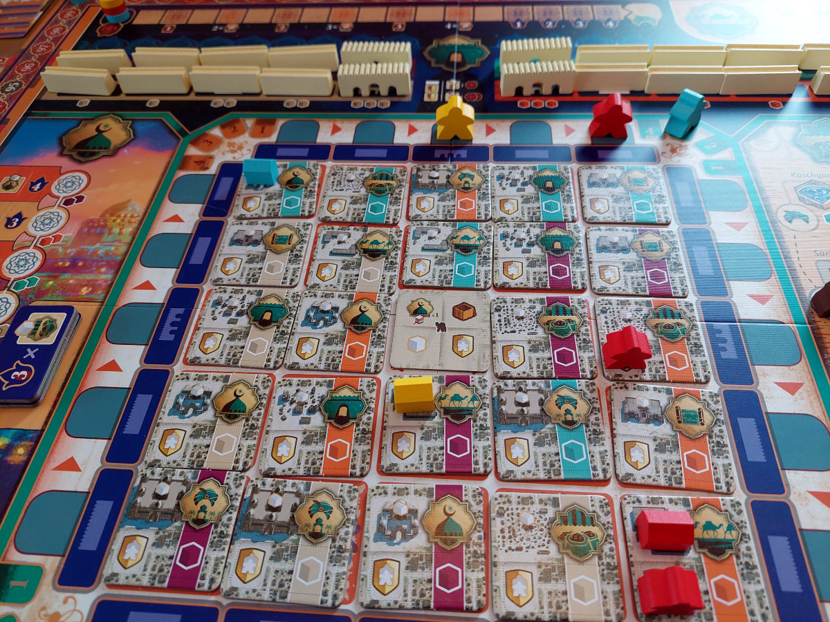 Das Herzstück des Spiels ist der Rundlauf der „Master“-Meeples entlang der Stadtmauern. Jede Runde zwingt die Position des eigenen Meeples dazu, eine bestimmte Reihe oder Spalte zu aktivieren. Dieser Mechanismus erzeugt eine Art rhythmische Spannung. Man sieht, was man gern tun würde, aber die Frage ist, ob man es jetzt tun kann — oder ob man sich durch geschickte Manipulation der Zugreihenfolge erst in die richtige Position bringen muss. „Kamele“, die universelle Währung für Flexibilität, spielen dabei eine zentrale Rolle. Sie erlauben es, in der Zugreihenfolge vorzurücken, wertvolle Karawanenkarten zu sichern oder im Kamelmarkt kleine, aber oft spielentscheidende Boni zu erhalten.