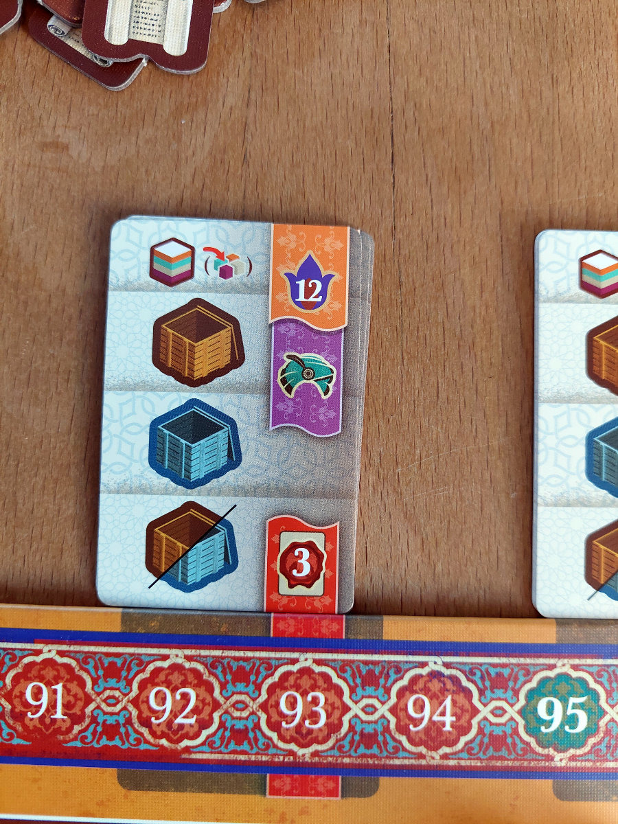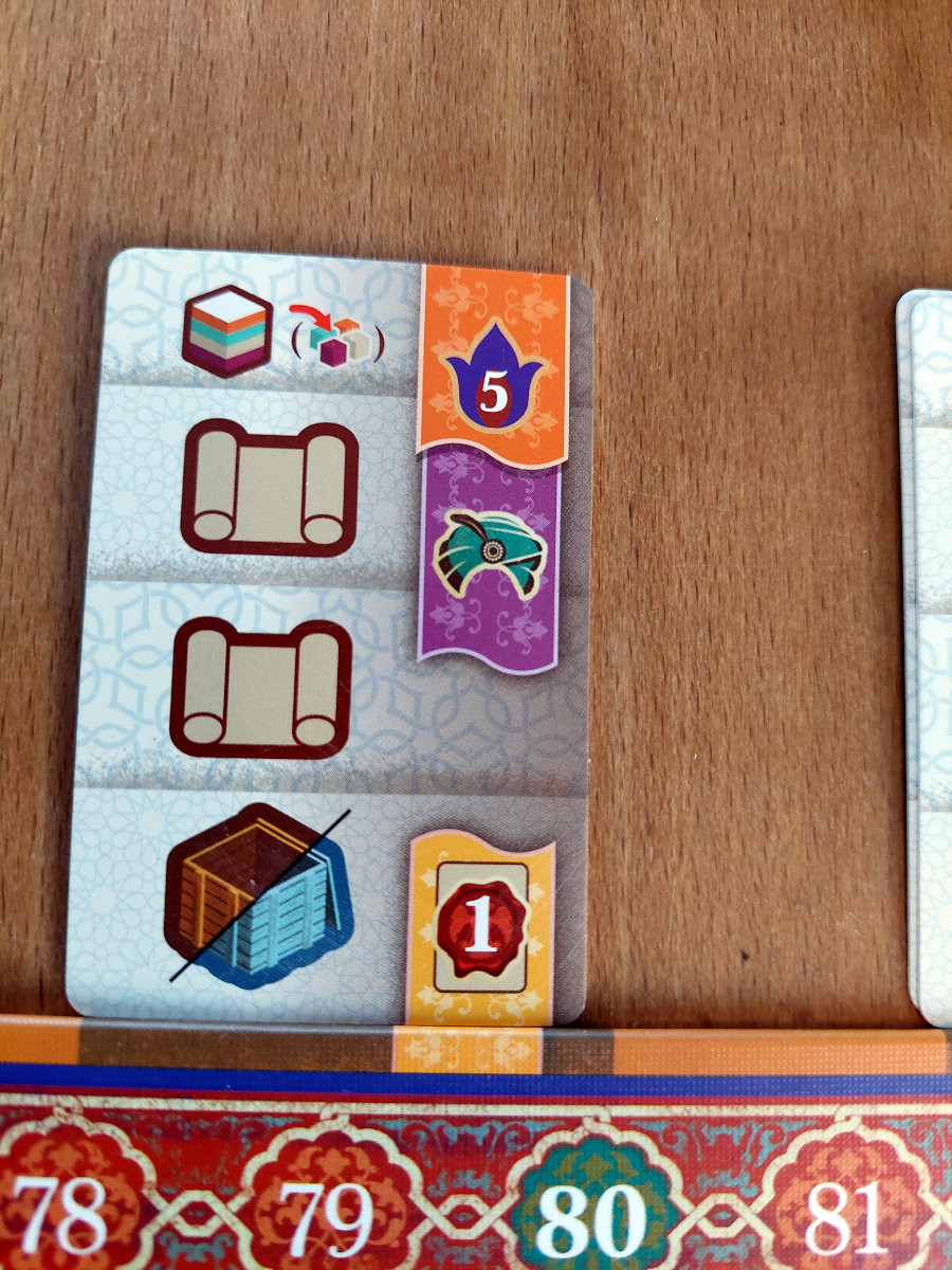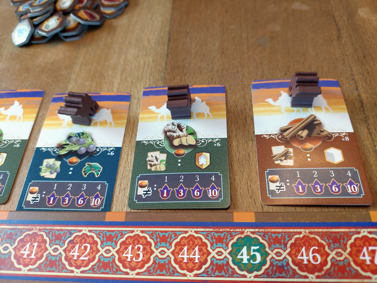 Das Herzstück des Spiels ist der Rundlauf der „Master“-Meeples entlang der Stadtmauern. Jede Runde zwingt die Position des eigenen Meeples dazu, eine bestimmte Reihe oder Spalte zu aktivieren. Dieser Mechanismus erzeugt eine Art rhythmische Spannung. Man sieht, was man gern tun würde, aber die Frage ist, ob man es jetzt tun kann — oder ob man sich durch geschickte Manipulation der Zugreihenfolge erst in die richtige Position bringen muss. „Kamele“, die universelle Währung für Flexibilität, spielen dabei eine zentrale Rolle. Sie erlauben es, in der Zugreihenfolge vorzurücken, wertvolle Karawanenkarten zu sichern oder im Kamelmarkt kleine, aber oft spielentscheidende Boni zu erhalten.