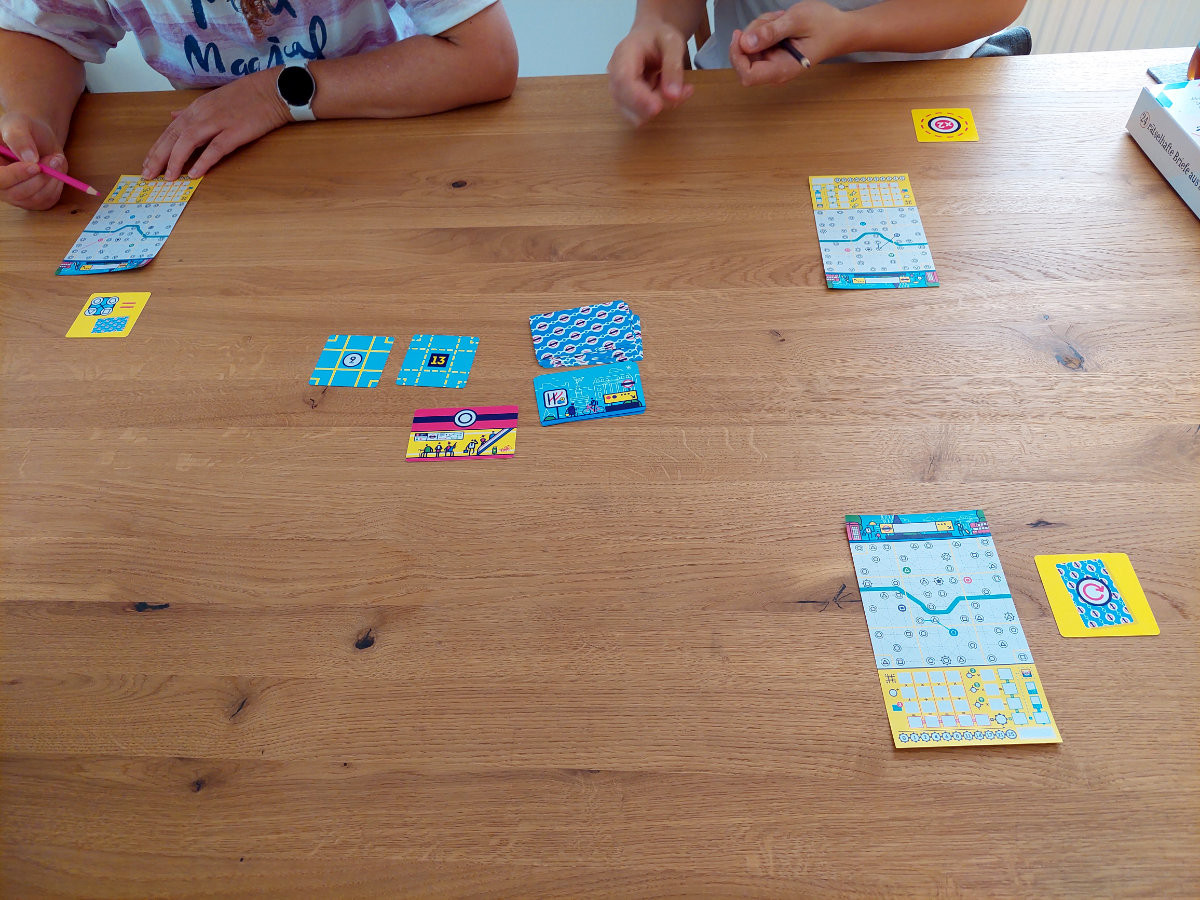 Materialseitig überzeugt die Ausgabe mit stabilen Blöcken, klaren Symbolen und farbigen Stiften, die das Einzeichnen der Linien angenehm machen. – die vier Buntstifte werden rundenweise weitergereicht. Der Plan selbst ist übersichtlich gestaltet, aber dennoch thematisch genug, um das Gefühl einer U‑Bahnkarte zu vermitteln. Die Variabilität ist ebenfalls hoch. Durch unterschiedliche Wertungskarten und die zufällige Reihenfolge der Stationskarten spielt sich jede Partie spürbar anders. Wer möchte, kann sogar die Rückseite des Plans nutzen, die eine anspruchsvollere Variante bietet.