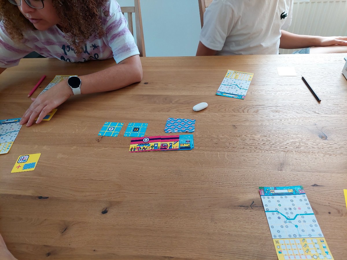 Der Kernmechanismus ist schnell erklärt. Vier verschiedenfarbige Linien sollen nacheinander auf dem eigenen Plan eingezeichnet werden. Welche Station als Nächstes verbunden werden darf, bestimmen aufgedeckte Karten, die jeweils ein Symbol zeigen. Dadurch entsteht ein spannender Spagat zwischen Planung und Improvisation. Man hat eine grobe Vorstellung davon, welche Symbole im Deck vorkommen, aber nie die Gewissheit, wann sie erscheinen. Genau hier entfaltet das Spiel seinen Reiz. Jede Linie ist ein kleines Puzzle, das sich Zug um Zug verändert und immer wieder neue Entscheidungen erzwingt. Man möchte möglichst viele Bezirke verbinden, wichtige Wahrzeichen anfahren und gleichzeitig die eigene Linie so führen, dass sie sich nicht selbst blockiert. Und wenn man glaubt, eine perfekte Route gefunden zu haben, kommt garantiert eine Karte, die alles über den Haufen wirft^^.