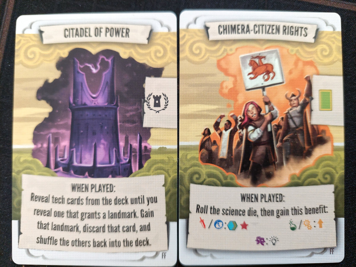 Die neuen Tapestry-Karten reduzieren das berüchtigte „Glückslotto“ des Grundspiels. Viele Karten bieten situative Vorteile, die sich planbarer anfühlen. Gleichzeitig bleibt der Überraschungsmoment erhalten, aber ohne das Gefühl, dass eine einzige Karte das Spiel kippt. Die Tech-Karten wirken kohärenter und belohnen clevere Timing-Entscheidungen. Besonders schön dabei ist, dass einige Technologien mit den neuen Zivilisationen interagieren, ohne dass man sie zwingend braucht.