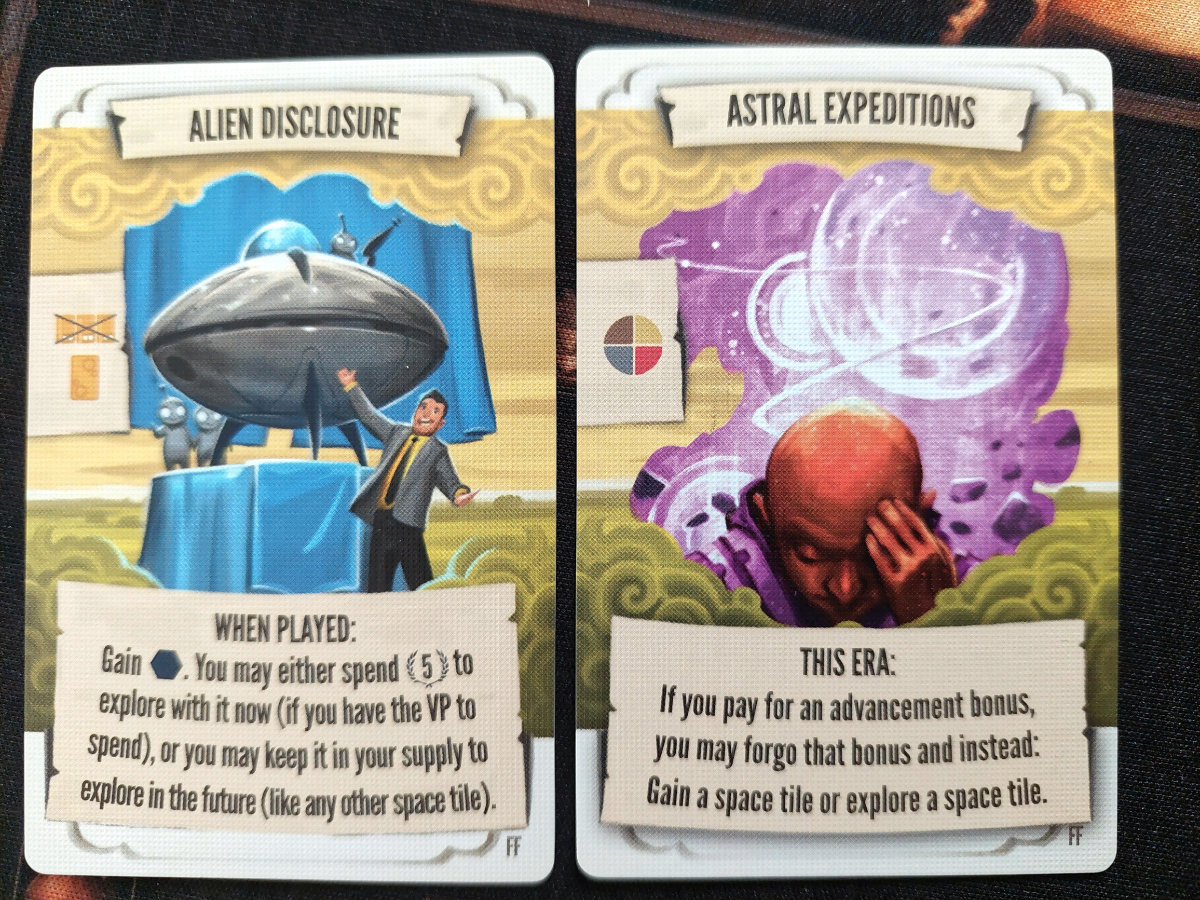 Zum einen natürlich neue Zivilisationen, die mutiger, thematischer und variabler sind. Sie sind deutlich fantasievoller als im Grundspiel: Zeitreisende, Traumwandler, Dimensionsforscher – allesamt mit asymmetrischen Fähigkeiten, die stärker auf langfristige Planung setzen. Sie spielen sich abwechslungsreich, ohne überladen zu wirken. Besonders gelungen ist, dass viele Fähigkeiten elegant in bestehende Mechaniken eingreifen, statt neue Subsysteme aufzuzwingen.