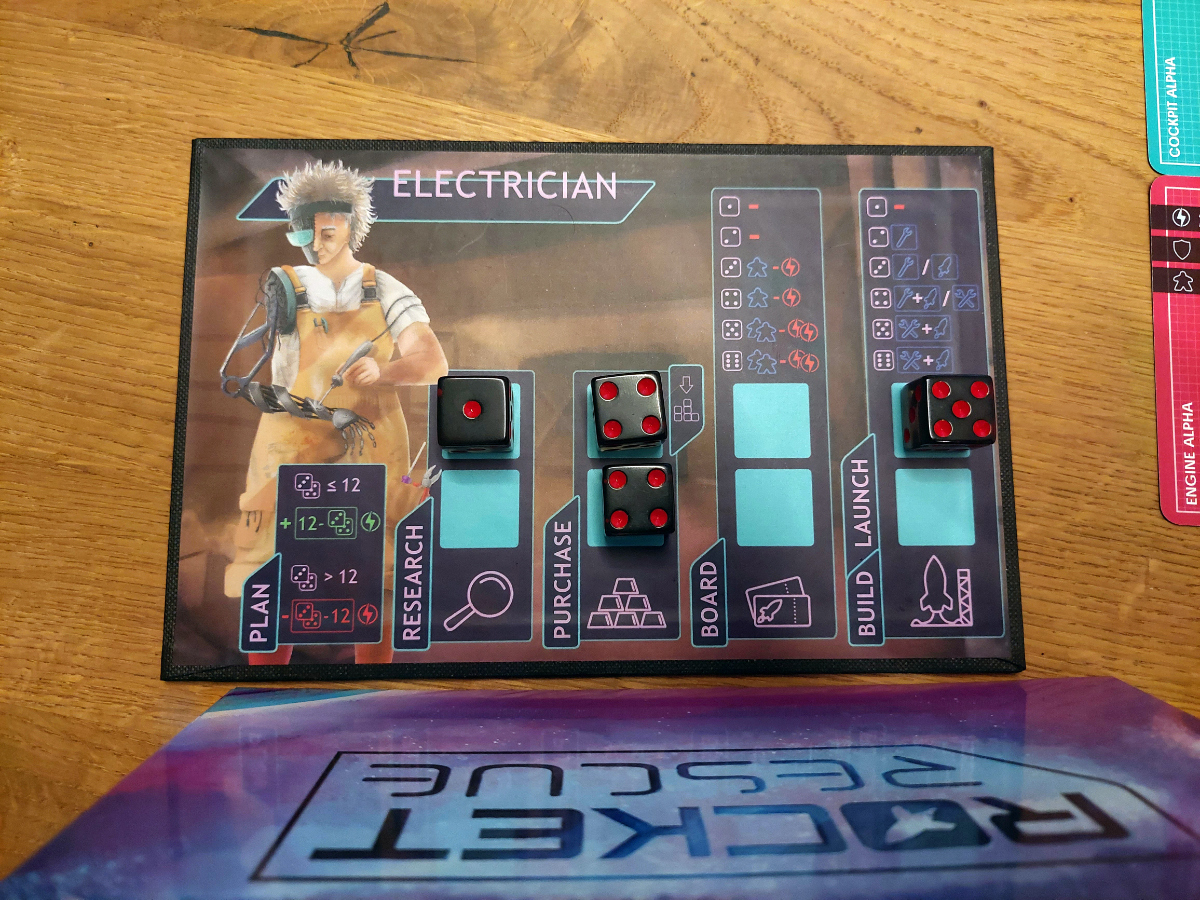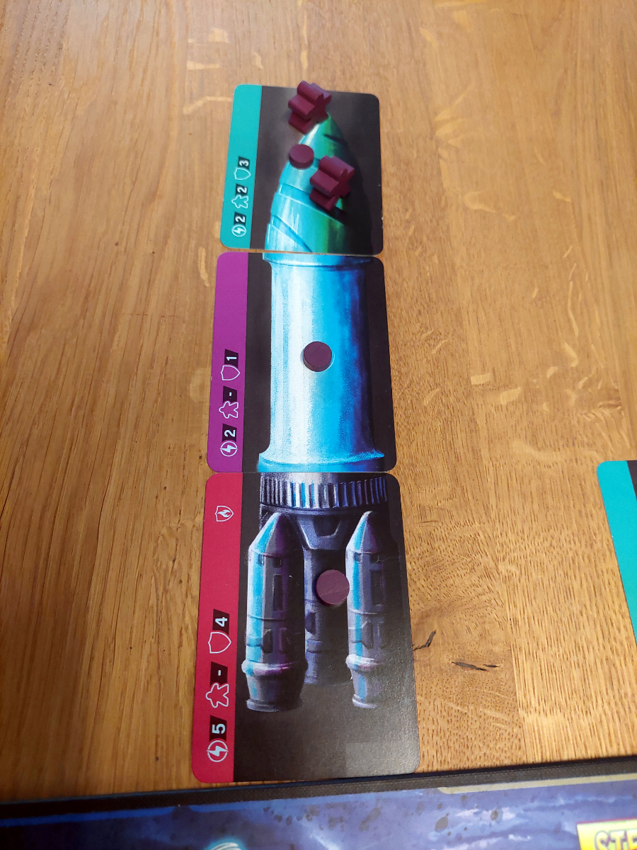 Hiernach werden die Sichtschirme gelüftet und eben die eventuellen Energiekosten kontrolliert. Dann wird geforscht und hier entsprechend der Augenzahlen die Reihenfolge festgelegt, wer wann dran ist, sich eine der Forschungskarten (Raketenteile: Cockpit, Treibstofftank, Passagiermodul, Antrieb) nehmen zu dürfen. Die Teile werden erst später beim Zusammenbau bezahlt und nun erstmal vor dem Spieler ausgelegt.