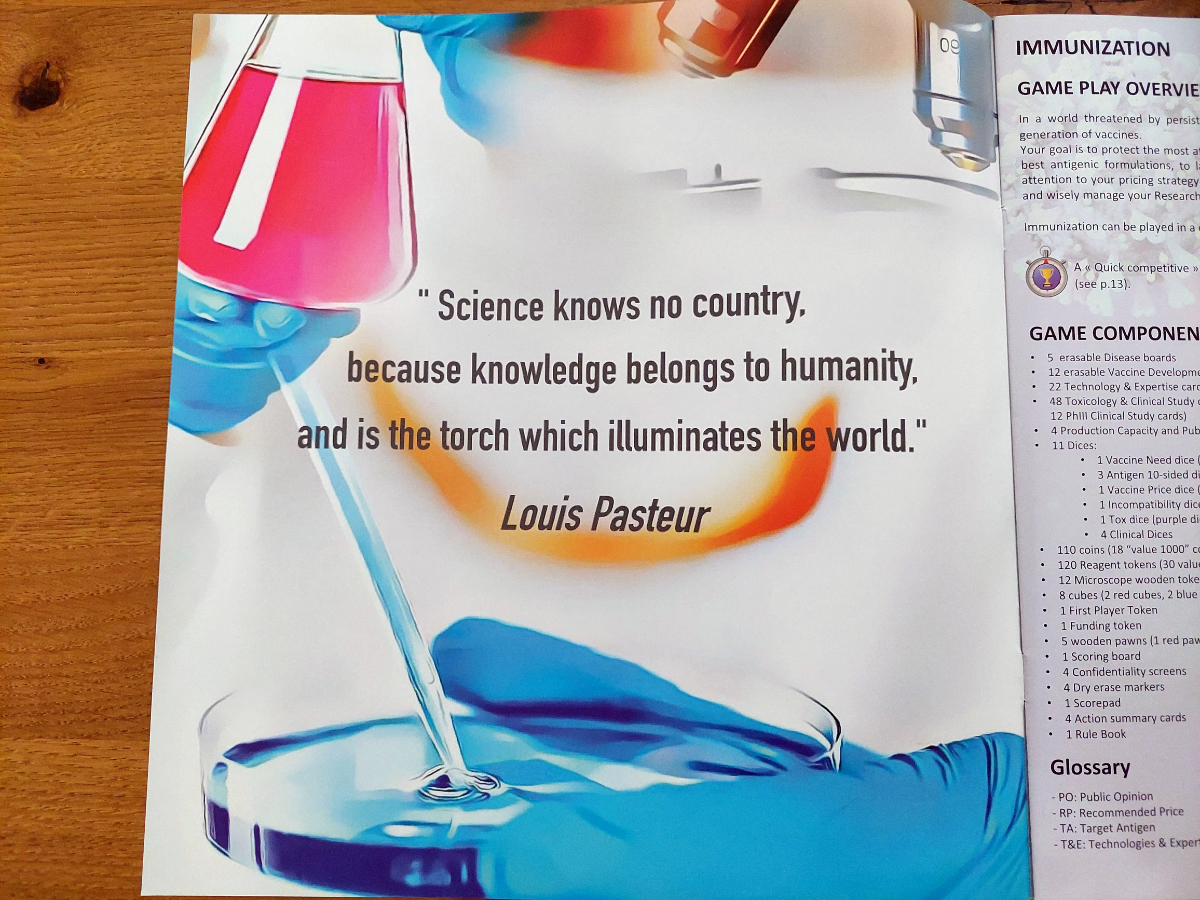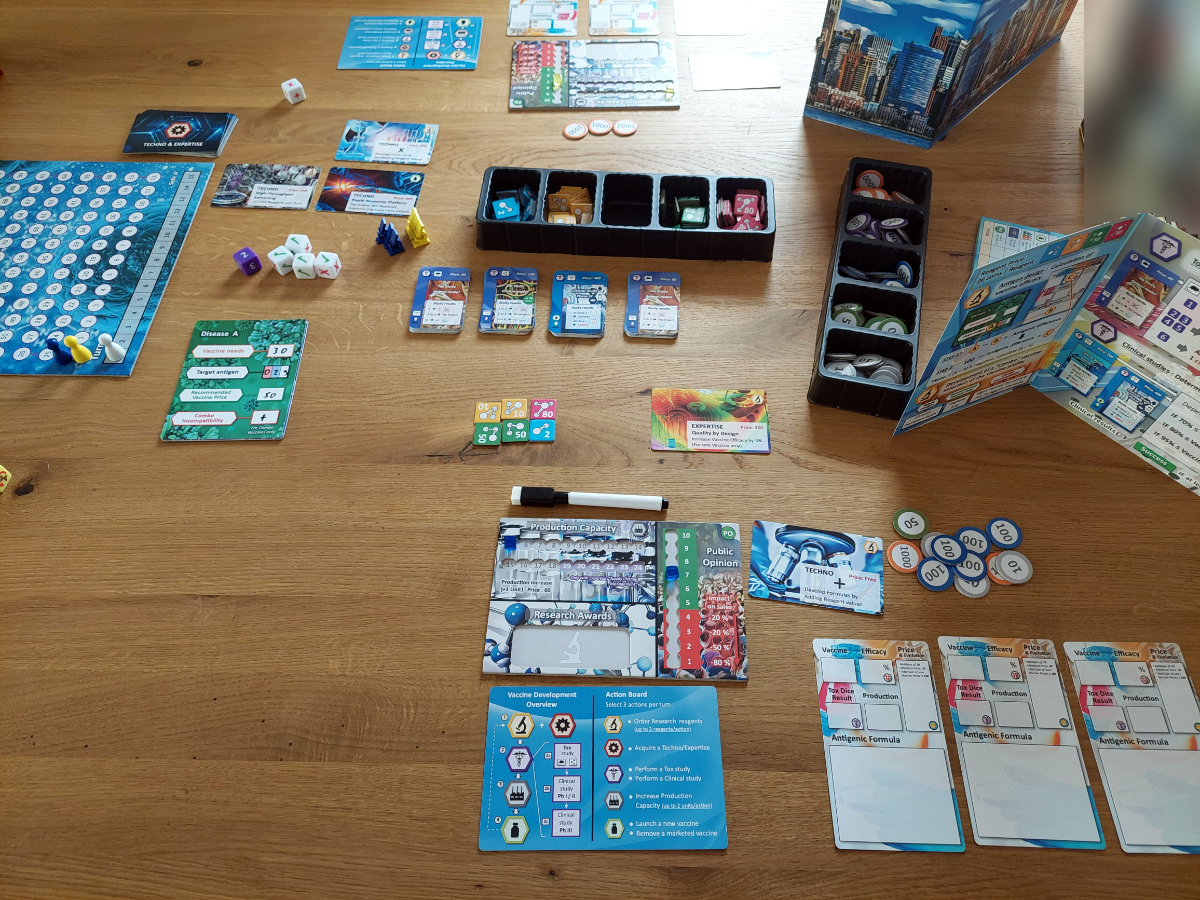 Ein sehr aufwendiges, aber auch interessantes Spiel rund um die Entwicklung von medizinischen Präparaten. Im Wettstreit präparieren die Spieler als Vertreter verschiedener Pharmaunternehmen neue Pillen und Tabletten. Die Forschung steht dabei zunächst im Vordergrund und so muss vom Kleinsten an, alles berücksichtigt werden, inklusive der Skizzierung von Nukleotidketten^^…jedenfalls mit vielen Tests und Rechnereien, um die Chancen auf ein wirksames Mittel zu erhöhen. Gelingt dies irgendwann, geht es um die geschickte Vermarktung und natürlich die zu erwartende Gewinnspanne und wie diese maximiert werden kann.