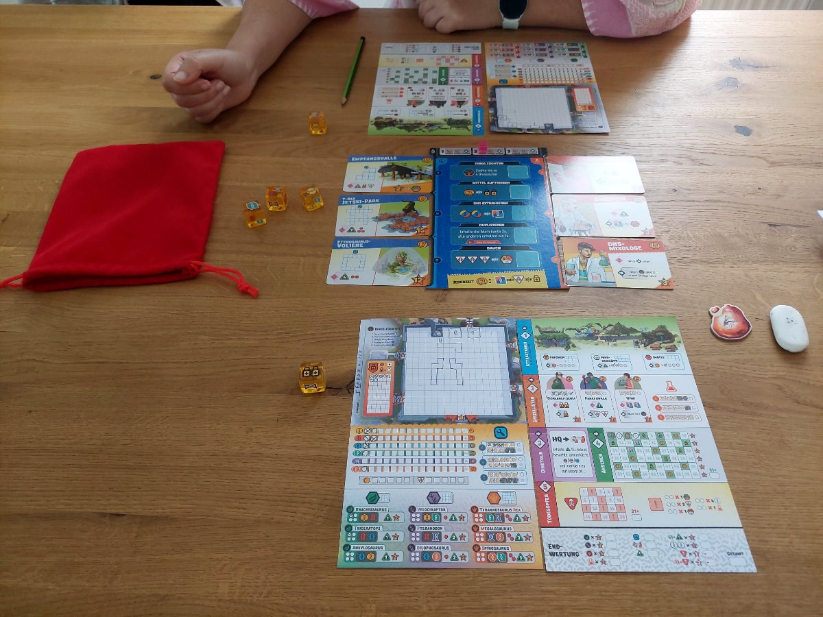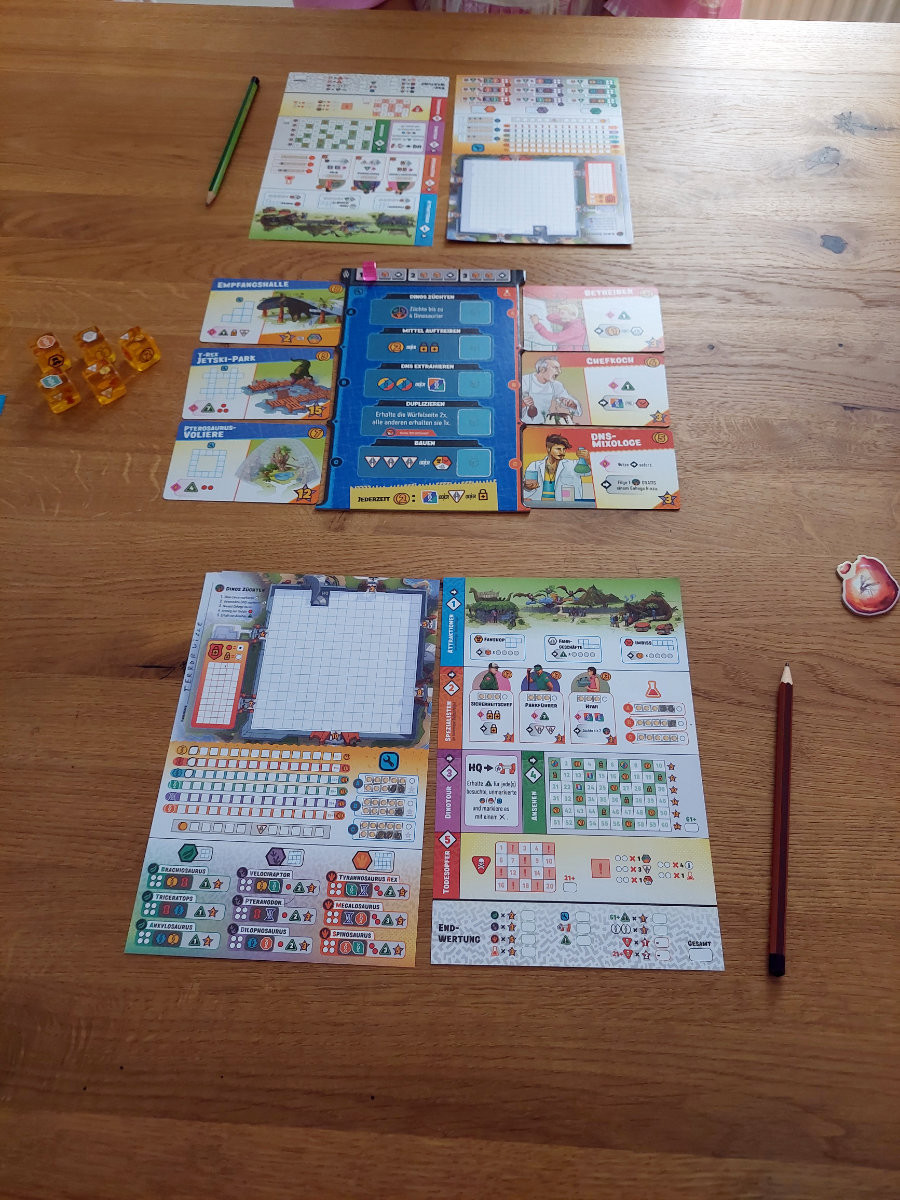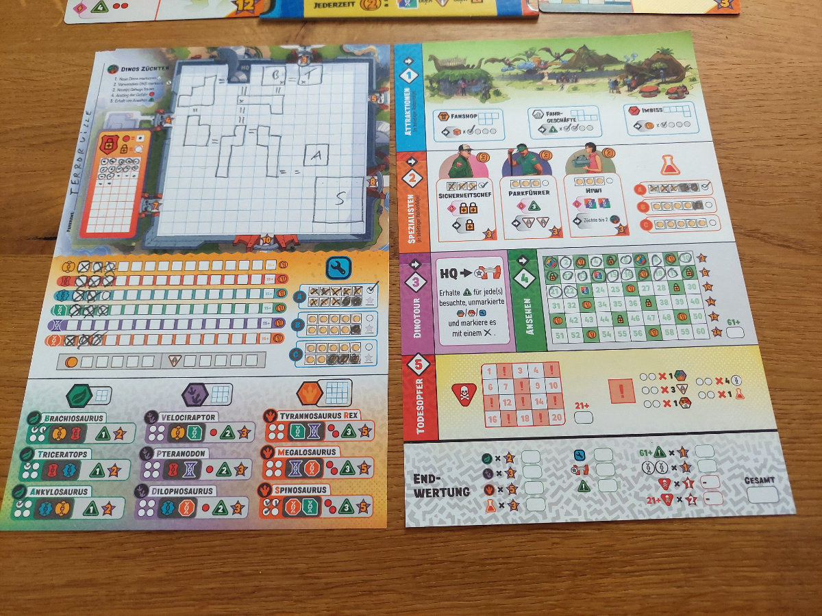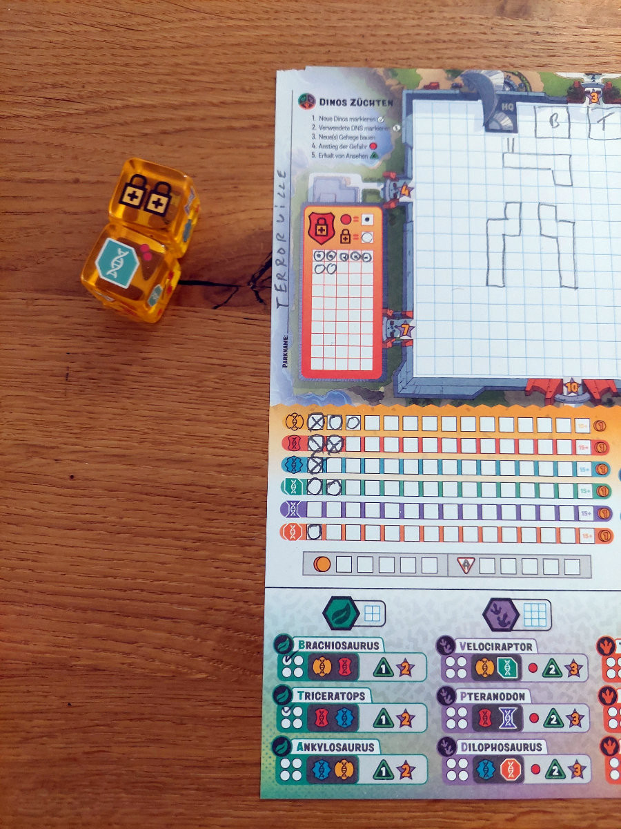 Das alles findet auf je zwei recht übersichtlich strukturierten Bögen statt, sobald man sich einmal mit allen Symbolen vertraut gemacht hat. Ferner liegen die, in jedem Spiel zufällig gezogenen, Gebäude- und Spezialistenkarten an einem kleinen Spielplan an. Auf diesem werden in der Aktionsphase auch die Würfel abgelegt, nachdem ihre Ressourcen notiert wurden. Als Aktionen gibt es z.B. die Verbesserung der Sicherheit, das Züchten von Dinos, das Anlegen von Wegen oder das Einsammeln neuer DNA.