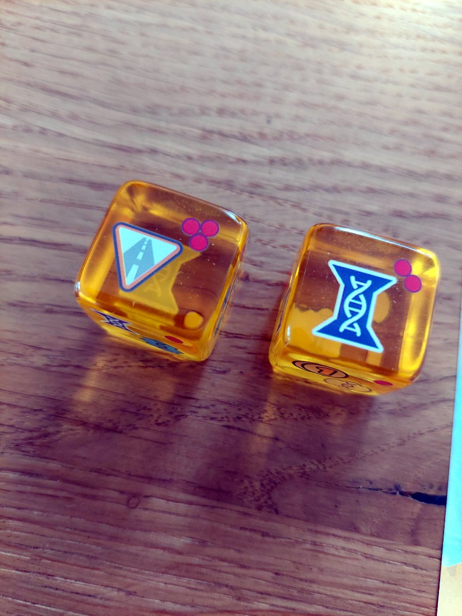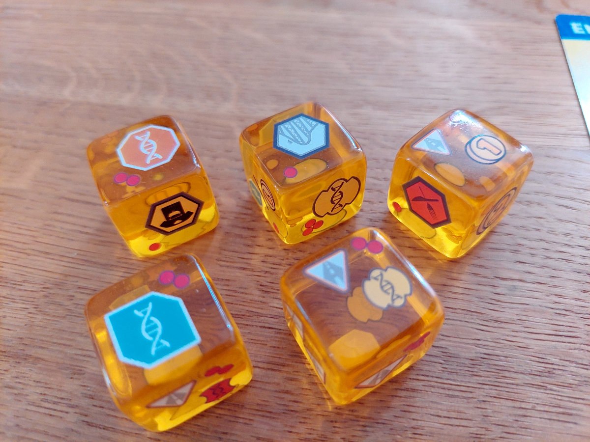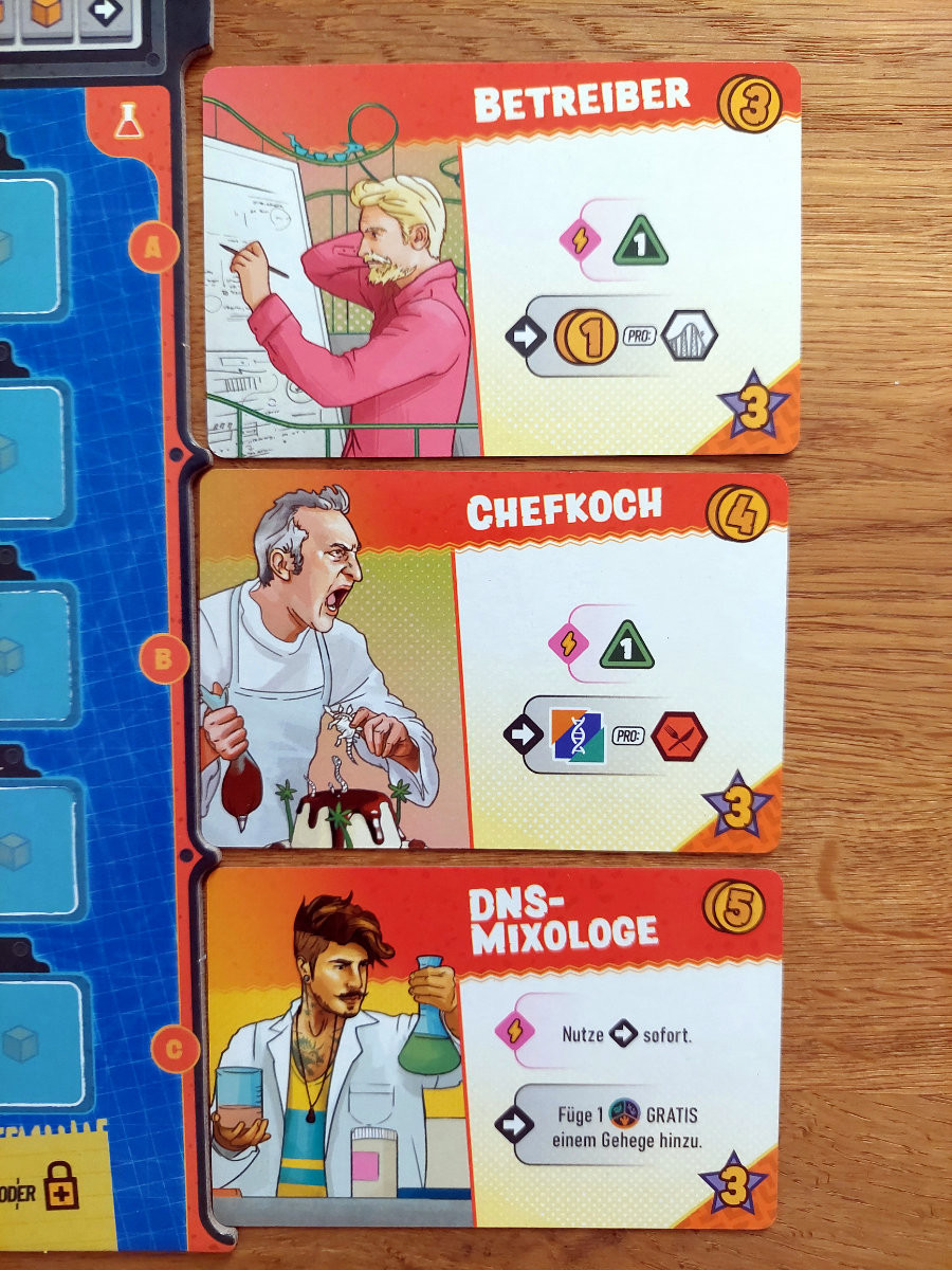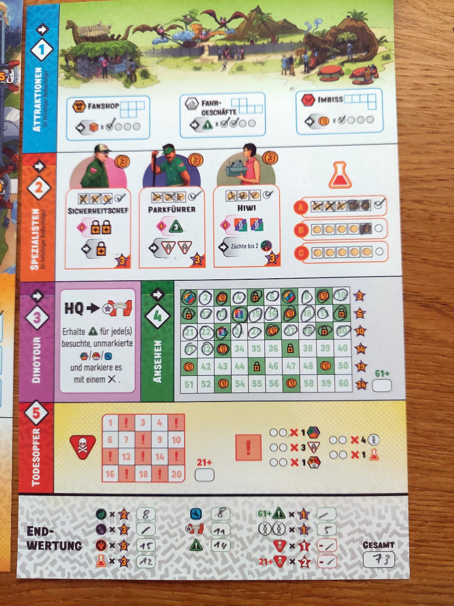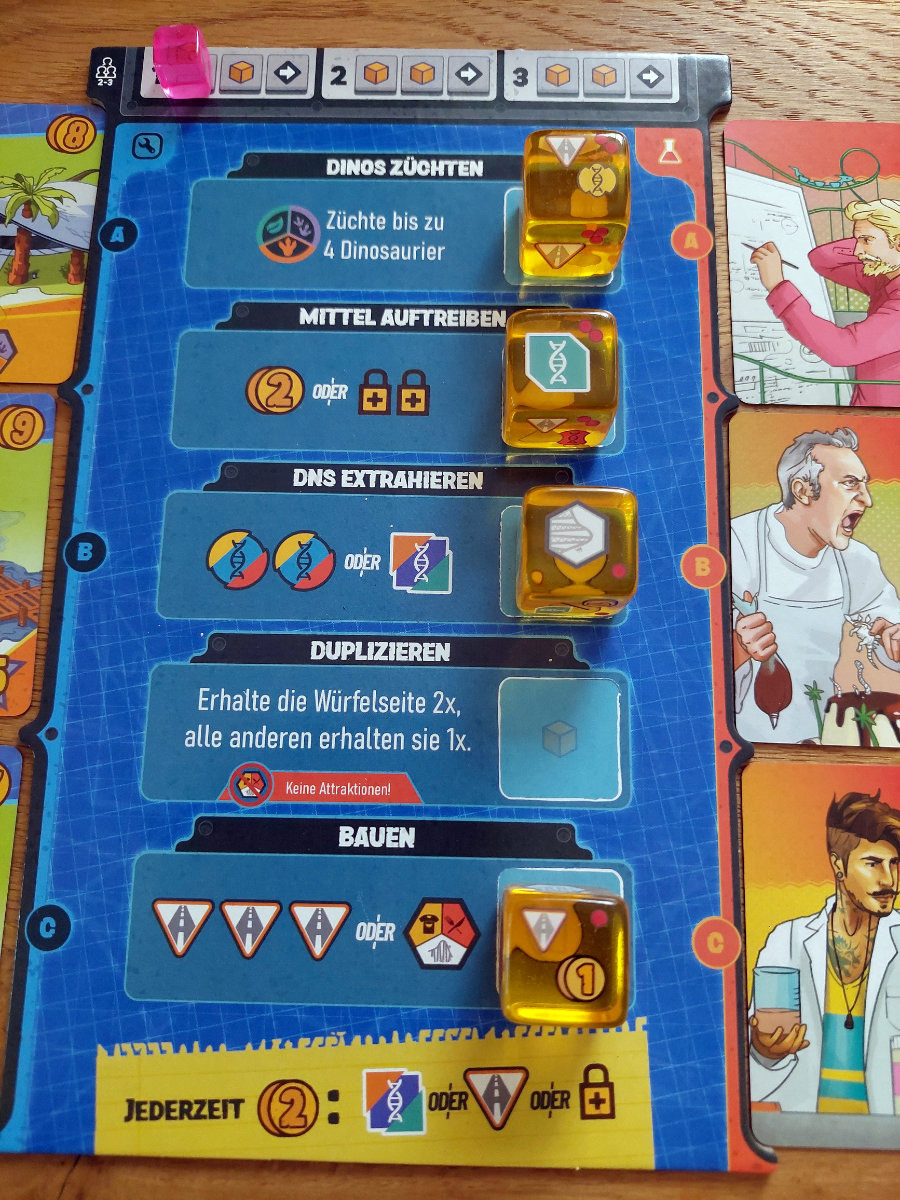 Das alles findet auf je zwei recht übersichtlich strukturierten Bögen statt, sobald man sich einmal mit allen Symbolen vertraut gemacht hat. Ferner liegen die, in jedem Spiel zufällig gezogenen, Gebäude- und Spezialistenkarten an einem kleinen Spielplan an. Auf diesem werden in der Aktionsphase auch die Würfel abgelegt, nachdem ihre Ressourcen notiert wurden. Als Aktionen gibt es z.B. die Verbesserung der Sicherheit, das Züchten von Dinos, das Anlegen von Wegen oder das Einsammeln neuer DNA.