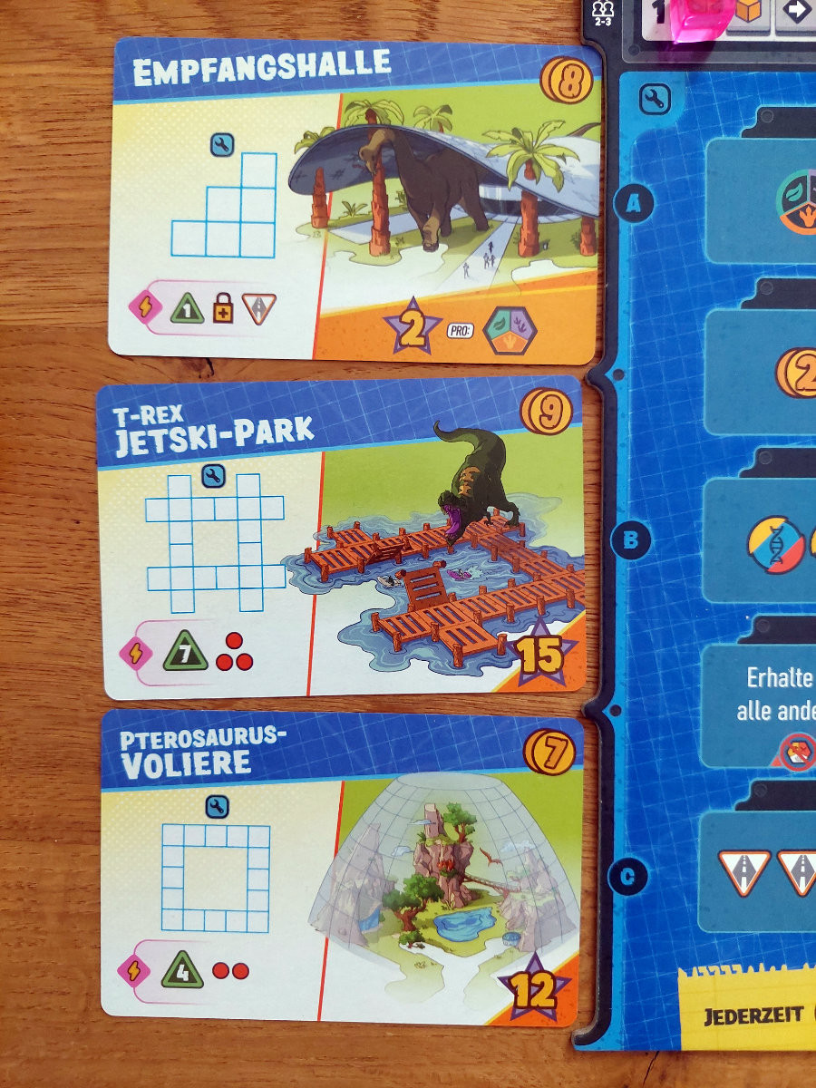Mit Geld lassen sich Gebäude und Spezialisten anschaffen, die mit Sofort-Effekten, Einkommen in der Parkphase und/oder Spielende-Siegpunkten glänzen. Per DNA können bis zu viermal 9 Dinos gezüchtet werden, die dann in entsprechenden Gehegen untergebracht Punkte (und möglicherweise Gefahr) bringen. Die Wege muss man nicht anlegen, da Gebäude und Gehege auch so am Ende Punkte einbringen. Aber ohne diese gibt es keine Tour im Dino-Park für die Besucher und damit keine Ansehenspunkte hierfür. Und in dieser Phase gibt es die meisten Punkte, welche auf der Ansehensleiste viele weitere Boni freischalten können.