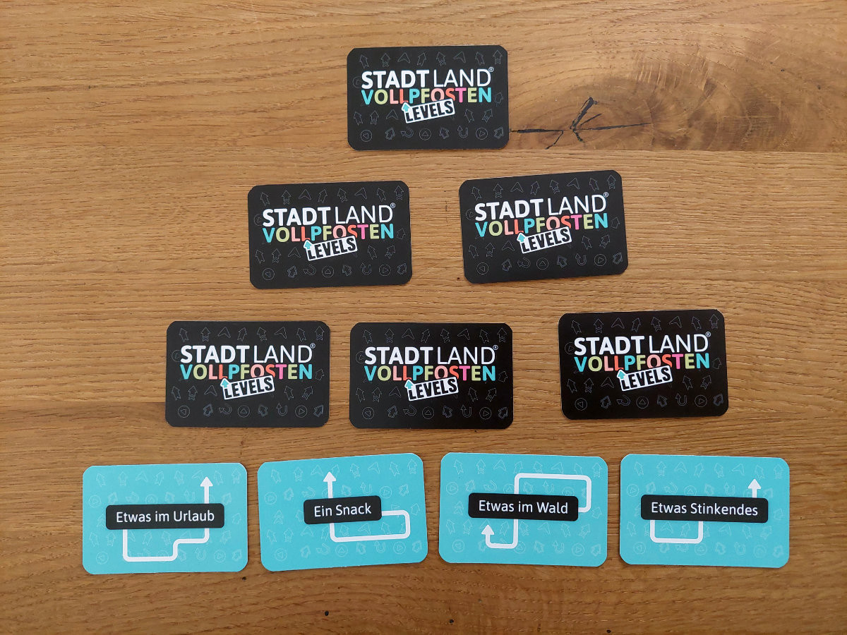 Eine neue, schnelle Variante der „Stadt, Land, Vollpfosten“-Reihe, bei der nicht auf vorgegebenen Blöcken geschrieben wird, sondern Begriffe zu den Kategorien schnell, laut genannt werden müssen.