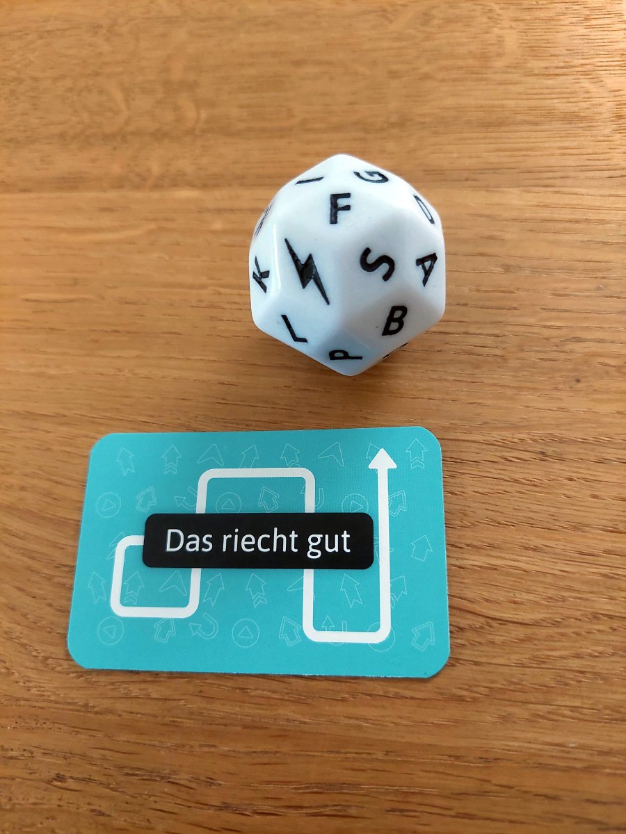 Ein Spieler wirft den Buchstaben-Würfel und dann müssen alle rasch einen passenden Begriff zu einer ihrer offenen Karten rufen. Wem dies am schnellsten gelingt, darf die betreffende Karte aus seiner Pyramide entfernen – wenn die Antwort richtig war^^. Alle anderen gehen diesen Zug leer aus. Es wird erneut gewürfelt usw.