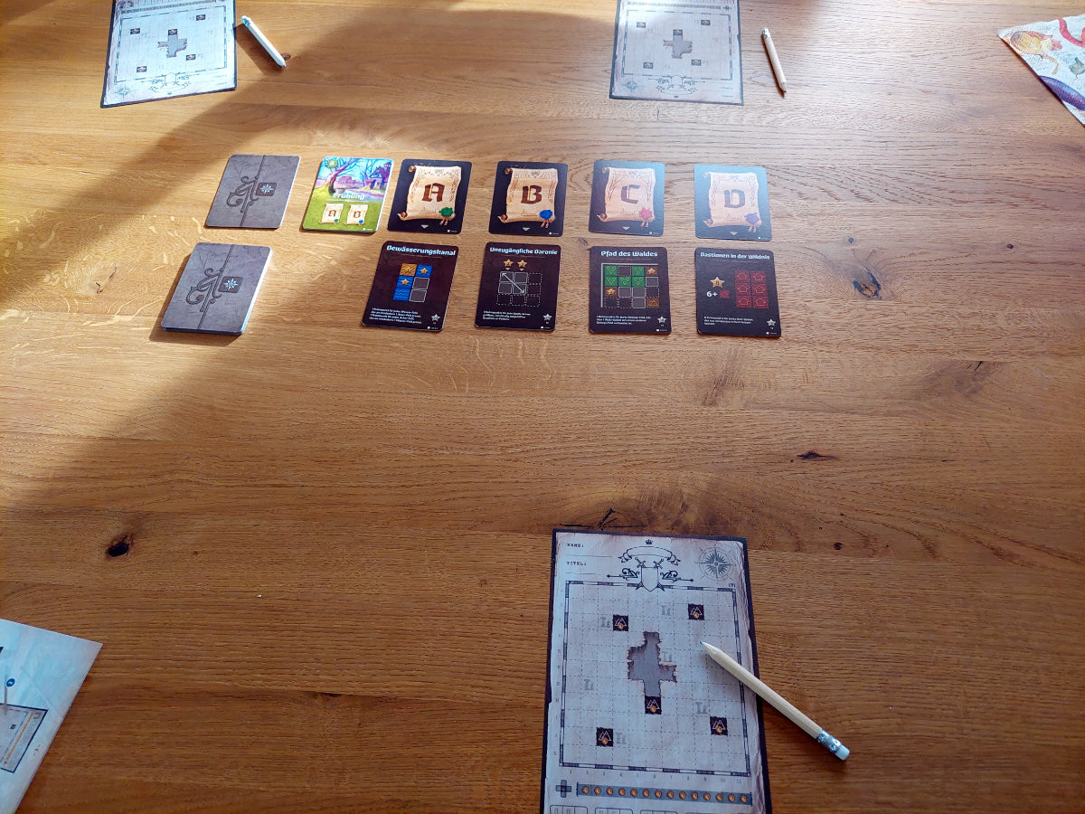 Die Spieler erhalten alle ein Kartenblatt – sie sollten alle mit dem selben arbeiten -, nebst Stift und bereiten die Kartenauslage vor. Dann kann es auch schon losgehen.