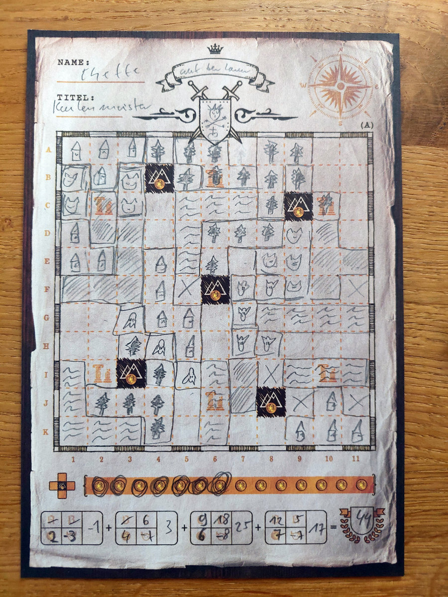 Zu allem Überfluss gibt es auch noch Monster, die durch die Lande ziehen. Und so kommt es, dass ab und an eine Karte gezogen wird, die einen Überfall darstellt. Dann werden die Kartenpläne reihum weitergegeben und ein Mitspieler zeichnet die Tetris-Monster beliebig auf dem Plan ein und gibt die Karte zurück. Um für die so herumstreunenden Monster keine Minuspunkte zu kassieren, muss man diese nun baldmöglichst mit beliebigen Landschaftstypfeldern umringen.