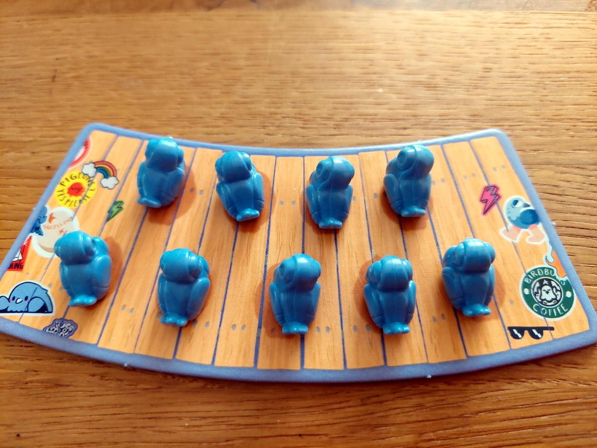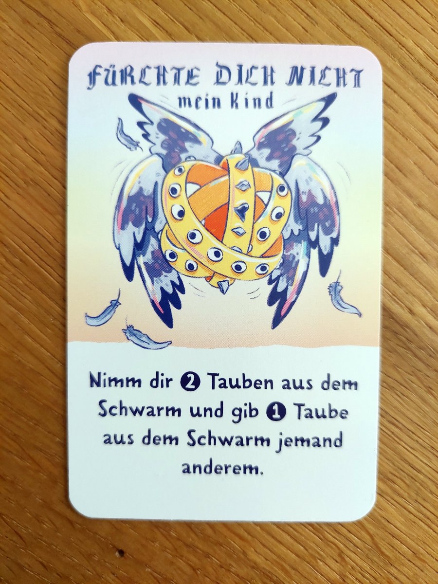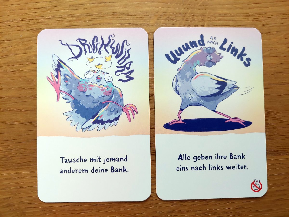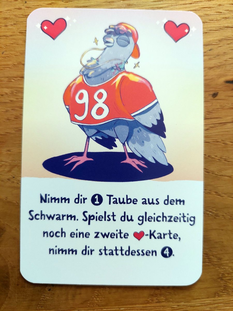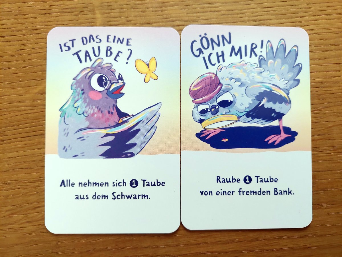 Das ist das ganze Spiel, kurz, schnell, unterhaltsam, leichter Einstieg, lustige Illustrationen, nette Tauben-Minis…..alles gut! In der entsprechenden Spielrunde werden alle viel Kurzweil erfahren und gerne mehrere Partien absolvieren. Vielleicht bietet sich auch ein kleines Turnier oder Trinkspiel an ;).