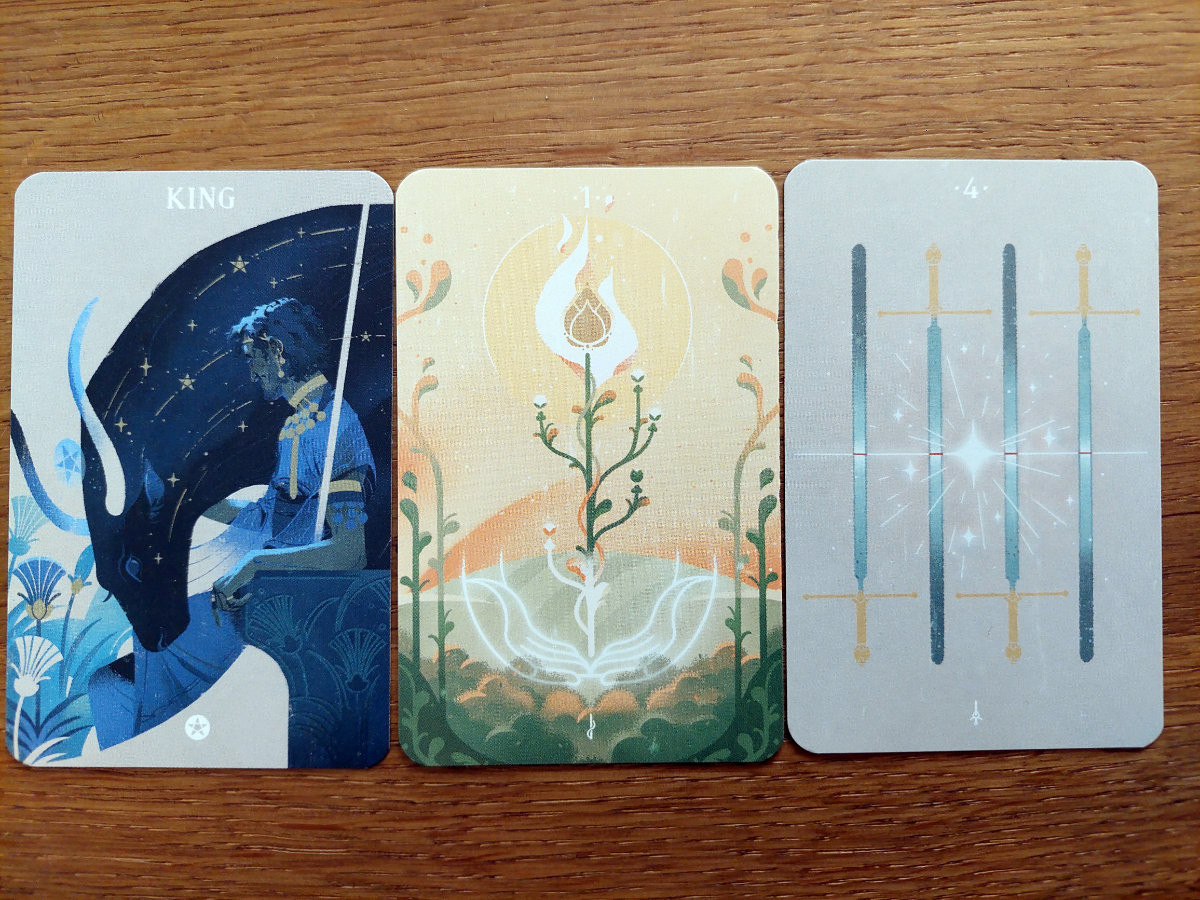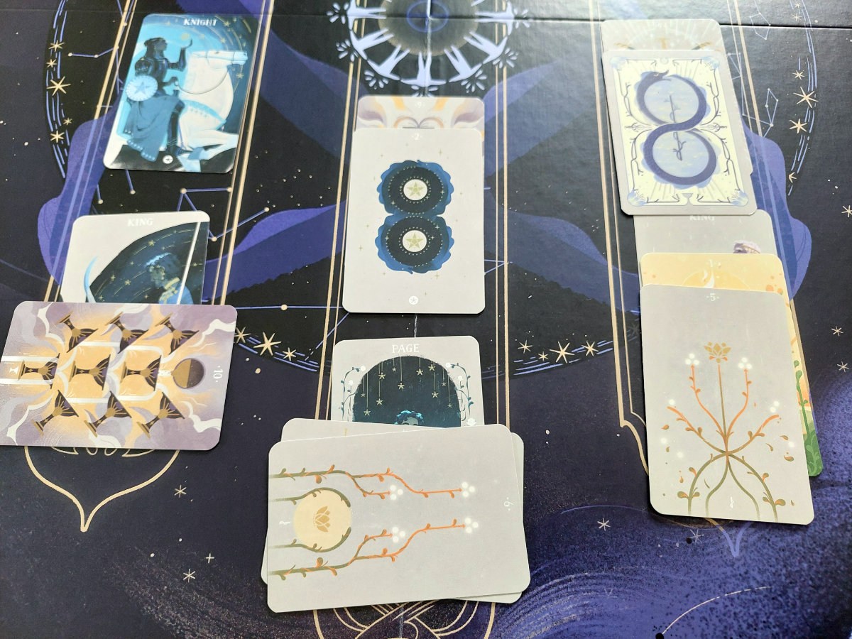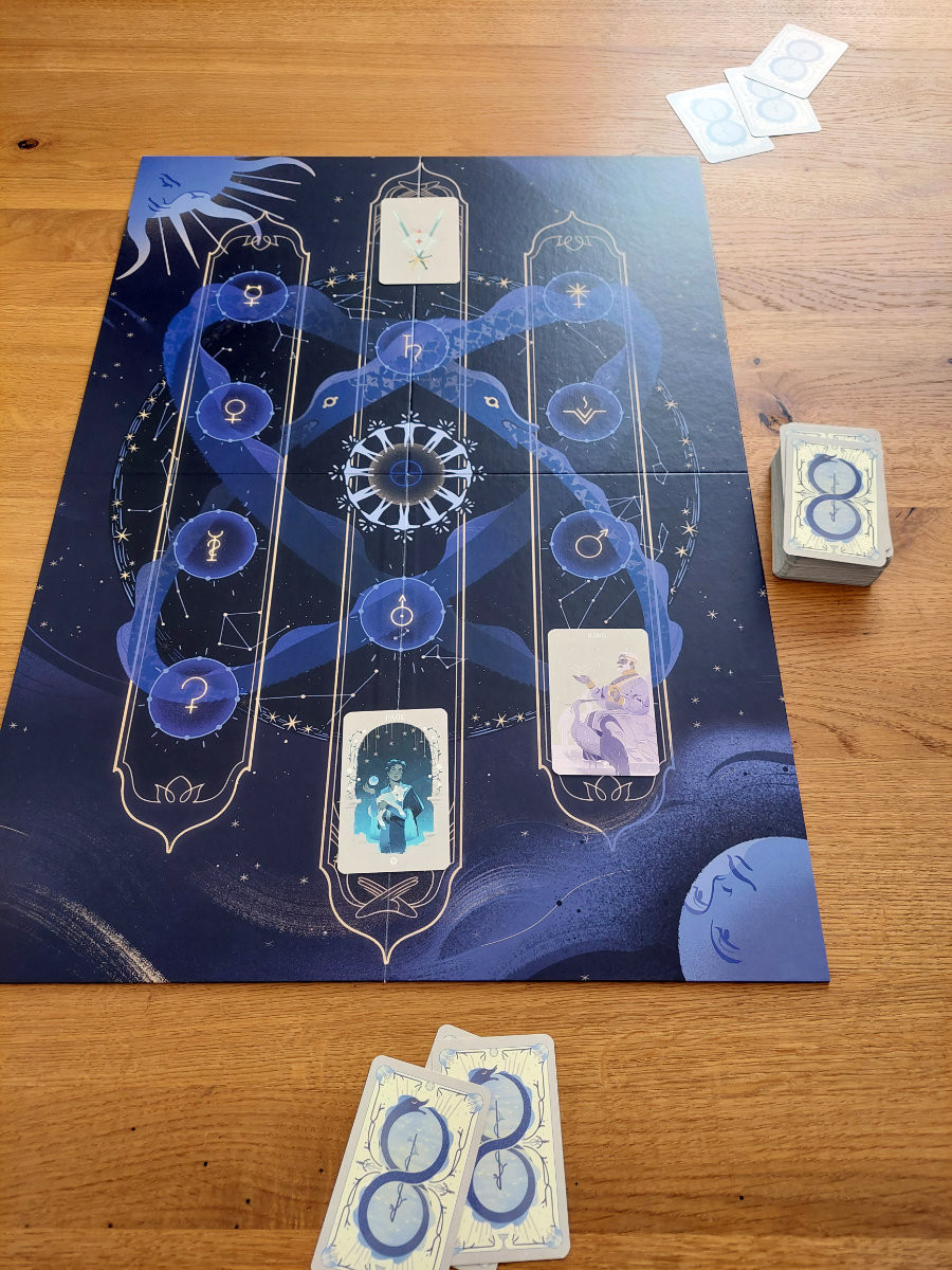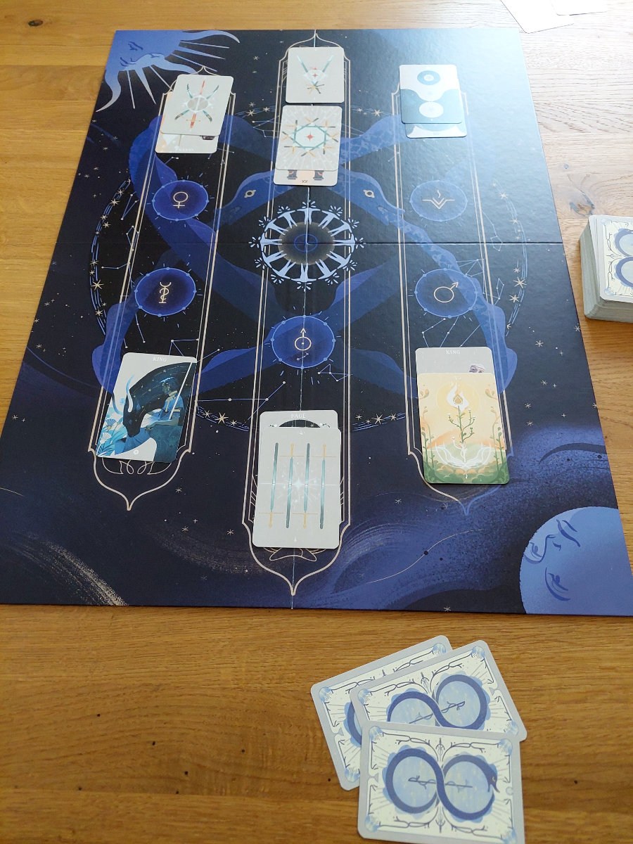 Das Spiel bietet vier Modi (Solitär, kooperativ, kompetitiv und Abenteuer-Modus) mit sehr schönem Spielmaterial. Die großen Tarotkarten werden auf dem Spielplan regelkonform – je nach Variante und Spielerzahl – abgelegt und nach ihren Wertigkeiten göttlich beurteilt.