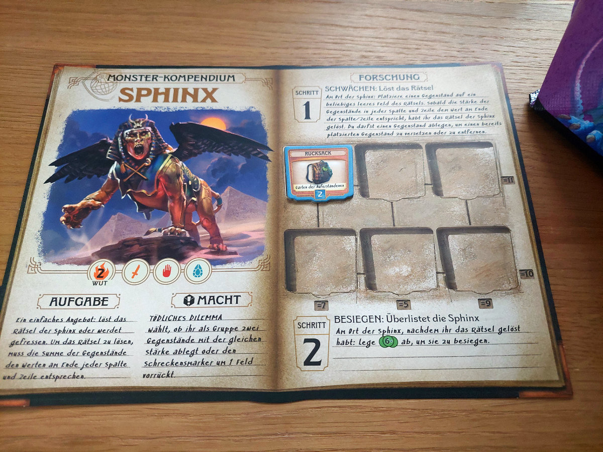 Ein Monster wird besiegt, indem die vorgegebene Aufgabe gelöst wird. Bei der Sphinx müssen es z.B. „grüne“ Gegenstände mit einem Mindestwert von (zusammen) 6 sein.