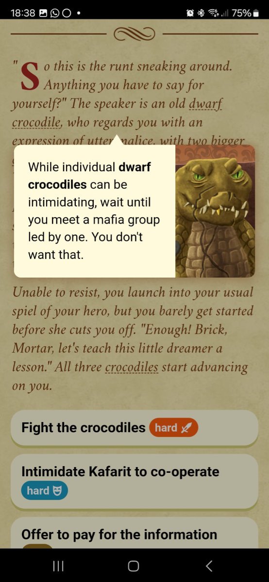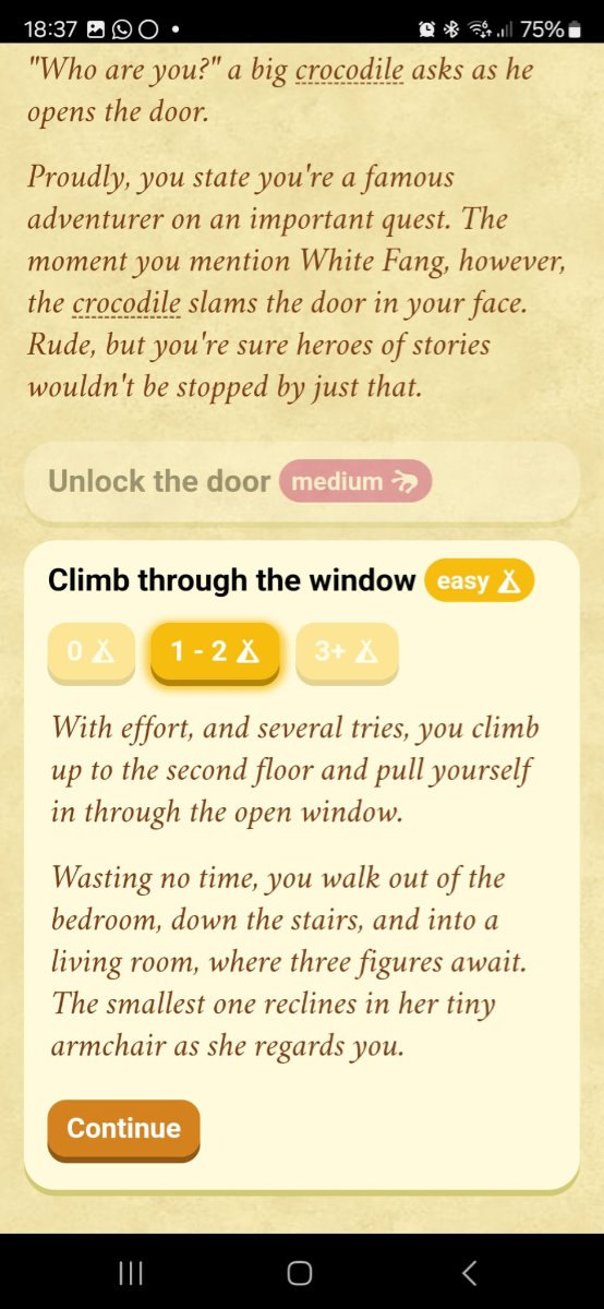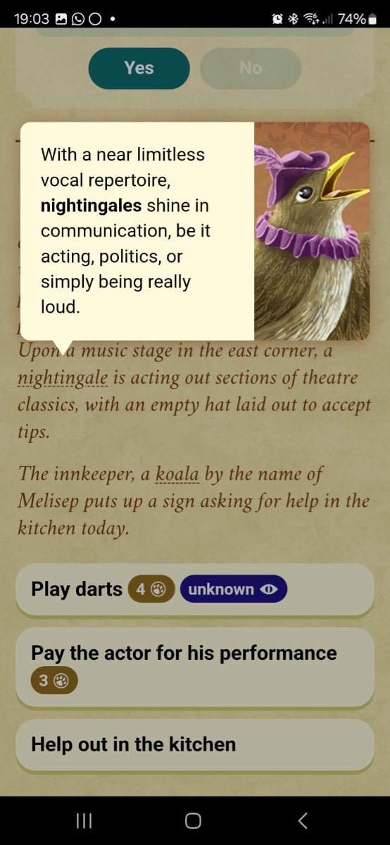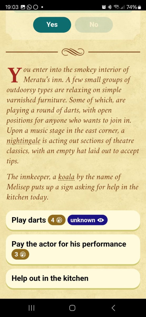 Auf jeden Fall kann man festhalten, dass es ein sehr schönes Spiel ist, das seinen Schwerpunkt absolut auf dem Erzählerischen liegen hat. Man muss sich im klaren sein, dass hier viel gelesen wird, auch wenn man selbst nicht an der Reihe ist und somit ergibt sich auch einiges an Wartezeit. Es ist natürlich spannend zu hören, was bei den anderen passiert und wie sie sich entwickeln, welche Entscheidungen sie treffen etc. Aber man sitzt derweil auf der solitär-multiplay-Bank. Die Geschichten sind dabei spannend und kurzweilig geschrieben, ab und an wiederholen sich aber Entscheidungsvorgaben und deren Konsequenzen. So mag man manchmal eben nicht auf einen Test eingehen und hofft auf einen anderen Ausgang, doch meist ist dann an der Stelle einfach nur der Zug zu Ende. Das ist schade und zieht einen etwas aus der Immersion. Sicherlich kann man bei dem enormen Umfang nicht für wirklich jedes Fitzelchen Varianten einbauen, aber statt dem Zugende vielleicht noch ein, zwei Alternativen und wenn es nur anders beschrieben wird^^.