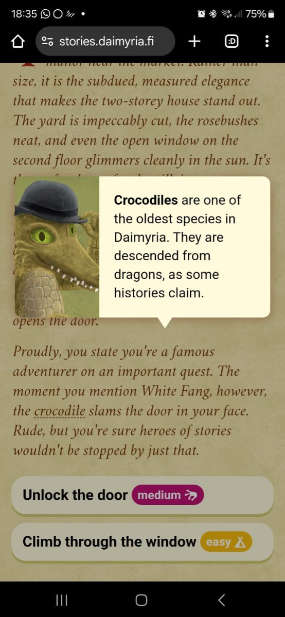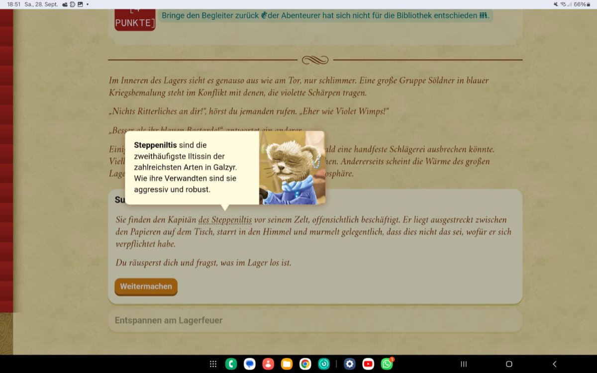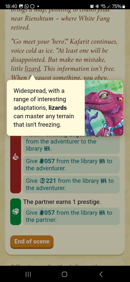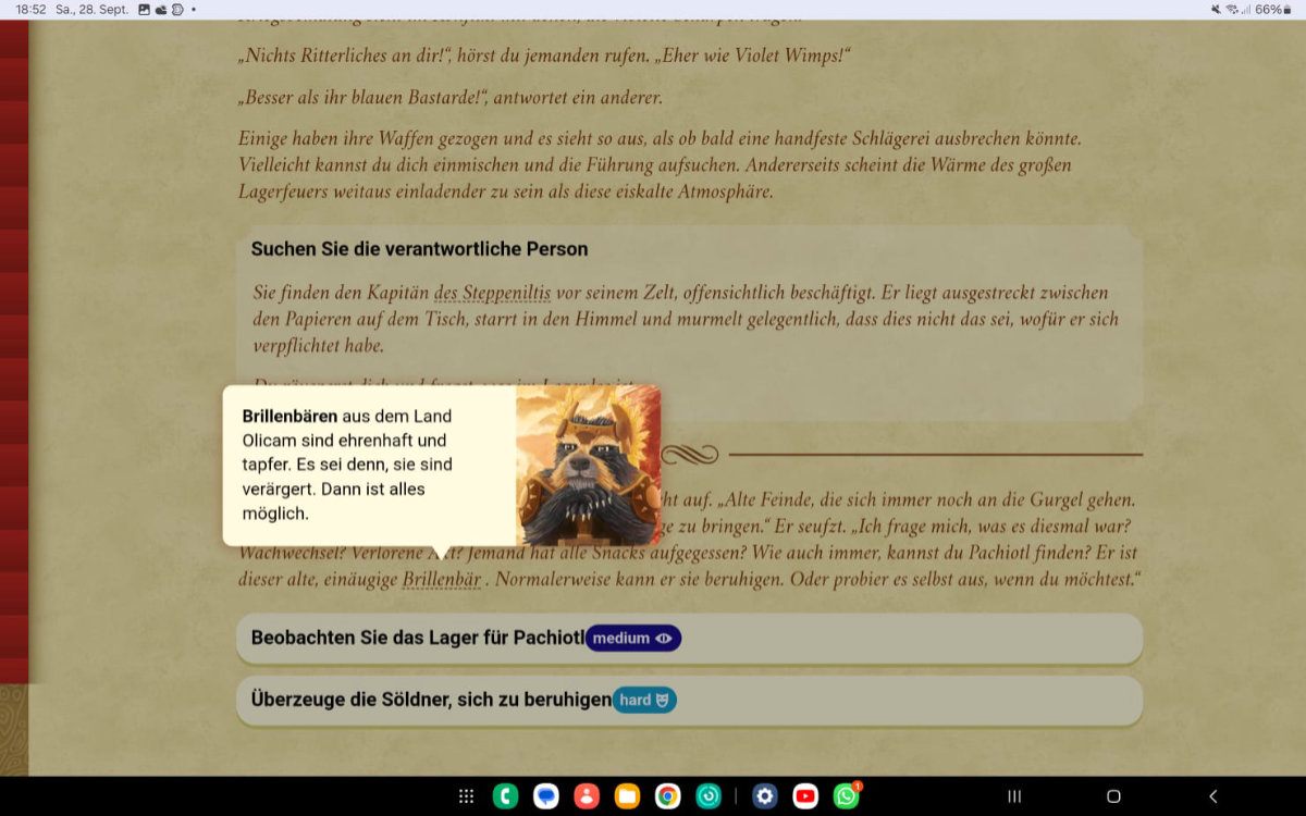 Via digitalem Geschichtenbuch werden die Spieler durch das Geschehen geleitet. So erleben sie die Abenteuer sehr immersiv, auch dank der Sprachausgabe. Charaktere und NPCs werden per Link im begleitenden Text hervorgehoben und zeigen ein Portrait derselben, wenn man darauf klickt.