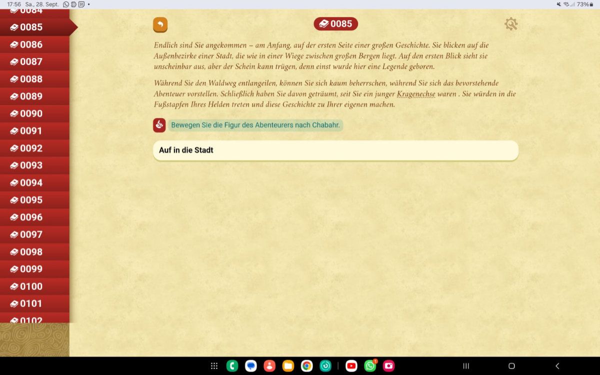 Im Spiel dann bewegen sich die Spieler über vorgegebene Wege von Ort zu Ort bzw. richten sich nach erzählten Vorgaben wohin sie sich begeben sollen, um bestimmte Aufgaben zu erfüllen. Mal trifft man irgendwo bestimmte Personen oder muss etwas liefern oder abholen. Es gibt reichlich Abwechslung bei den Aufgaben und alle sind sie mit ausführlichen Texten versehen.