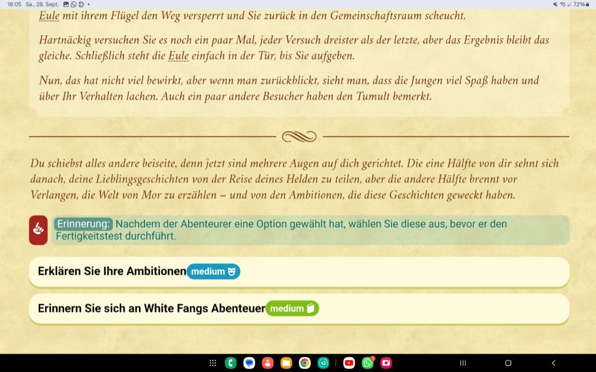All dies wird vornehmlich durch die App (digitales Storybook, abrufbar u.a. per Website) übernommen. Dort wird jeglicher Text angezeigt und die Entscheidungen verwaltet.