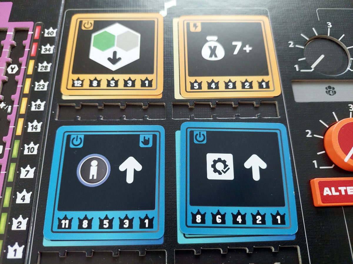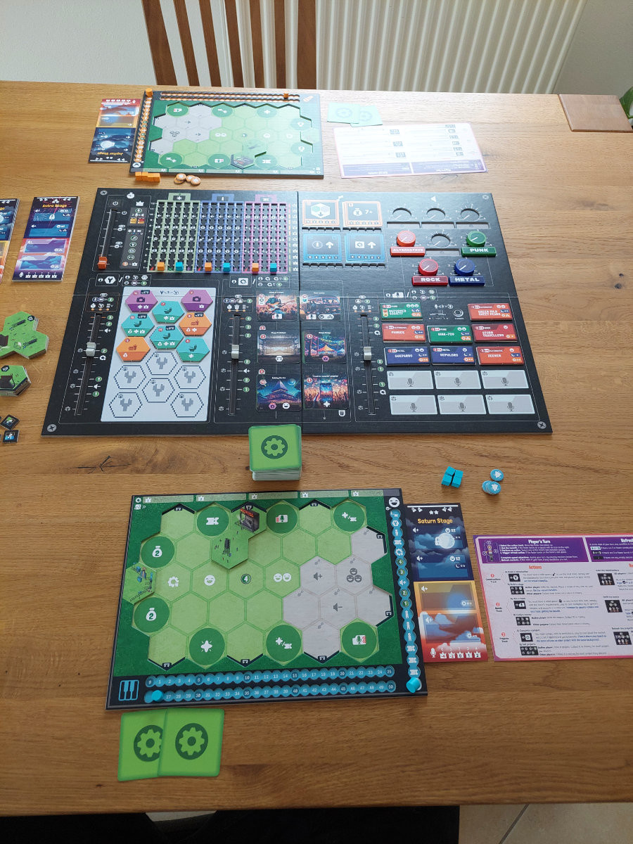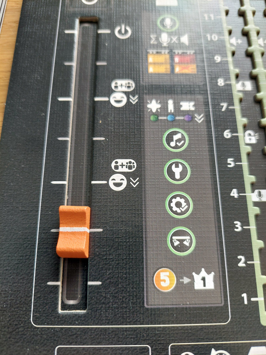 Das Spiel bot reichlich Unterhaltung und Kurzweil und kann von der KS-Kampagne nur noch profitieren – mehr von allem^^. Es gab zwar keine direkte Interaktion, aber das Mitverfolgen der Fortschritte der anderen und dem gemeinsamen Agieren an den Mischpult-Fadern (jede Aktion lässt einen solchen hochgleiten und wenn dieser am Ende ankommt, wird der Bereich resettet und der Master-Regler wandert dem Spielende entgegen), gibt dennoch ein entsprechendes Gefühl. Auch die Besetzung war spielmotivierend egal, da es gleich gut mit 2en und 4en funktionierte.
