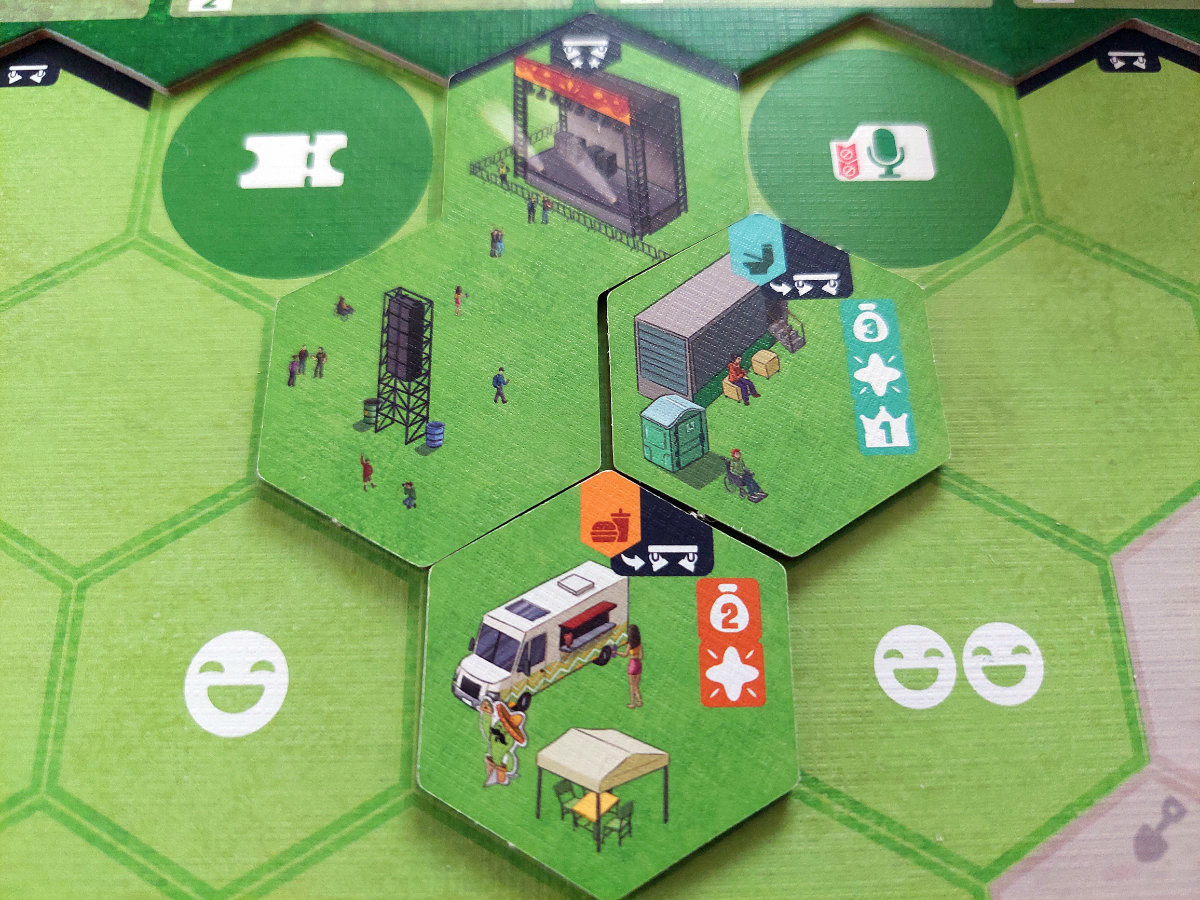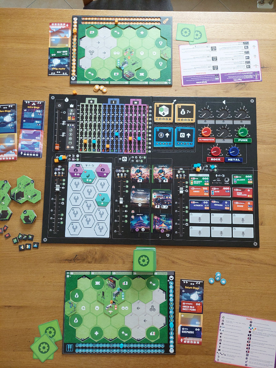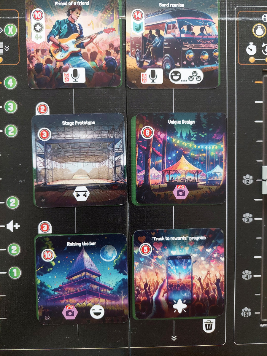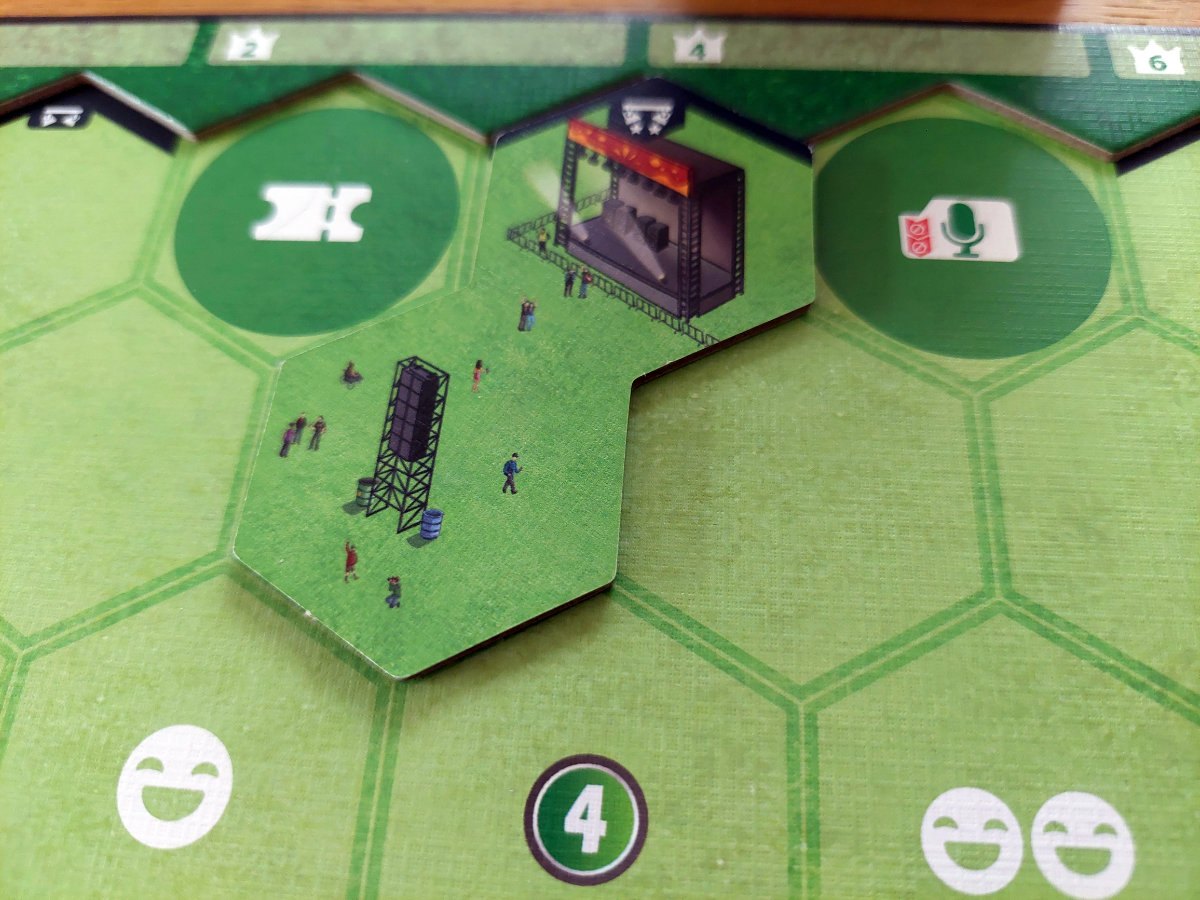 Während des Spiels gilt es abwechselnd Aktionen des Hauptspielplans zu nutzen, indem dort für neue Konstruktionen gesorgt wird, z.B. WC-Anlagen, Imbissbuden oder Fotostände und natürlich Bühnen. Ferner können hier die Bands rekrutiert und Auftragskarten sowie spezielle „Missionen“ absolviert werden. Die Bühnen werden nach Legespiel-Art auf den Spielertableaus arrangiert und erst, wenn man auf der Besucherleiste entsprechend vorangekommen ist, darf man dann auch den Platz vergrössern – es darf im Matschbereich gebaut werden^^.