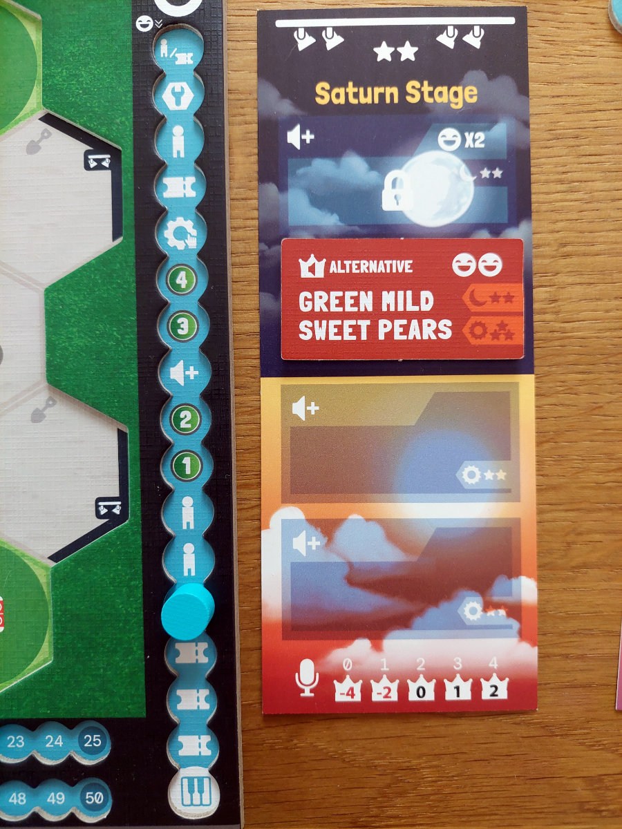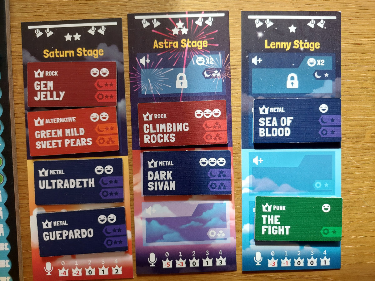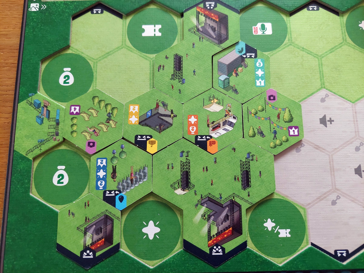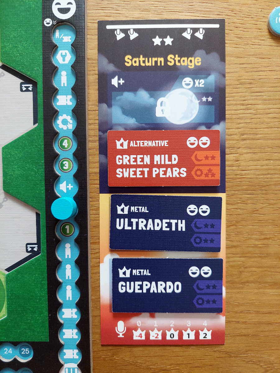 Während des Spiels gilt es abwechselnd Aktionen des Hauptspielplans zu nutzen, indem dort für neue Konstruktionen gesorgt wird, z.B. WC-Anlagen, Imbissbuden oder Fotostände und natürlich Bühnen. Ferner können hier die Bands rekrutiert und Auftragskarten sowie spezielle „Missionen“ absolviert werden. Die Bühnen werden nach Legespiel-Art auf den Spielertableaus arrangiert und erst, wenn man auf der Besucherleiste entsprechend vorangekommen ist, darf man dann auch den Platz vergrössern – es darf im Matschbereich gebaut werden^^.