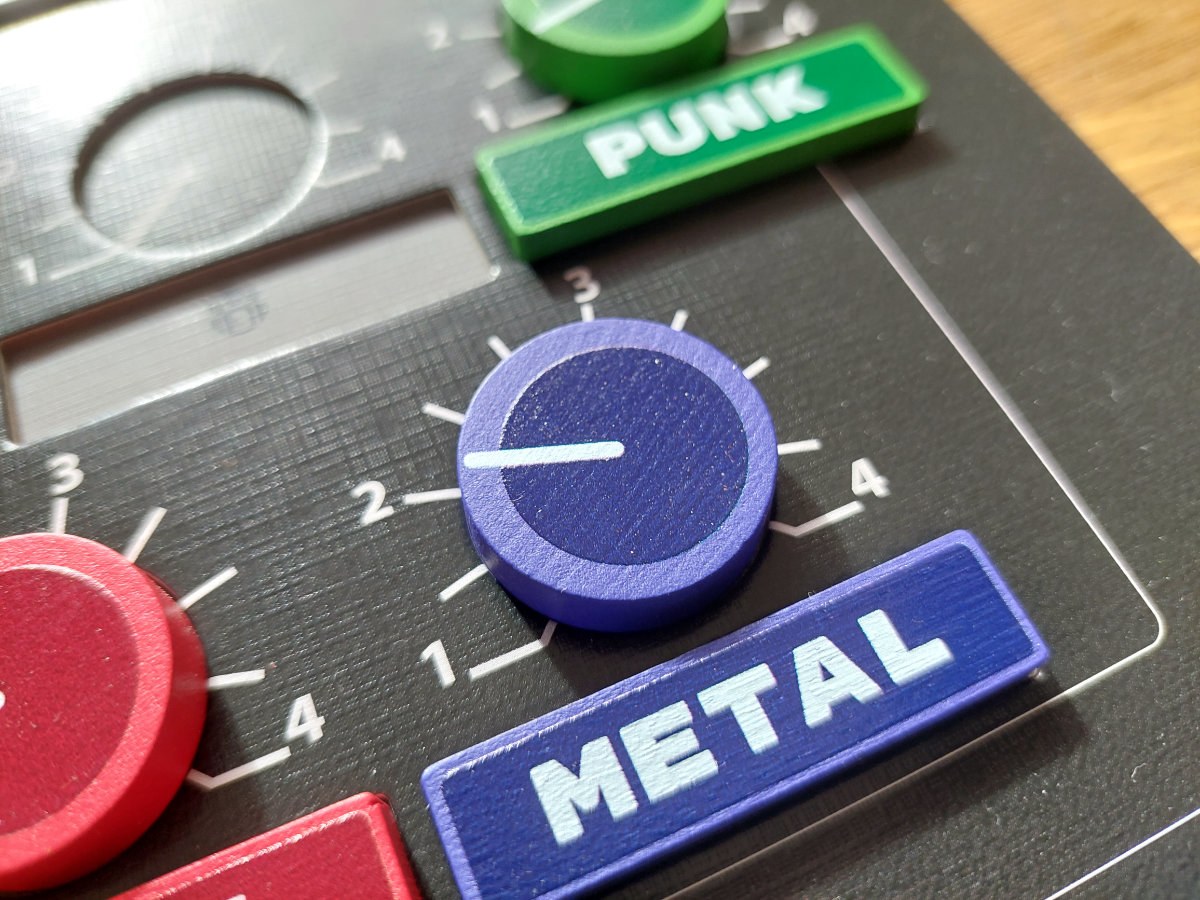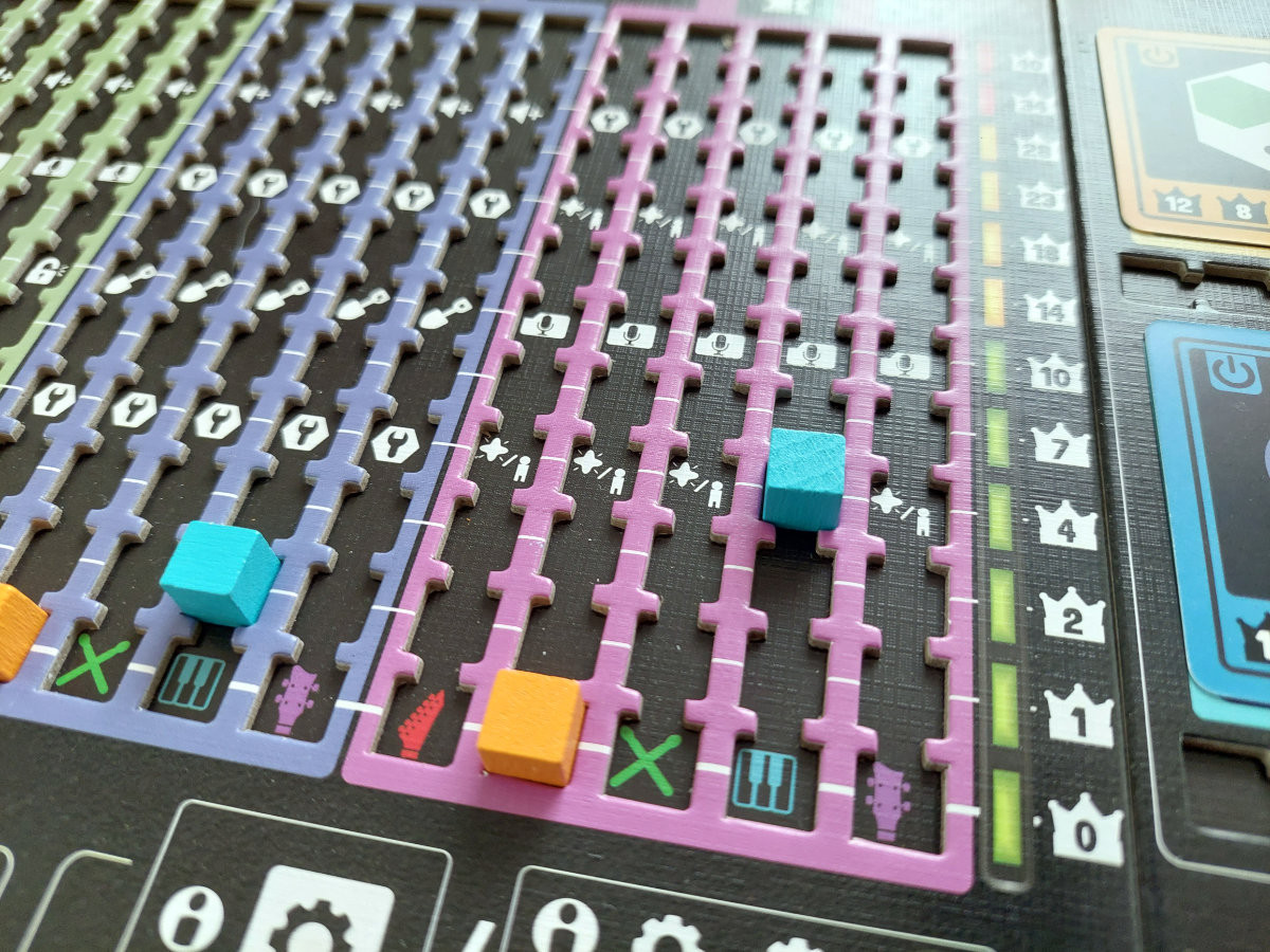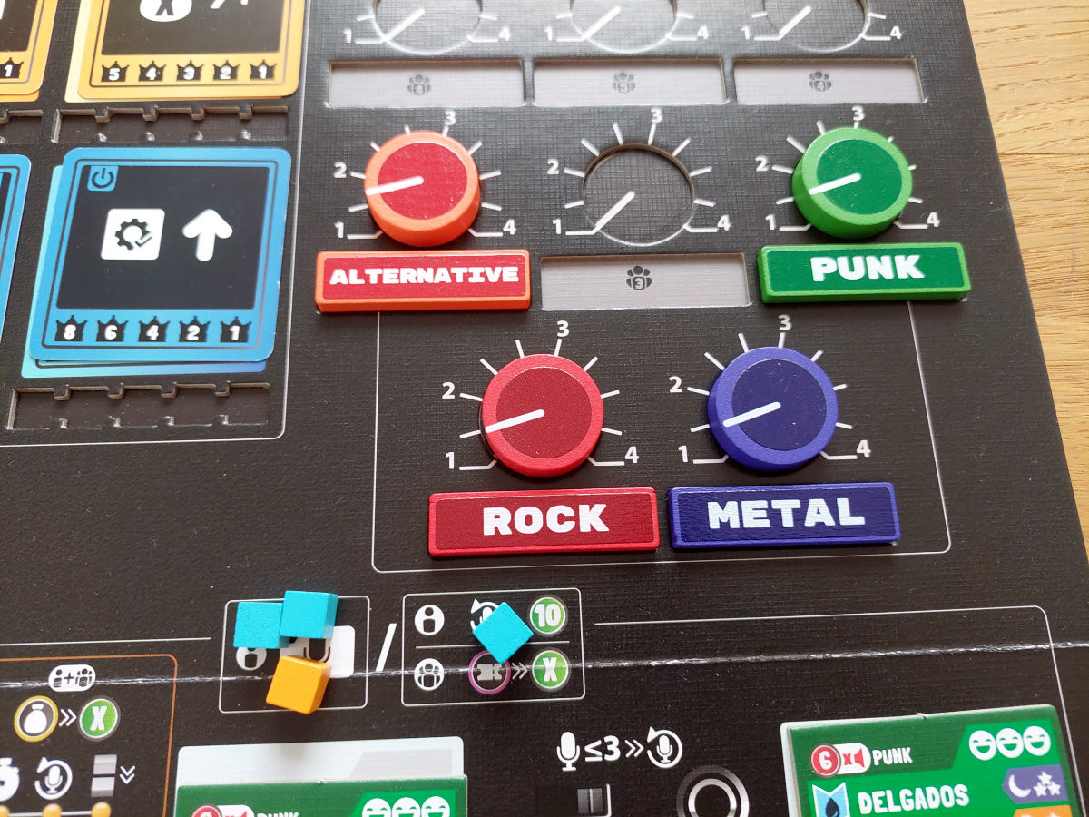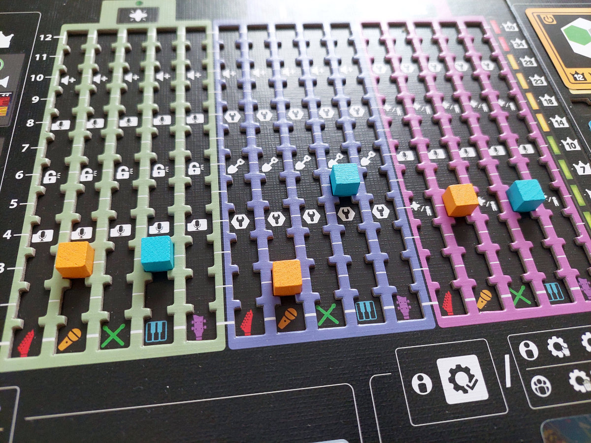 Als allererstes fällt das Design auf. Alle Spieltafeln und Leisten wurden dem musikalischen Thema angepasst. So ähneln die Leisten für die Annehmlichkeiten, Besucherzahl und Ticketpreise einem Großmischpult. Der Bekanntheitsgrad der Bands wird mit Lautstärkereglern dargestellt und der Zeitverlauf durch einen Masterregler. Auch die Aktionsleisten entsprechen Mischpult-Fadern, alles ziemlich cool. Und das ist nur der Prototyp, der aber schon richtig gut aussieht und auch die zu erwartende Wertigkeit aufzeigt. Ein paar Kleinigkeiten passen noch nicht haargenau bei den double-layer-Leisten und einige kleine Nicklichkeiten in der Anleitung, aber dies wurde alles laut Aussage des Autors schon aufgedeckt und wird bearbeitet.