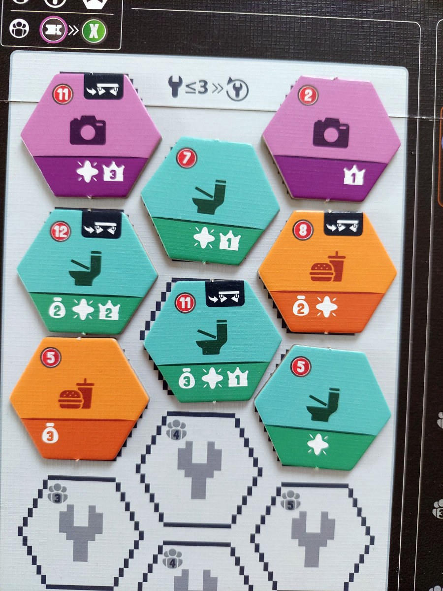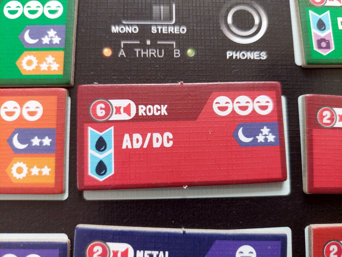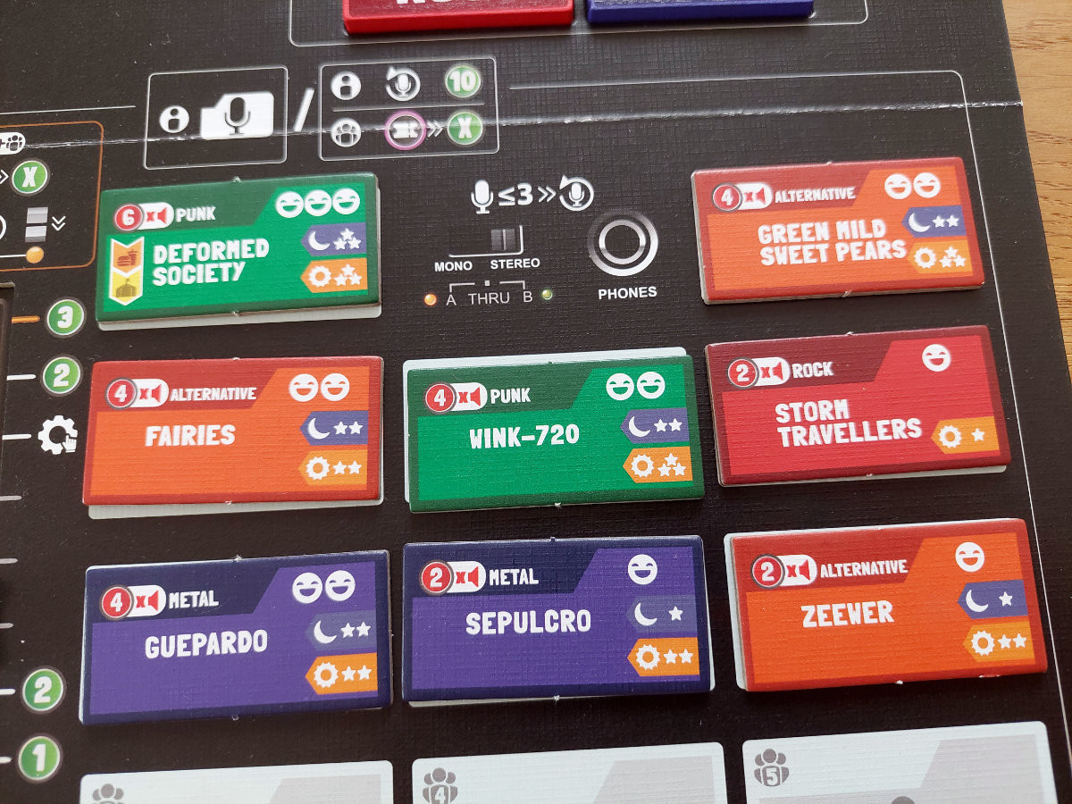 „FS“ bietet verschiedene Mechaniken, wie z.B. Legespiel und Drafting. Viele Aktionen verzahnen sich auch miteinander und so gibt es Partie-weise immer neue Taktikmöglichkeiten. Sehr cool gelöst ist auch die Band- und damit Musikauswahl. Anstatt teuren Lizenzen hinterher zu laufen oder die Spieler in ihrer Wunschauswahl einzuschränken, wurden hier Musikgenres involviert (EDM, Hip Hop/RAP, Rock, Metal, Country, Alternative, Pop, Punk) und den Bands (teils lustige) Fantasy-Namen gegeben, wobei einem die meisten doch gleich bekannt vorkommen^^. Auch wird es die Option geben, selbst Namen von Bands zu integrieren (vermutlich durch Blanko-Plättchen).