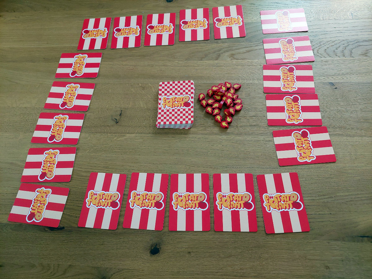 Jeder Spieler erhält 5 Karten, die er sich anschauen darf und verdeckt vor sich ablegt. Wer mehr Kartoffelkarten auf der Hand hat, gehört (zunächst) zur Kartoffelfraktion, dito wer mehr Tomatenkarten hat.