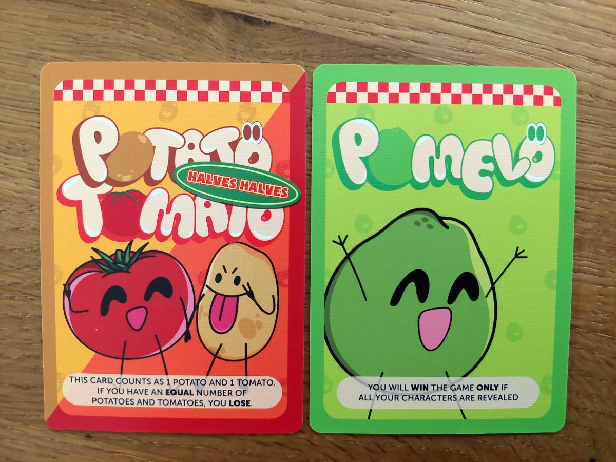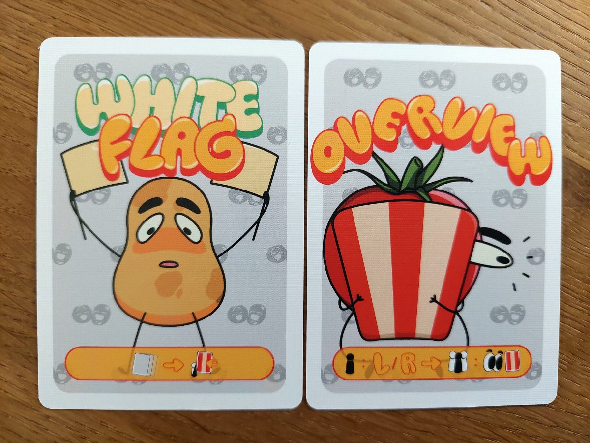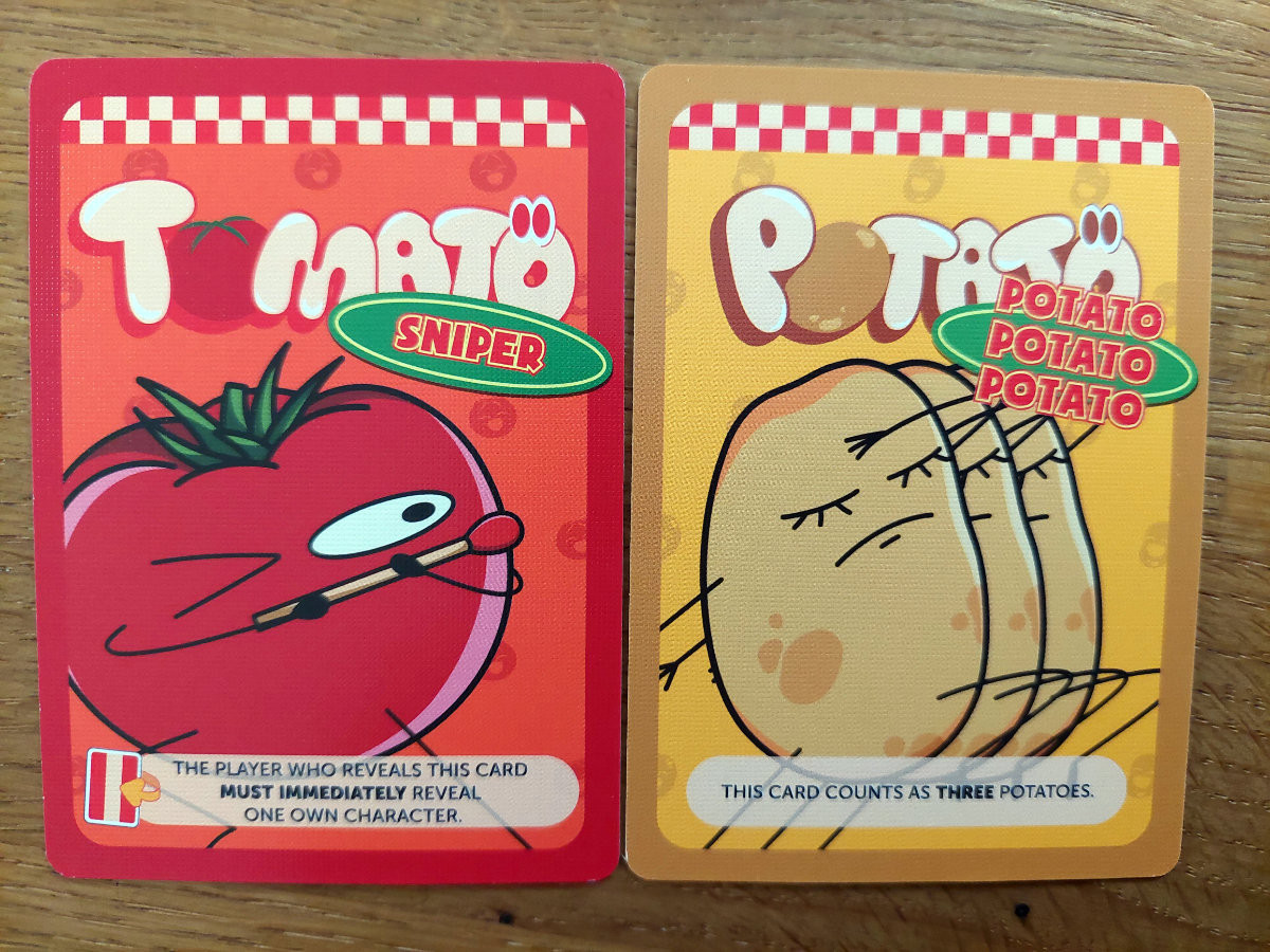 Zur Vorbereitung gehört, dass sich die Spieler entscheiden, ob sie mit den normalen Karten spielen wollen oder mit speziellen Charakterkarten. Dann müssen für jede spezielle Karte je eine Tomaten- oder Kartoffelkarte weggetauscht werden. Diese besonderen Charaktere bringen mehr Abwechslung ins Spiel und haben allesamt lustig-fiese Effekte, die auf der Rückseite der Anleitung übersichtlich gelistet werden.