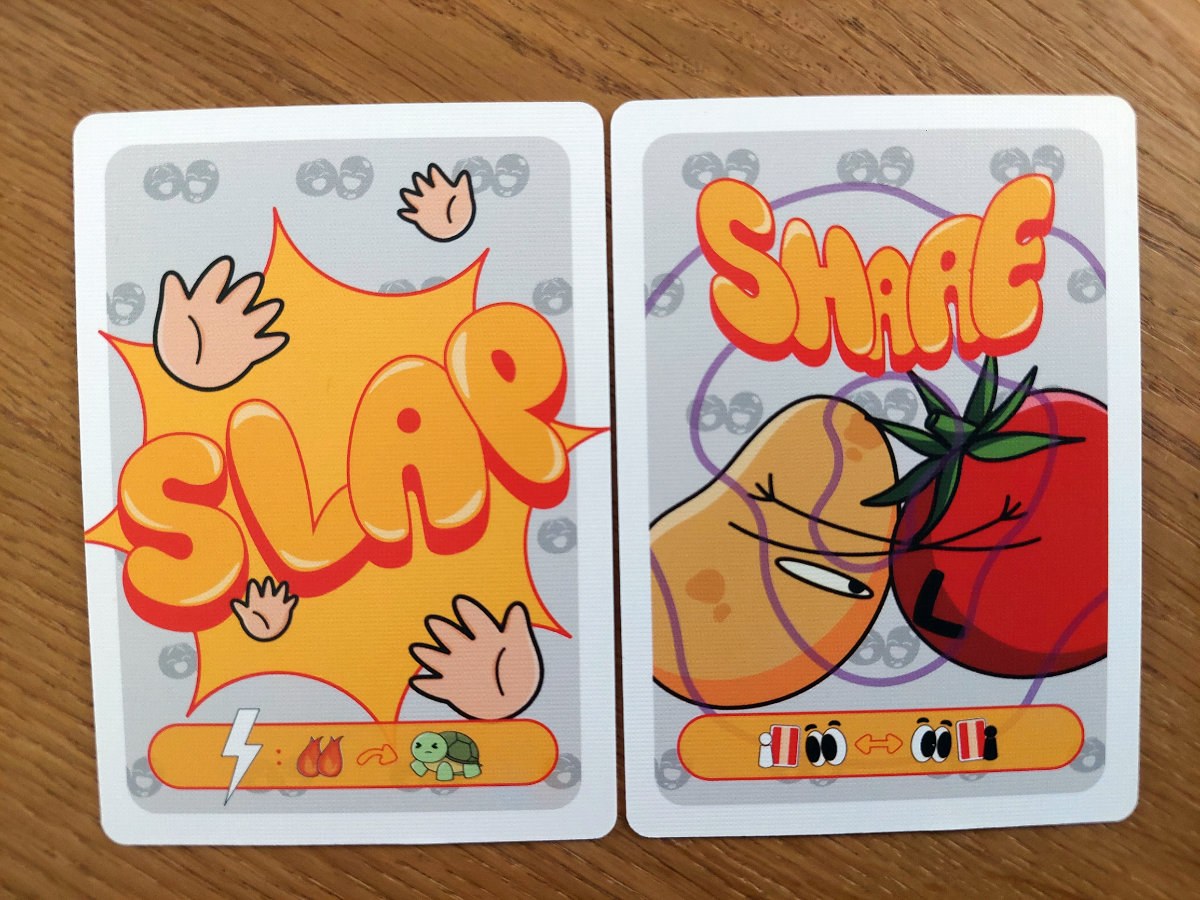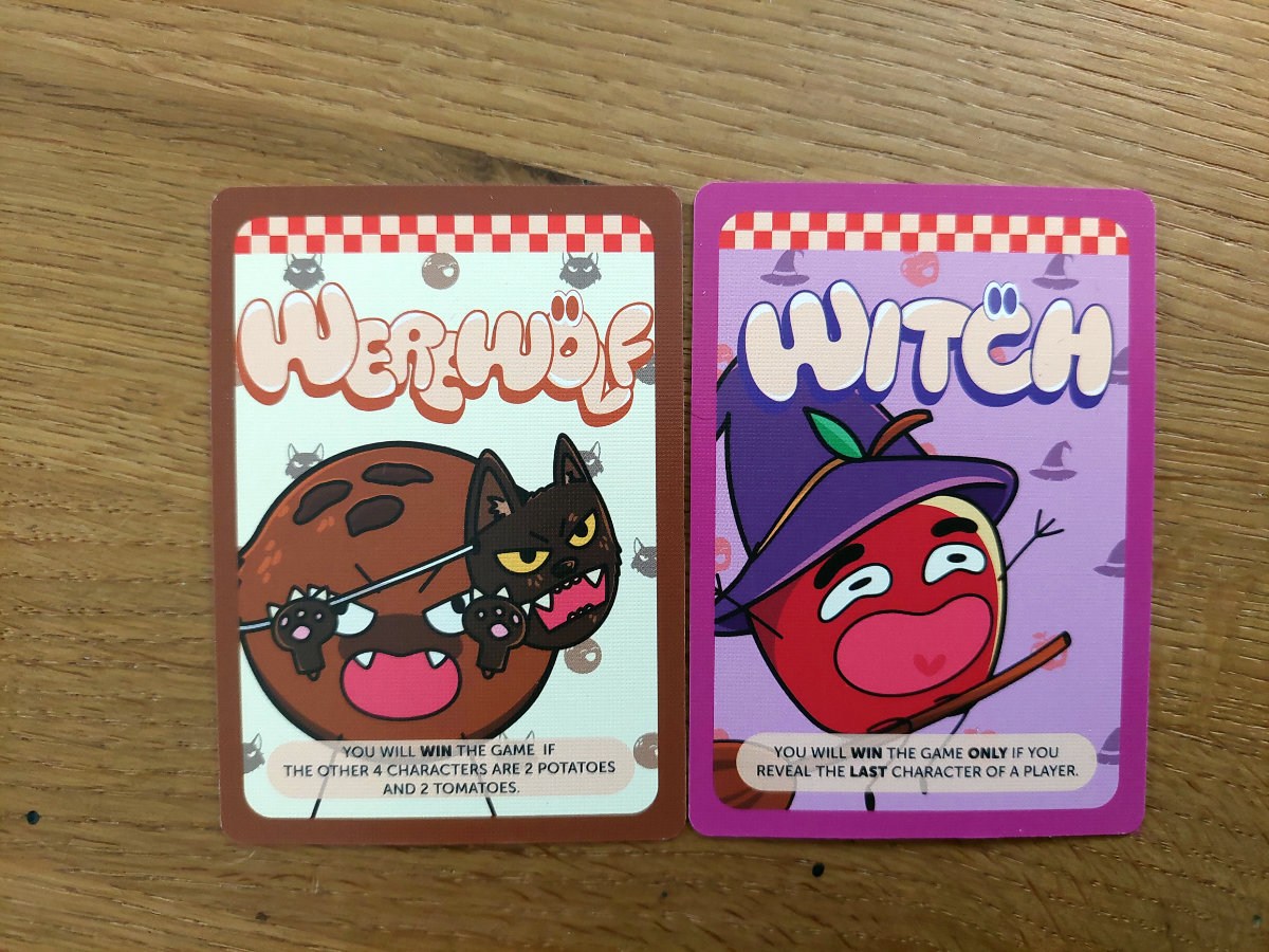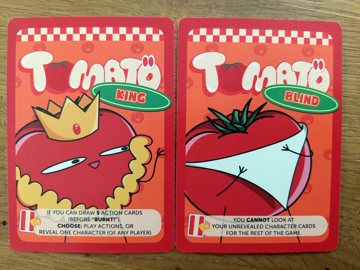 Zur Vorbereitung gehört, dass sich die Spieler entscheiden, ob sie mit den normalen Karten spielen wollen oder mit speziellen Charakterkarten. Dann müssen für jede spezielle Karte je eine Tomaten- oder Kartoffelkarte weggetauscht werden. Diese besonderen Charaktere bringen mehr Abwechslung ins Spiel und haben allesamt lustig-fiese Effekte, die auf der Rückseite der Anleitung übersichtlich gelistet werden.