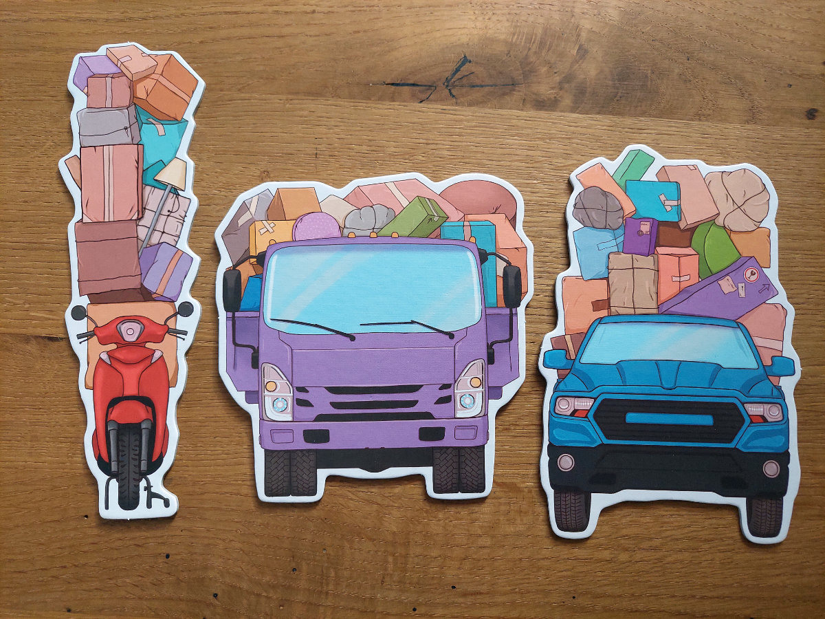 Im Spiel nun wird dies nachempfunden und die Spieler sollen umziehen. Dabei helfen ihnen Freunde und Bekannte und hilfswillige Passanten^^. Jedem stehen drei Fahrzeuge (Motorrad, PKW, LKW) zur Verfügung, die aber allesamt einen vorgegebenen Platz für die Umzugskartons und Helfer haben. Daran muss sich strikt gehalten werden, sonst hagelt es am Ende Minuspunkte.