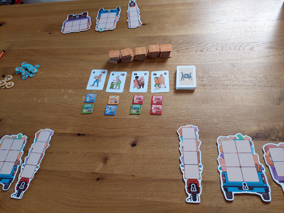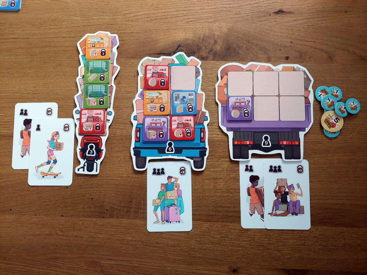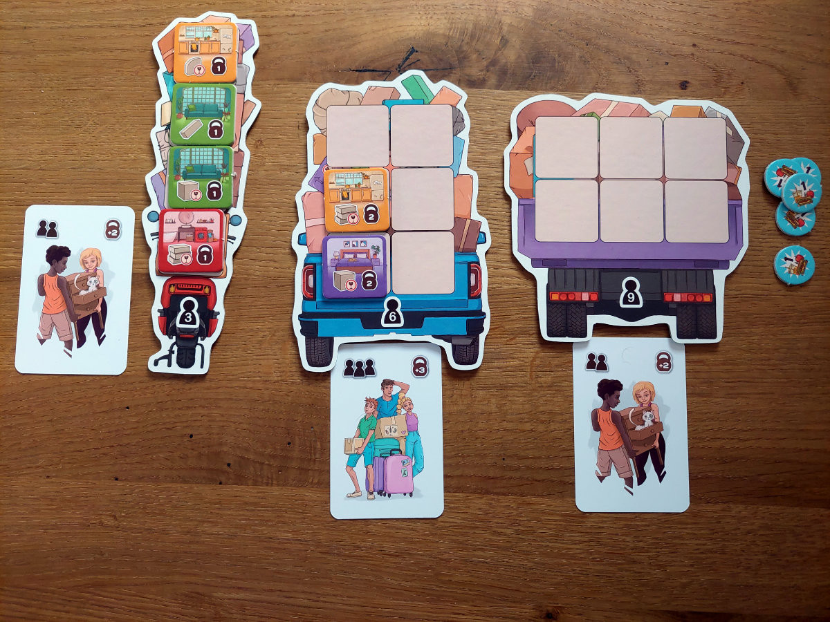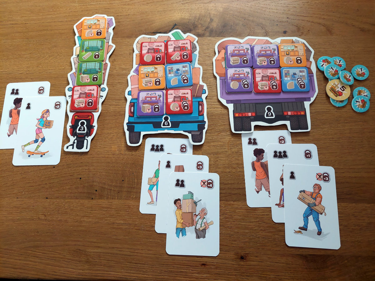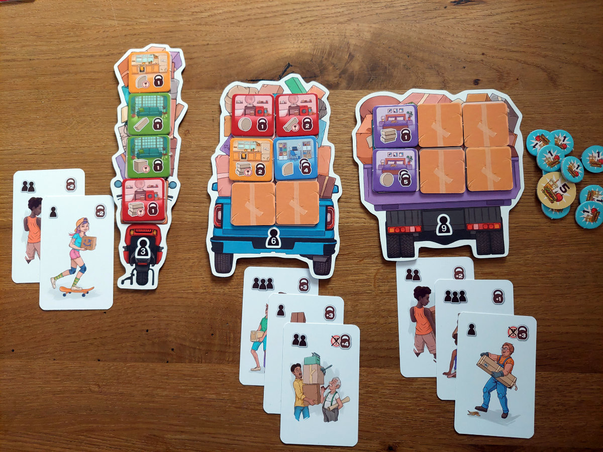 Die zugehörigen Spieltafeln, die jeder vor sich liegen hat, zeigen dementsprechend Felder zum Ablegen der Kartons an und per Zahlenaufdruck wie viele Helfer jeweils mitfahren dürfen.