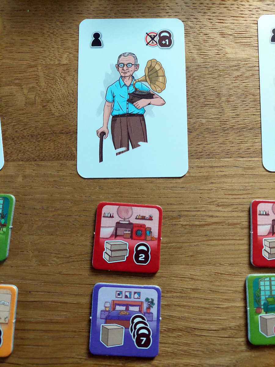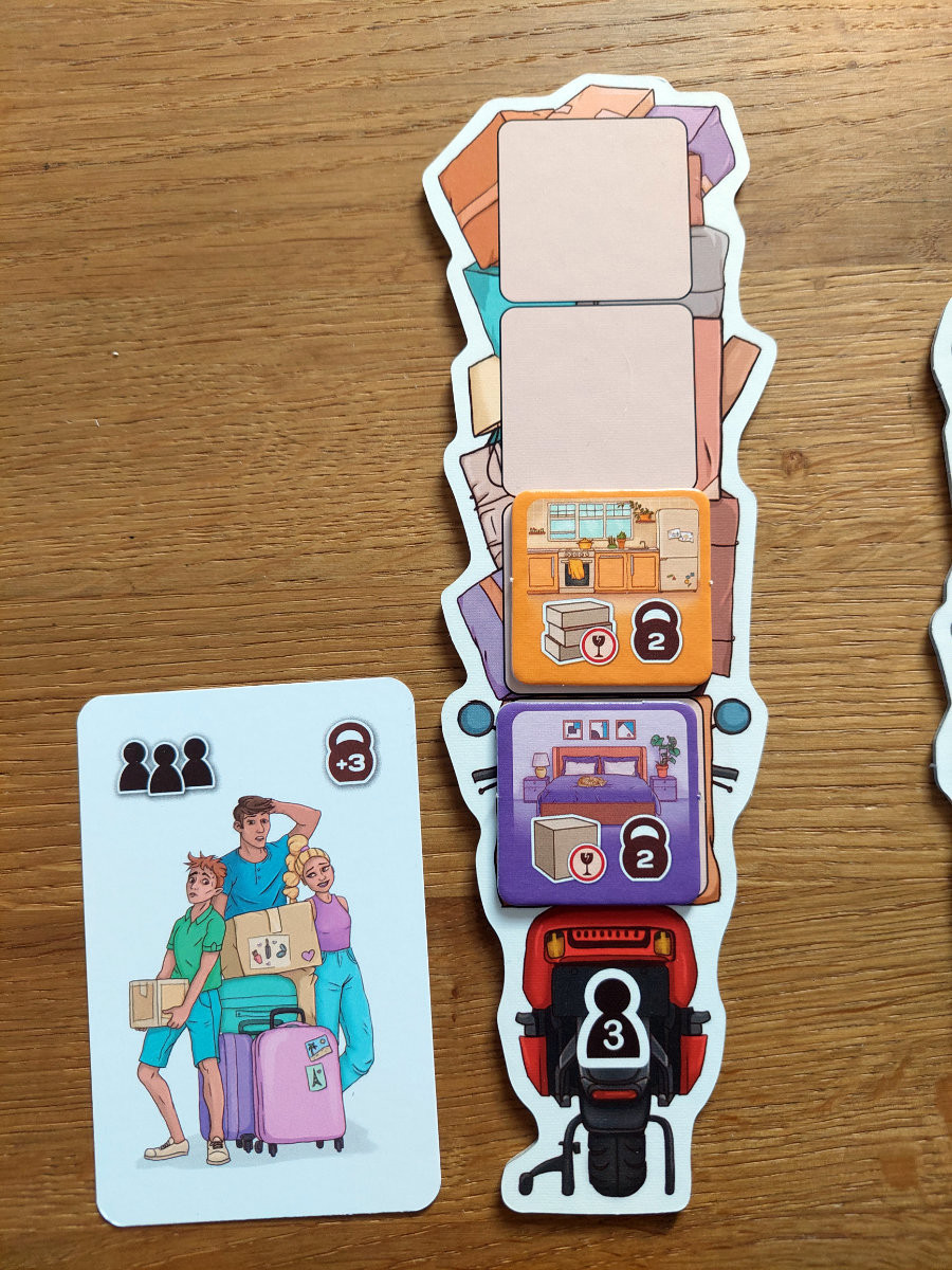 In seinem Zug nimmt sich der Spieler immer eine Kombination aus 2 Kartonplättchen und 1 Helferkarte. Die legt er nun nach Gutdünken bei sich aus, sollte aber die diversen Punkteregeln beachten. Es dürfen eben nur so viele Helfer pro Fahrzeug, wie vorgegeben, ausliegen. Tollpatschige Helfer sollten möglichst keine zerbrechlichen Kartons tragen (diese werden kaputtgehen und bringen damit keine Punkte ein) und schwere Kartons (auf allen steht die Gewichtszahl) werden leichtere Kartons unter sich „begraben“! Gelegentlich zu erhaltene Stärkungs-Snacks helfen hierbei dezent aus.