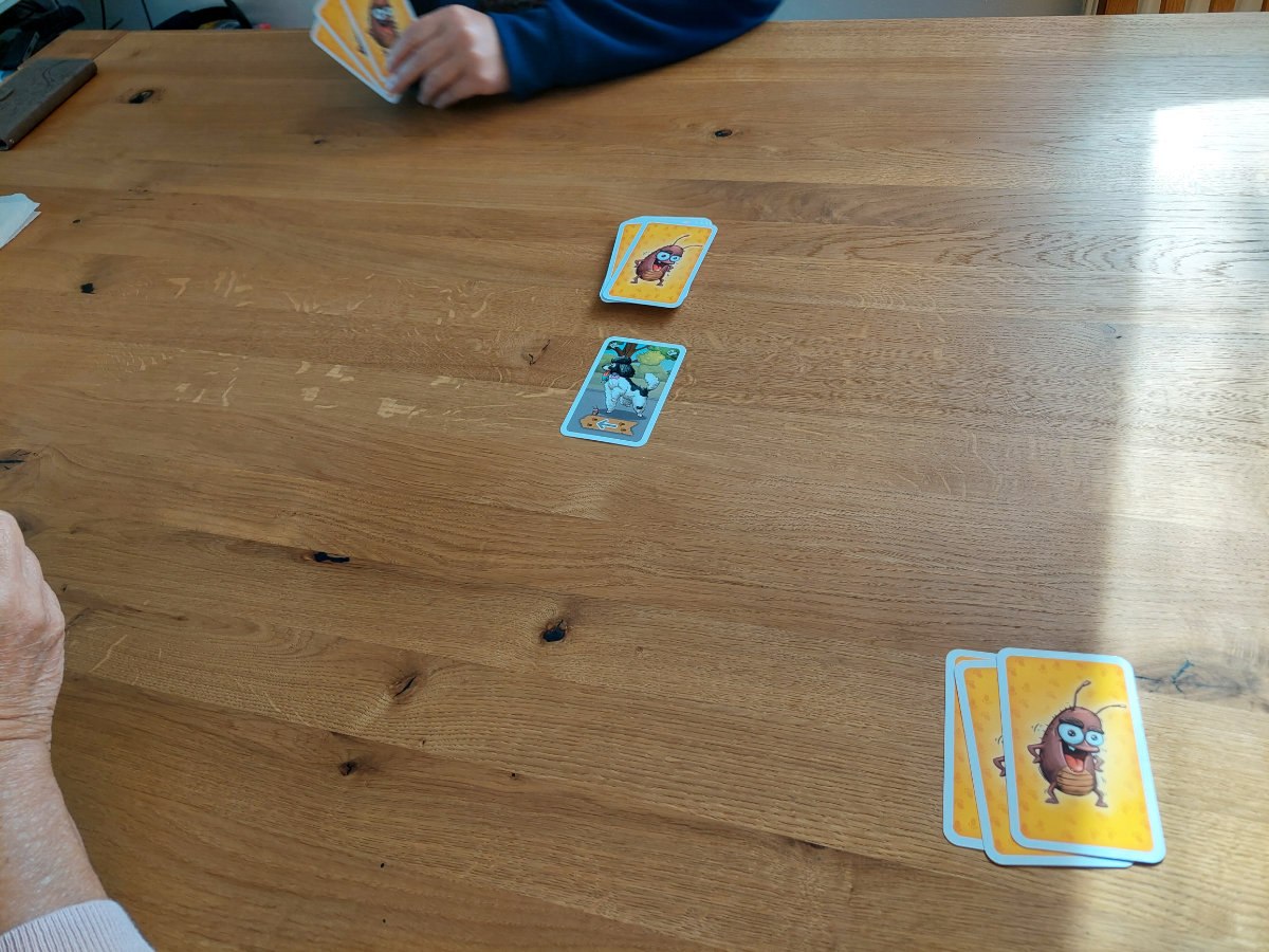 Muss nun aber eine Karte ausgespielt werden, deren Farbe in der Auslage schon vertreten ist, wird die Karte auf diese ausliegende Karte gelegt. Erneut muss hier dann auf den Pfeil geachtet werden und hoffentlich konnte man so geschickt „planen“, dass der Pfeil ins Nichts gerichtet ist.