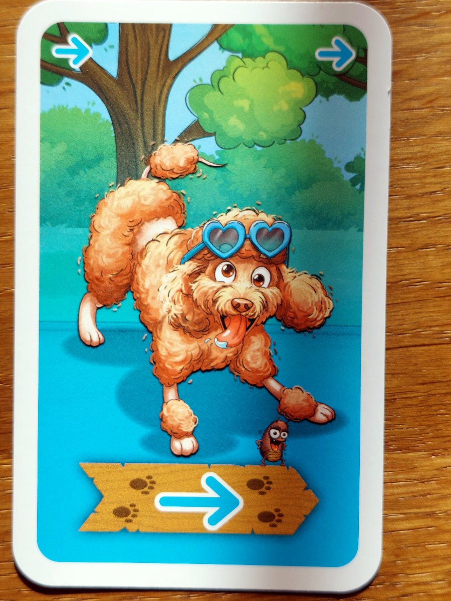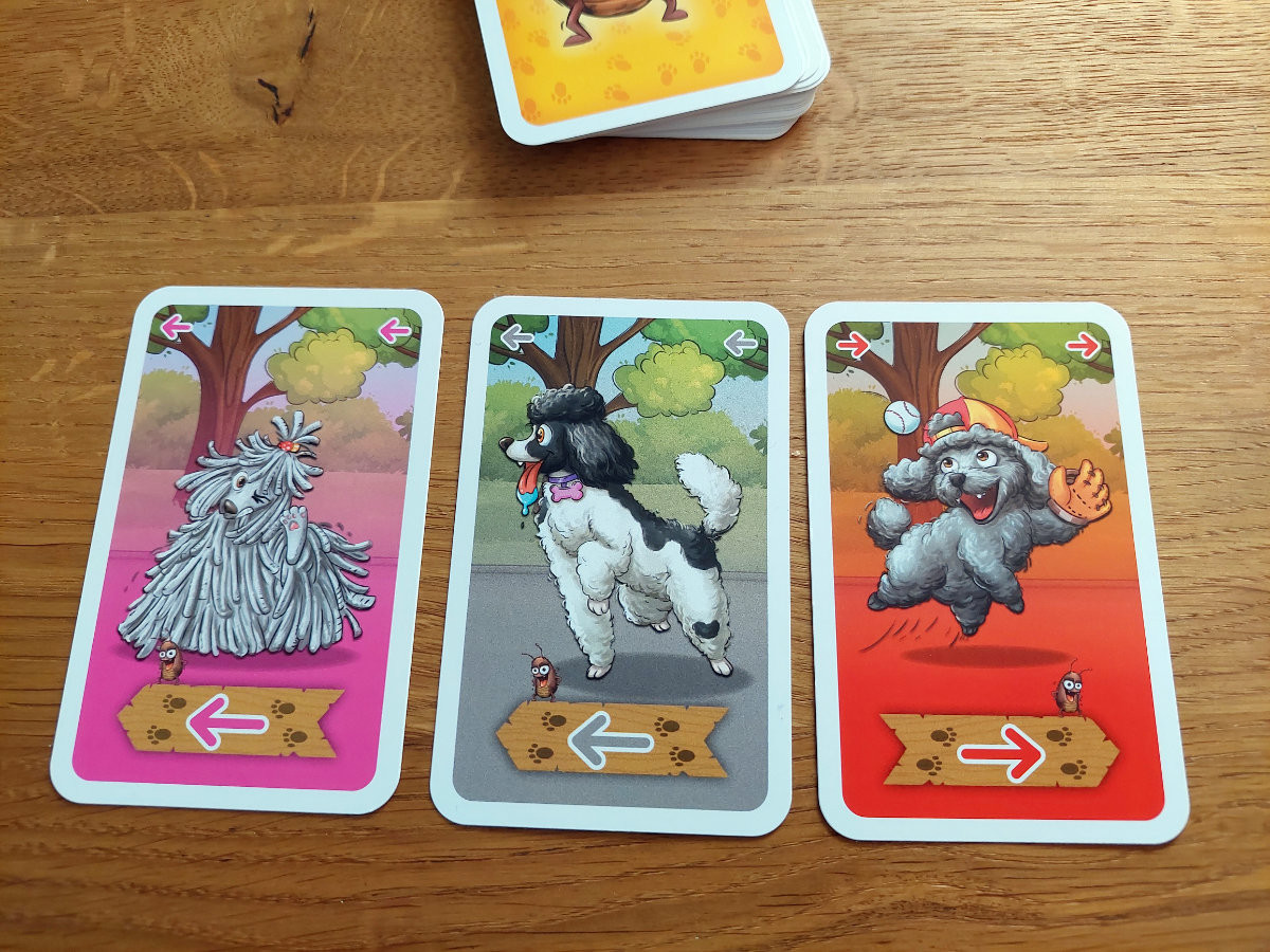 Dementsprechend wollen die Spieler ihre Karten so ausspielen, dass sie die Flöhe los werden. Dies geschieht an sich ganz simpel, indem eine Karte an die offene Auslage angelegt wird. Die Kartenauslage zeigt dabei Pudel in bis zu acht verschiedenen Kartenfarben und so lange die ausgespielte Karte mit keiner schon ausliegenden Farbe übereinstimmt, kann man die Karte beliebig links oder rechts der Auslage ablegen. Doch aufgepasst, die Pudelkarten haben auch allesamt einen Pfeil, der nach links oder rechts zeigt! Der bedeutet nämlich, dass man alle Karten die neben der Pfeilrichtung liegen, nehmen muss – dies sind Flöhe, die es „geschafft“ haben und am Ende Minuspunkte zählen. Entsprechend sollte also z.B. eine Karte mit einem nach rechts deutenden Pfeil tunlichst rechts der Auslage angelegt werden, damit diese(r) ins Leere zeigt.