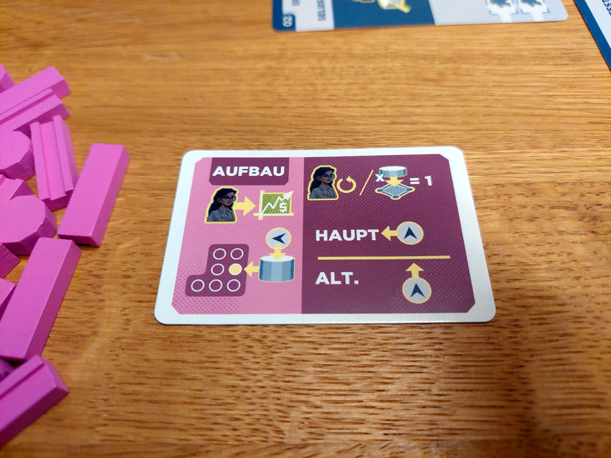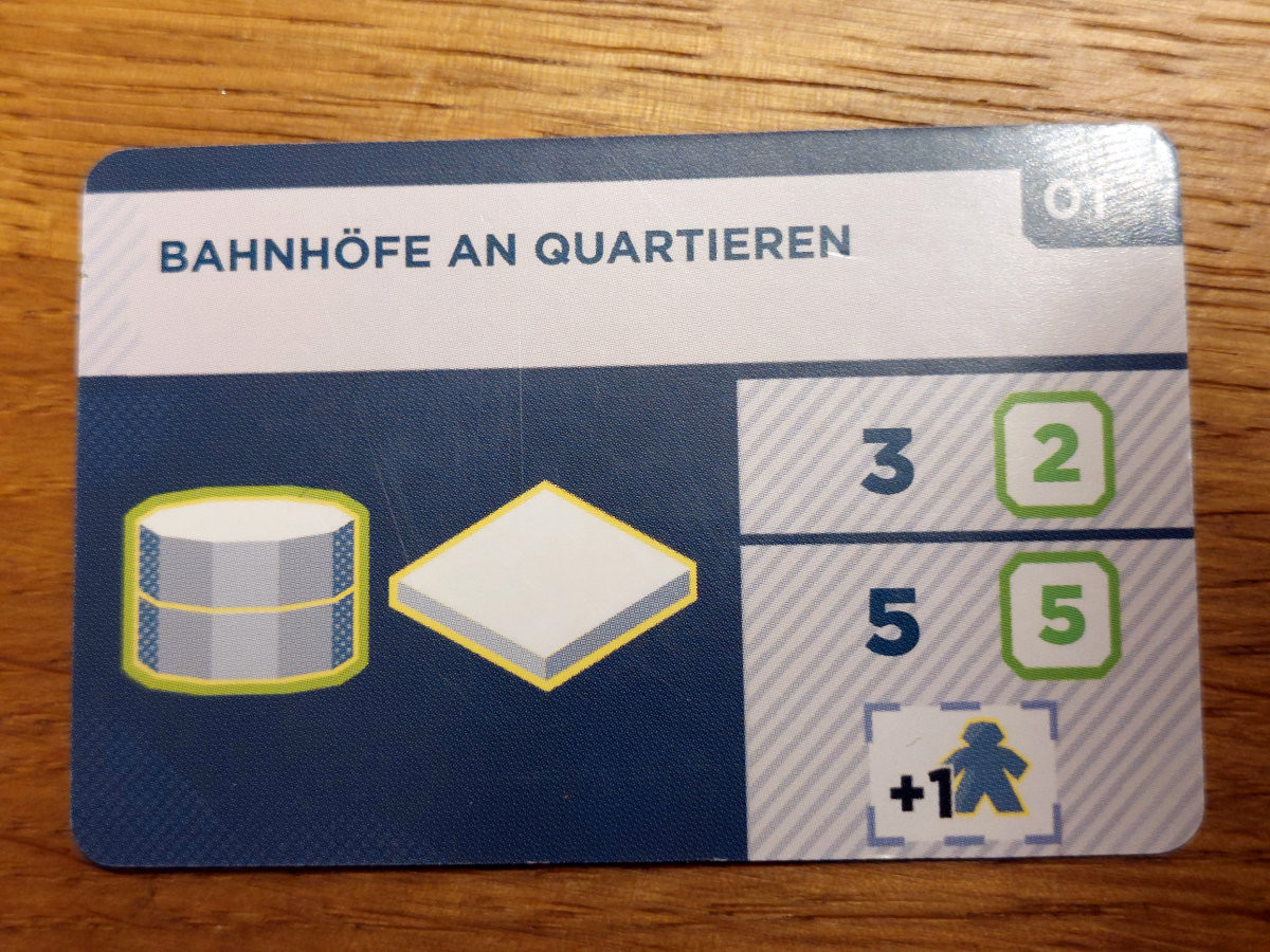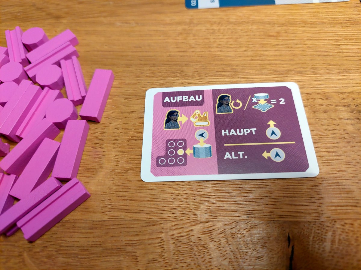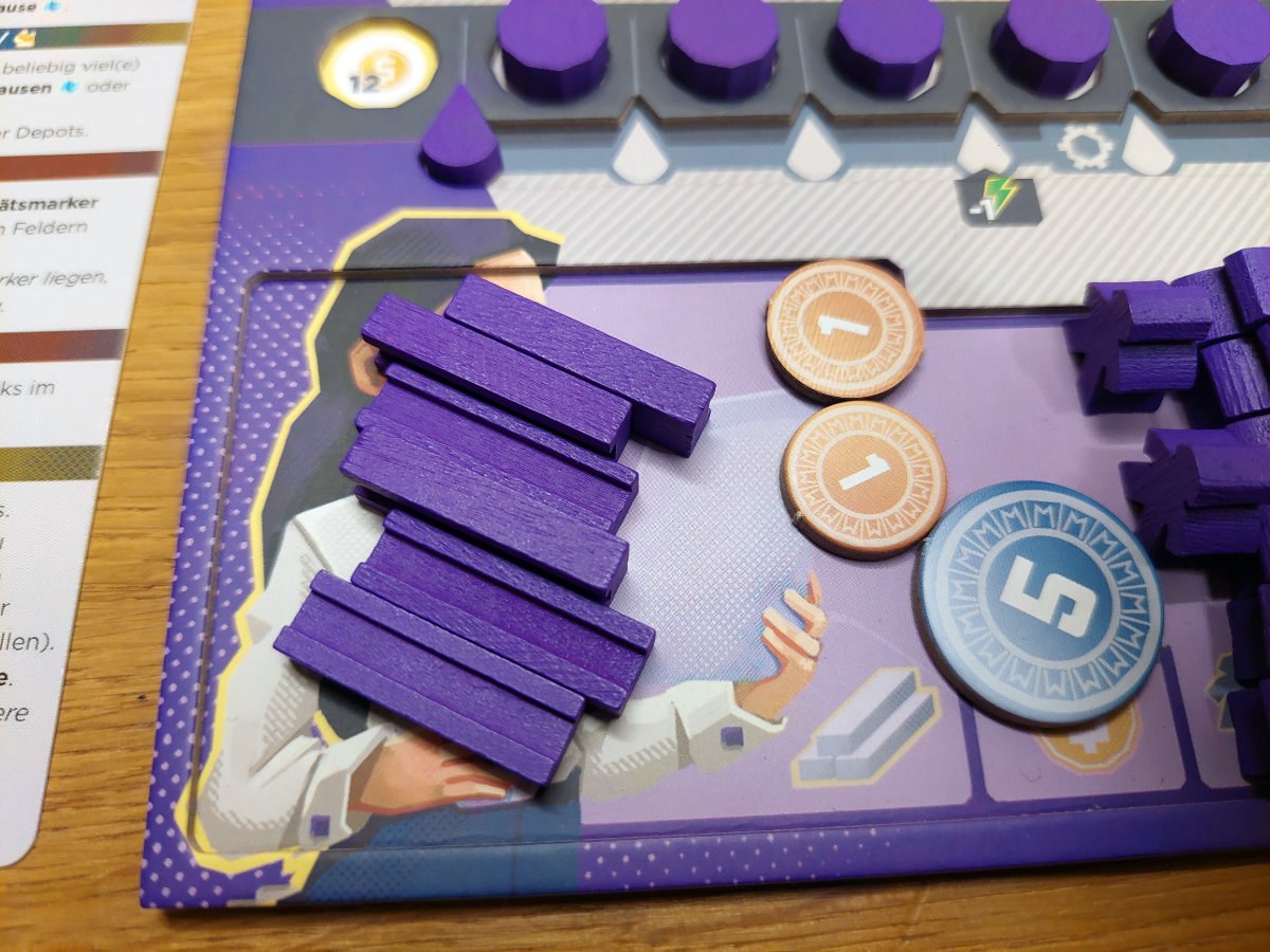 Soweit im großen und ganzen. Erwähnenswert ist noch, dass die Ressourcen begrenzt sind, von den Auslagen immer von links weggenommen werden und auf dem eigenen Spielertableau nur Platz für 8 von ihnen ist. Bautrupps sind kostenlos und daher meist das Ziel für einen ersten Besuch. Die Varianten für 1 und 2 Spieler lassen noch einen „Automa“ mitspielen.