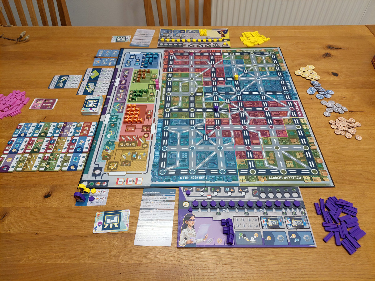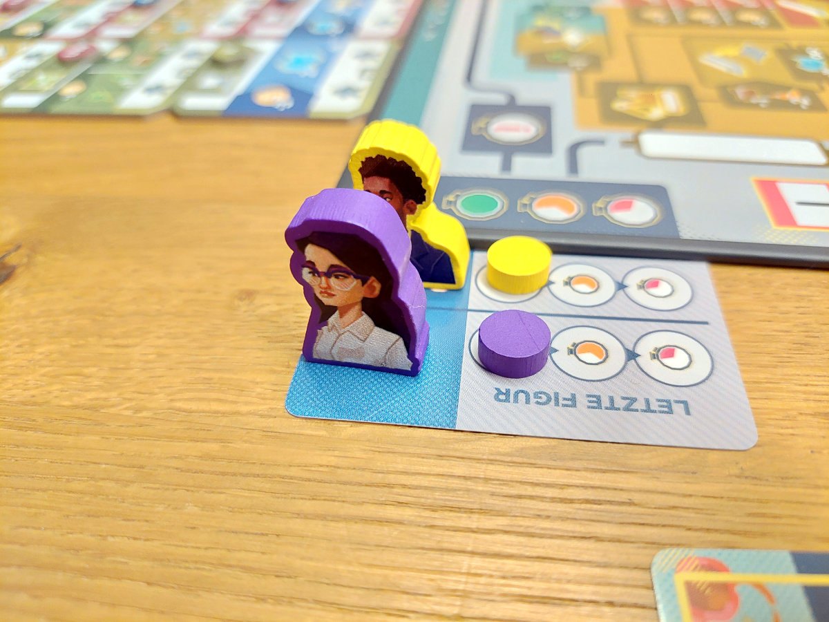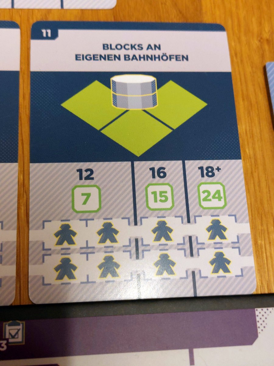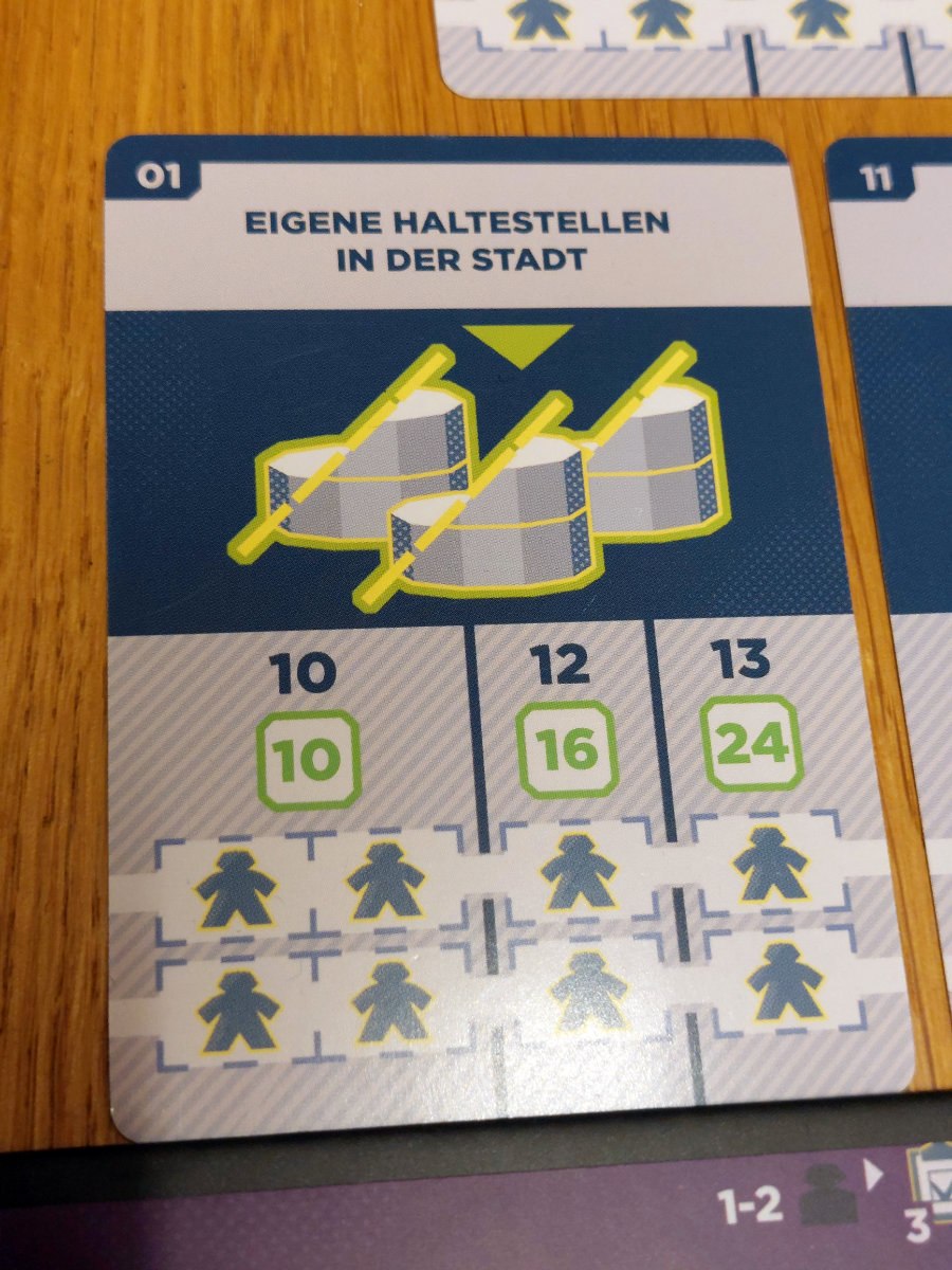 Soweit im großen und ganzen. Erwähnenswert ist noch, dass die Ressourcen begrenzt sind, von den Auslagen immer von links weggenommen werden und auf dem eigenen Spielertableau nur Platz für 8 von ihnen ist. Bautrupps sind kostenlos und daher meist das Ziel für einen ersten Besuch. Die Varianten für 1 und 2 Spieler lassen noch einen „Automa“ mitspielen.
