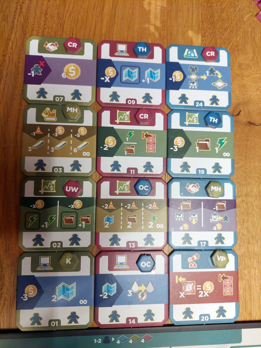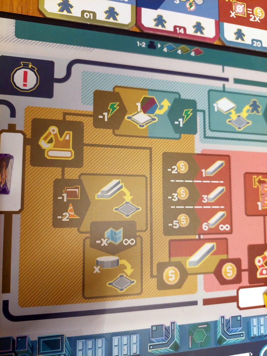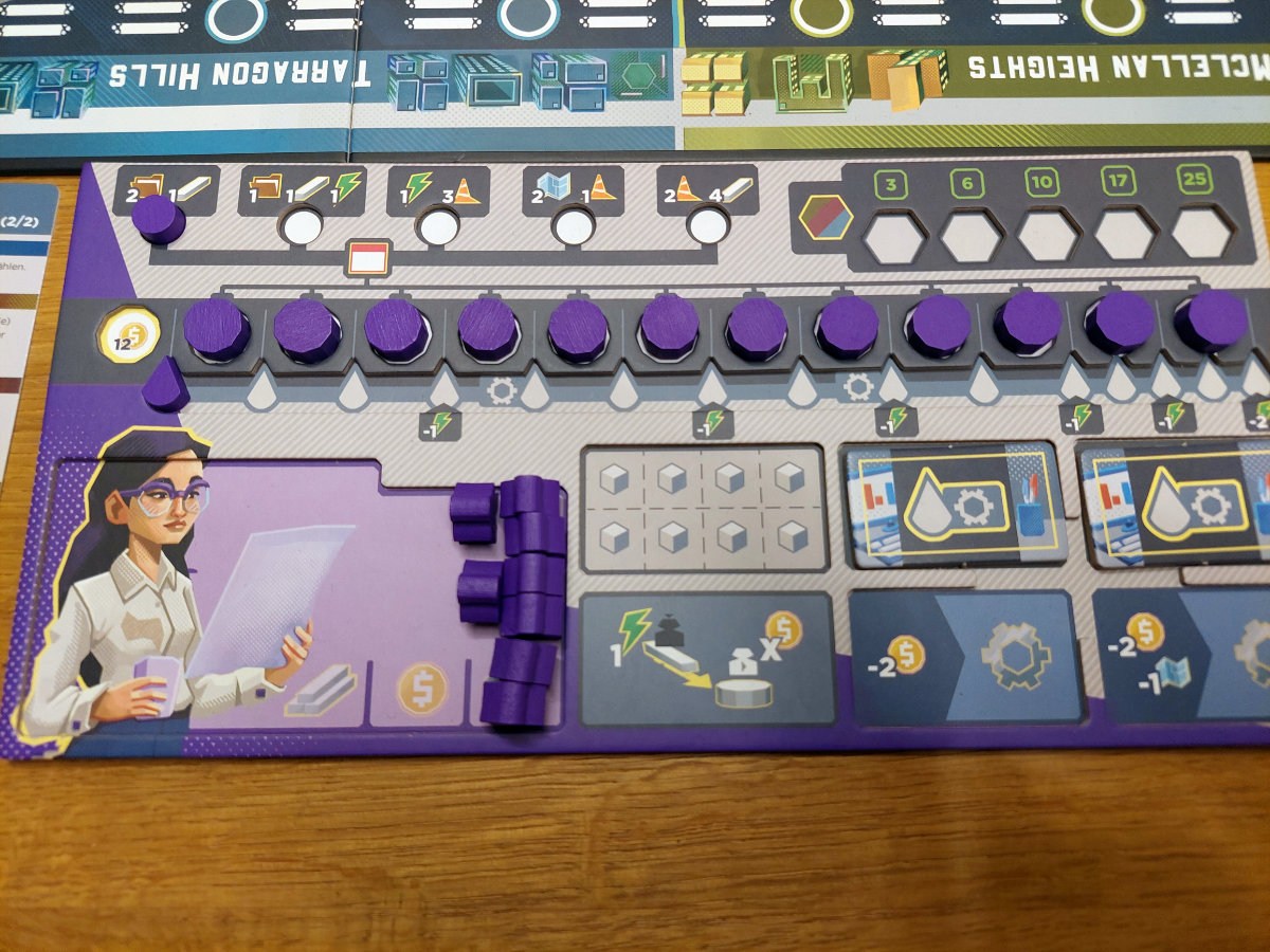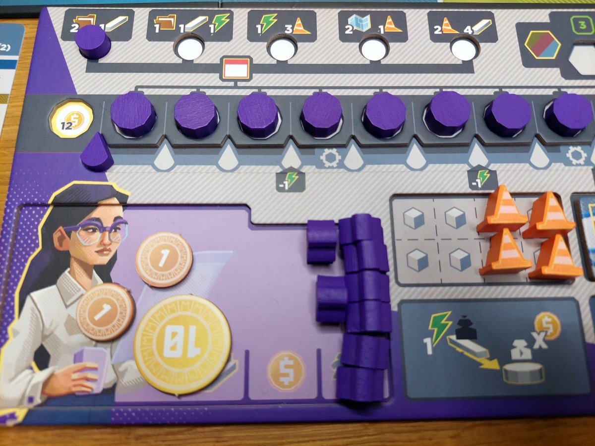 Soweit im großen und ganzen. Erwähnenswert ist noch, dass die Ressourcen begrenzt sind, von den Auslagen immer von links weggenommen werden und auf dem eigenen Spielertableau nur Platz für 8 von ihnen ist. Bautrupps sind kostenlos und daher meist das Ziel für einen ersten Besuch. Die Varianten für 1 und 2 Spieler lassen noch einen „Automa“ mitspielen.