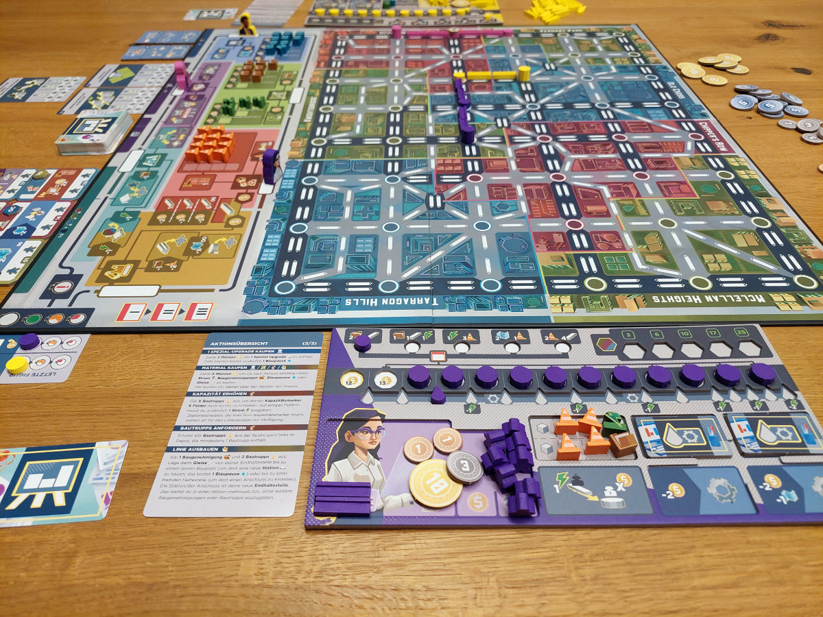 Nach einer etwas aufwendigen Vorbereitung und dem Festlegen der Spielerreihenfolge sowie der Startplatzwahl des eigenen Bahnhofs, geht es los. Über drei Jahresrunden erhalten die Spieler zu Beginn immer ein Einkommen in Geld- und Ressourcenform, je nach gewähltem Spielertafel-Bonus und eventuell noch je Platzierung in der Reihenfolge. Dann führt jeder zugweise eine Aktion auf dem städtischen Aktions“rondell“ durch. Nach der dritten Jahresrunde endet das Spiel mit der Abrechnung.