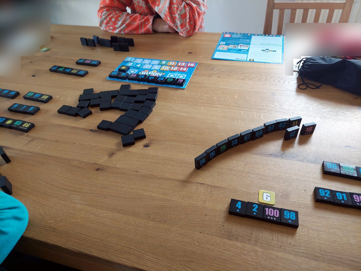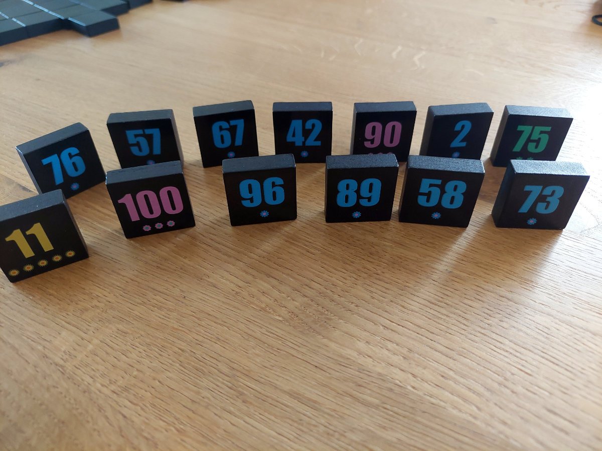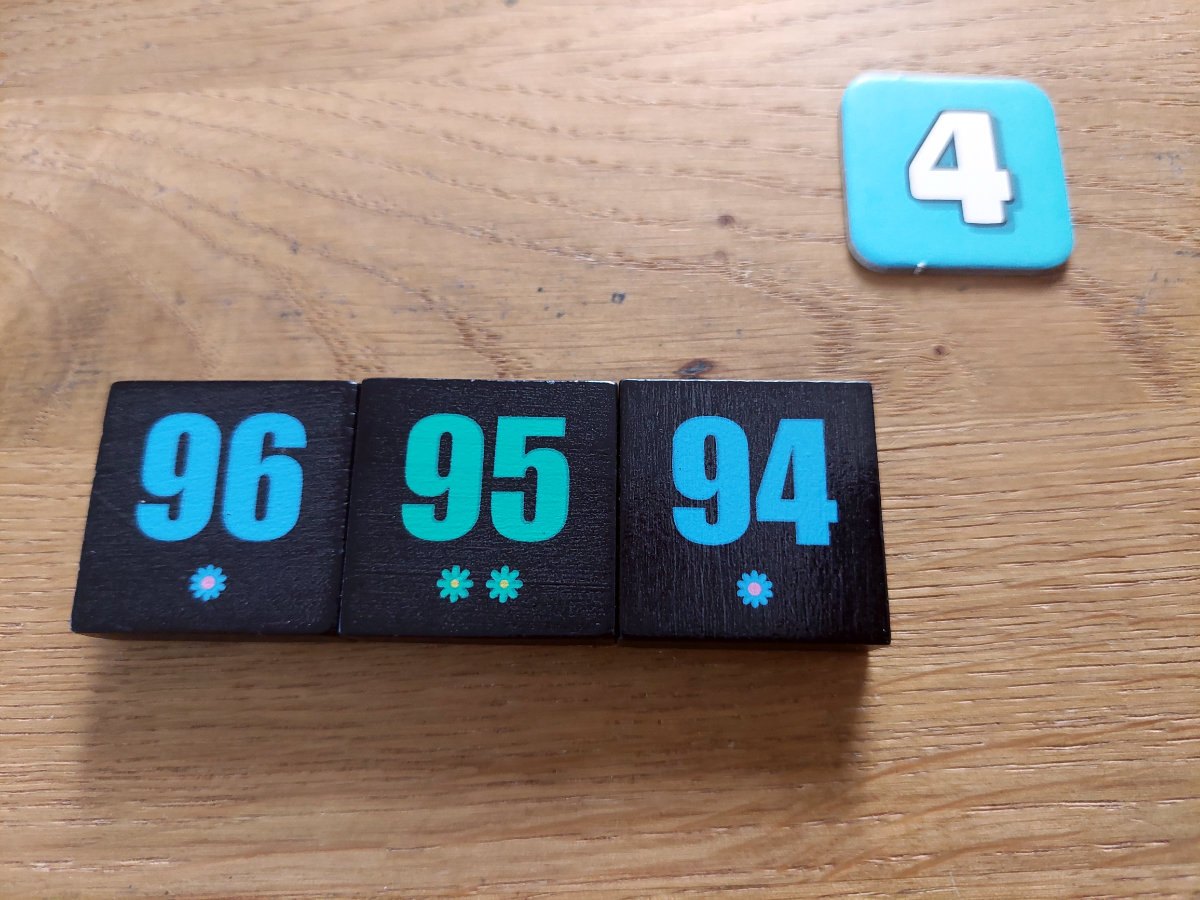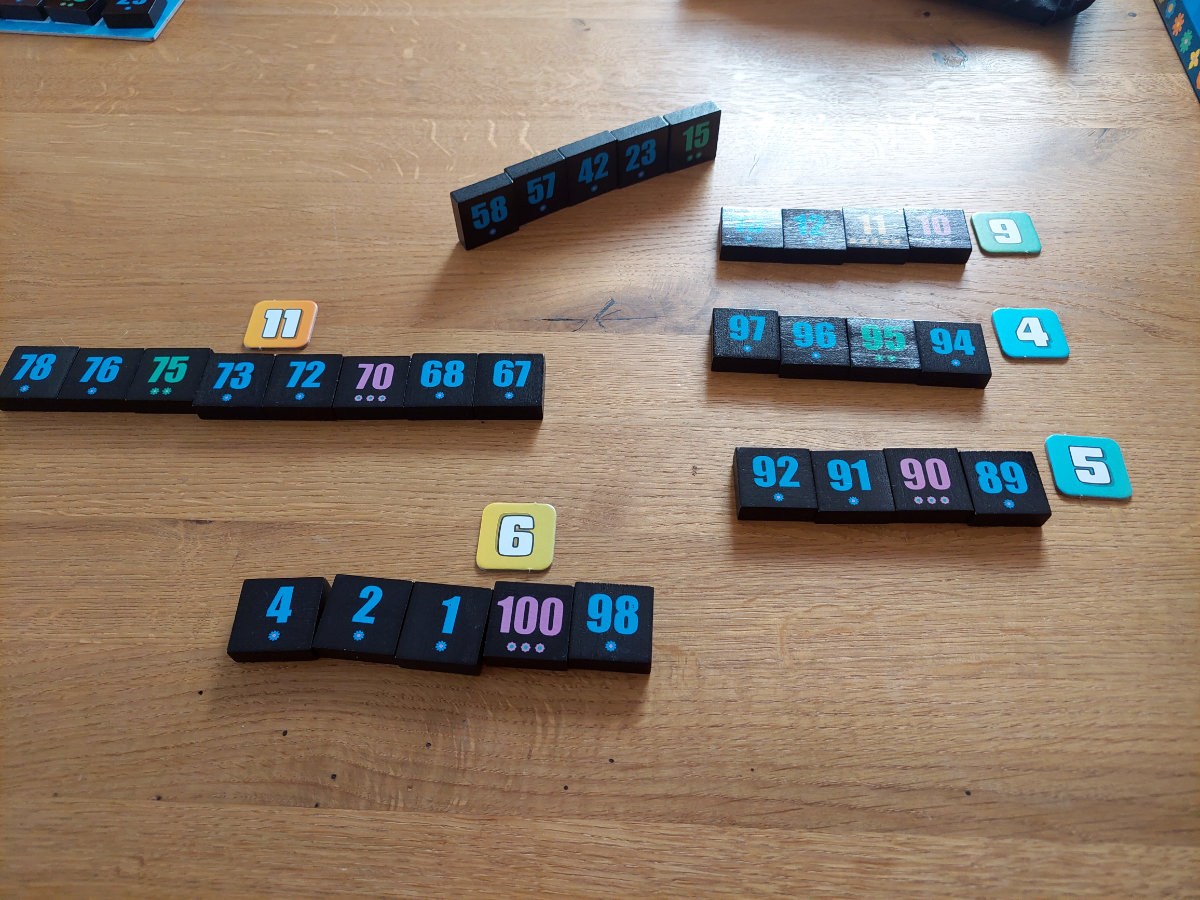 Beim Nachziehen aus der offenen Auslage wird von der verdeckten Auslage die Lücke gefüllt und wenn ein Joker (4 sind im Spiel) gezogen wird, kommt dieser auf ein entsprechendes Feld der Punktetafel. Eine auszulegende Reihe muss, in aufsteigender Zahlenfolge, aus mindestens drei Steinen bestehen. Dabei dürfen zwischen den Zahlen Abstände von 2 bestehen, also z.B. „38, 40, 42“. Um eine Reihe zu erstellen, darf man dazu auch von einer Reihe eines Mitspielers Steine rauben – allerdings müssen nach dem Raub immer noch mindestens 3 Steine dort liegen und die Abstandsregel eingehalten sein. Nach dem Auslegen überprüft man die auf den Steinen eventuell ebenfalls abgedruckten Blumen und nimmt sich, gemäß deren Anzahl, ein Punkteplättchen von der Tafel. Ist das Punkteplättchen der erreichten Zahl nicht mehr vorrätig, nimmt man ein niedrigeres.