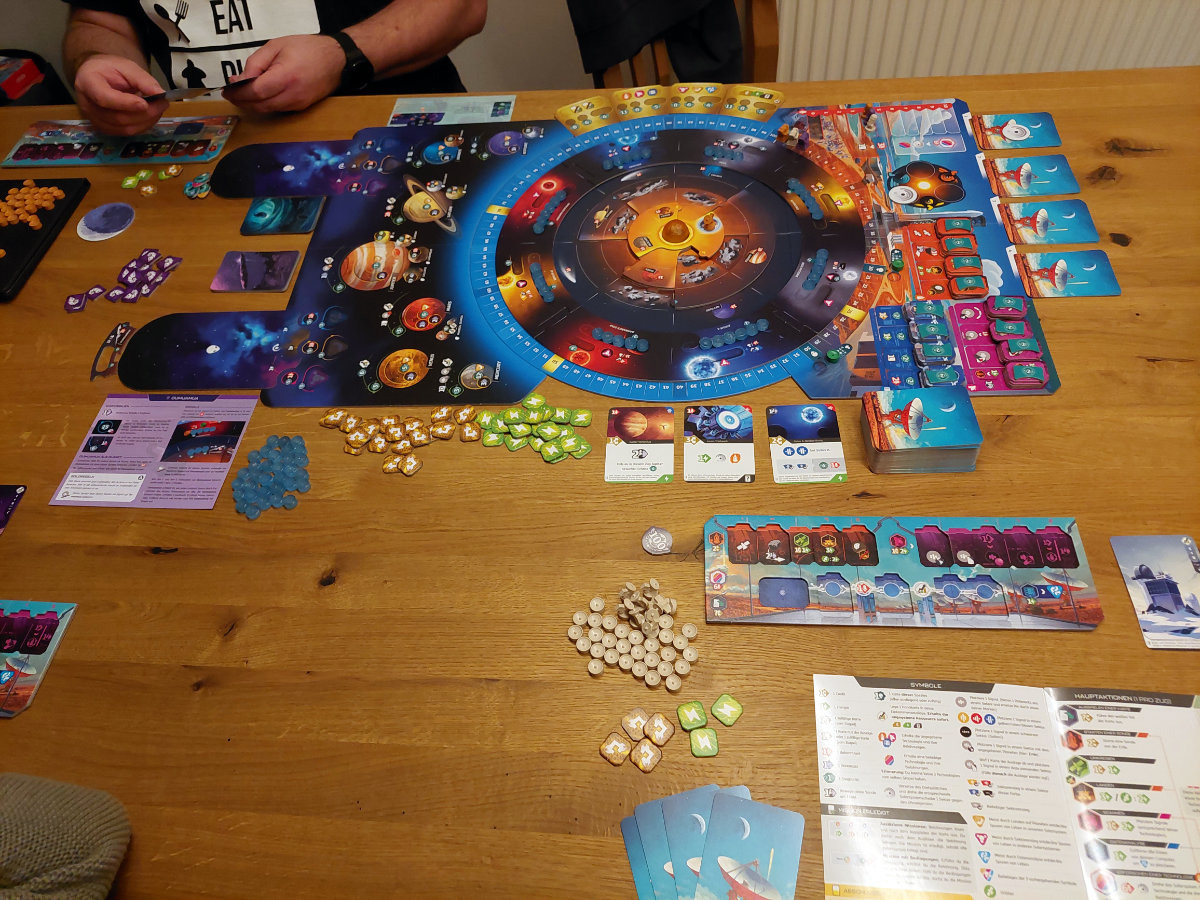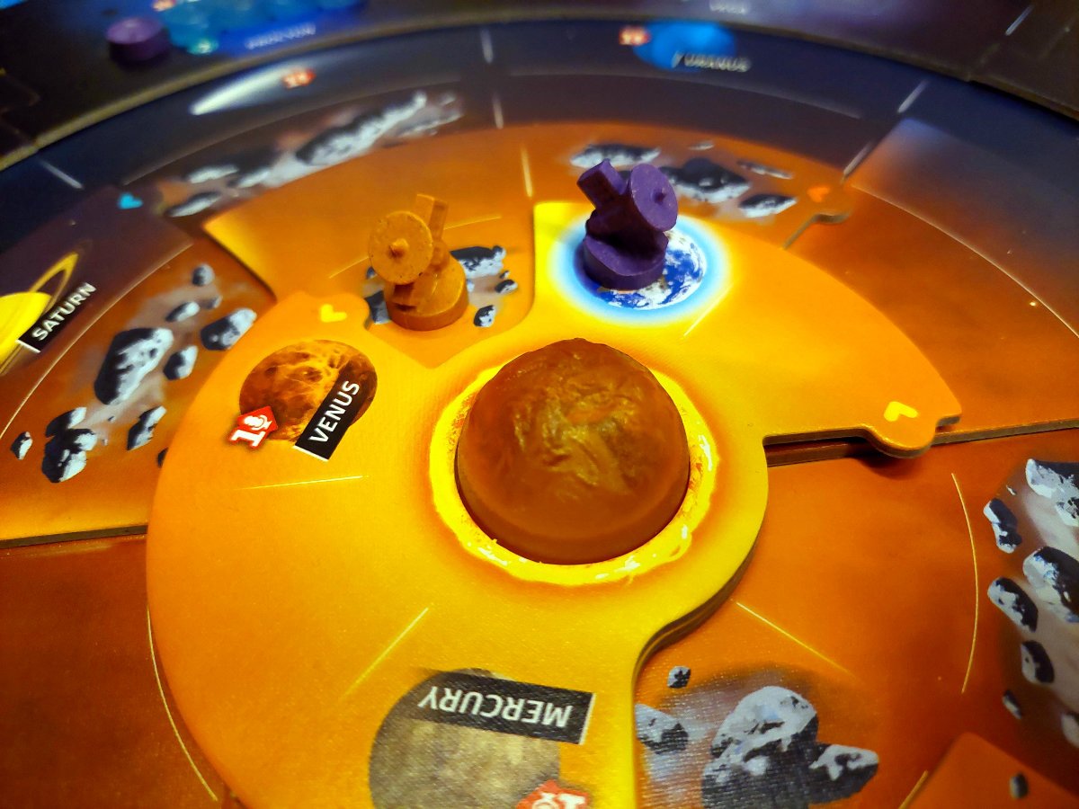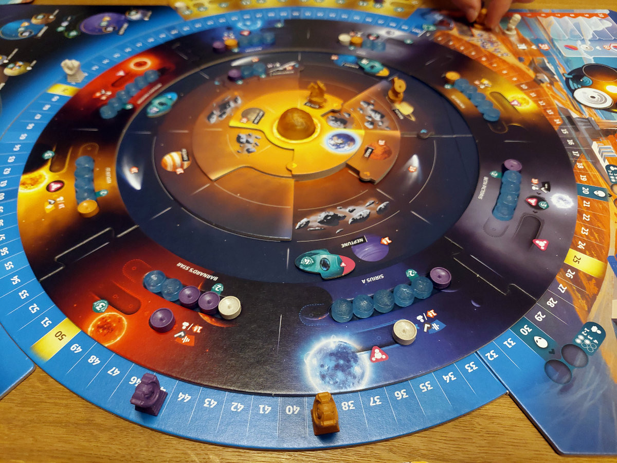 Immer wieder wird nach Forschungsaktionen auch der Spielbereich der Planeten gedreht (mehrschichtige Papprondelle), um die Umlaufbahnbewegungen zu simulieren und damit auch die Sonden eventuell zwangszubewegen (kann vorausgeplant recht nützlich sein, um Energie zu sparen).