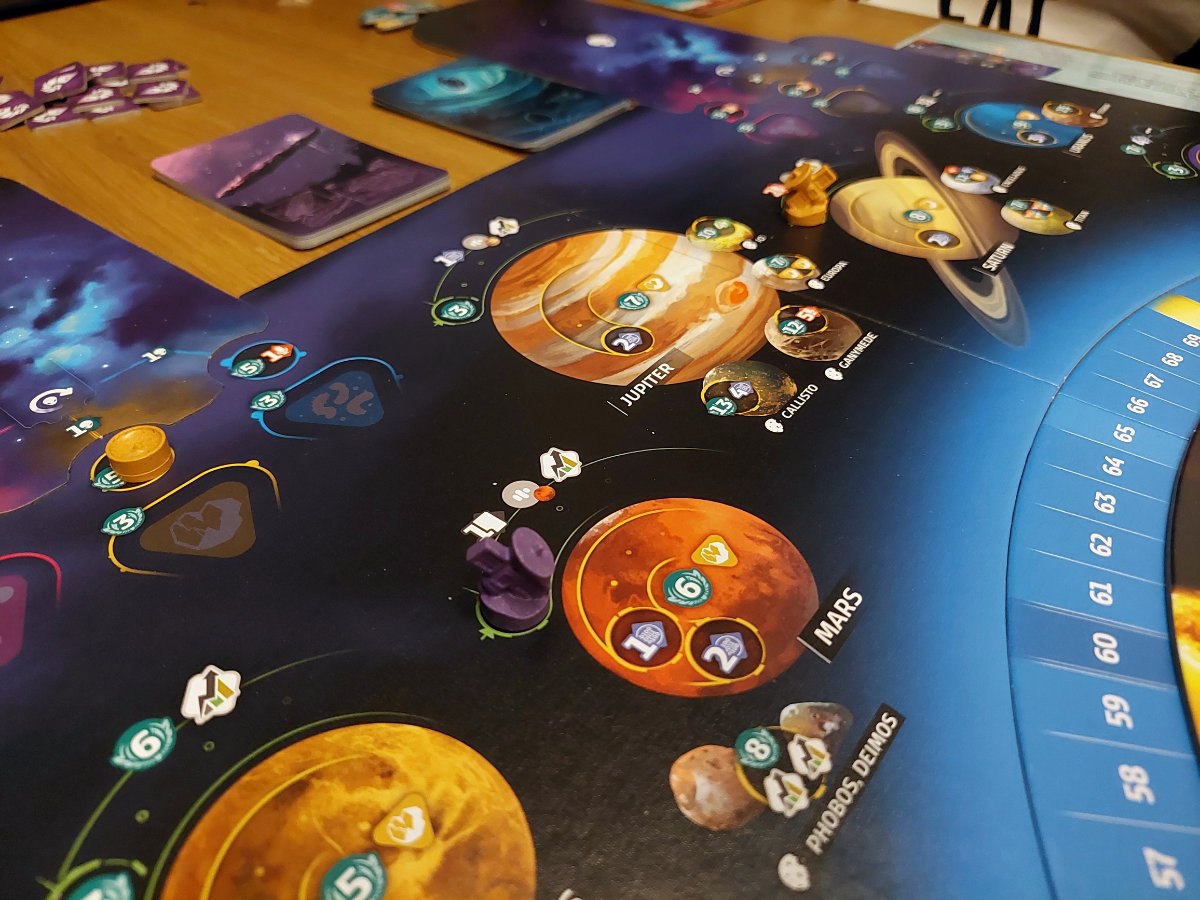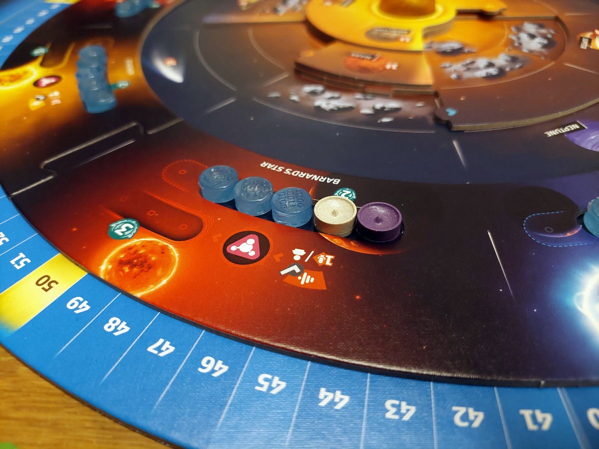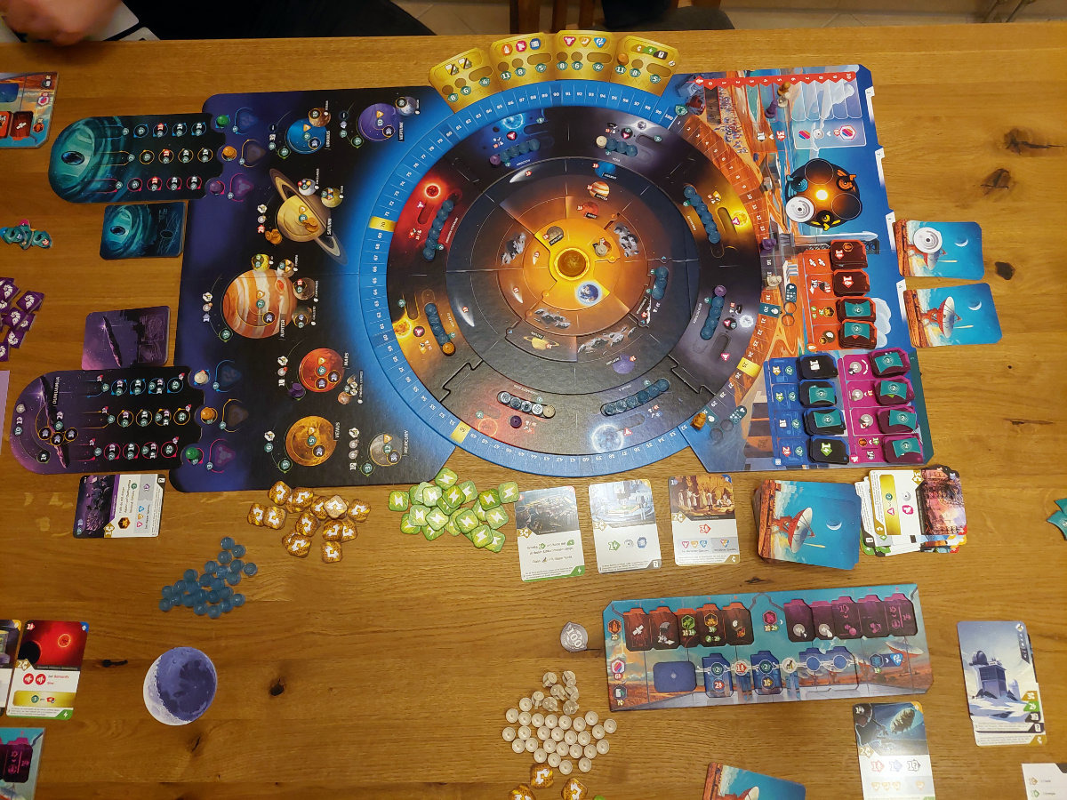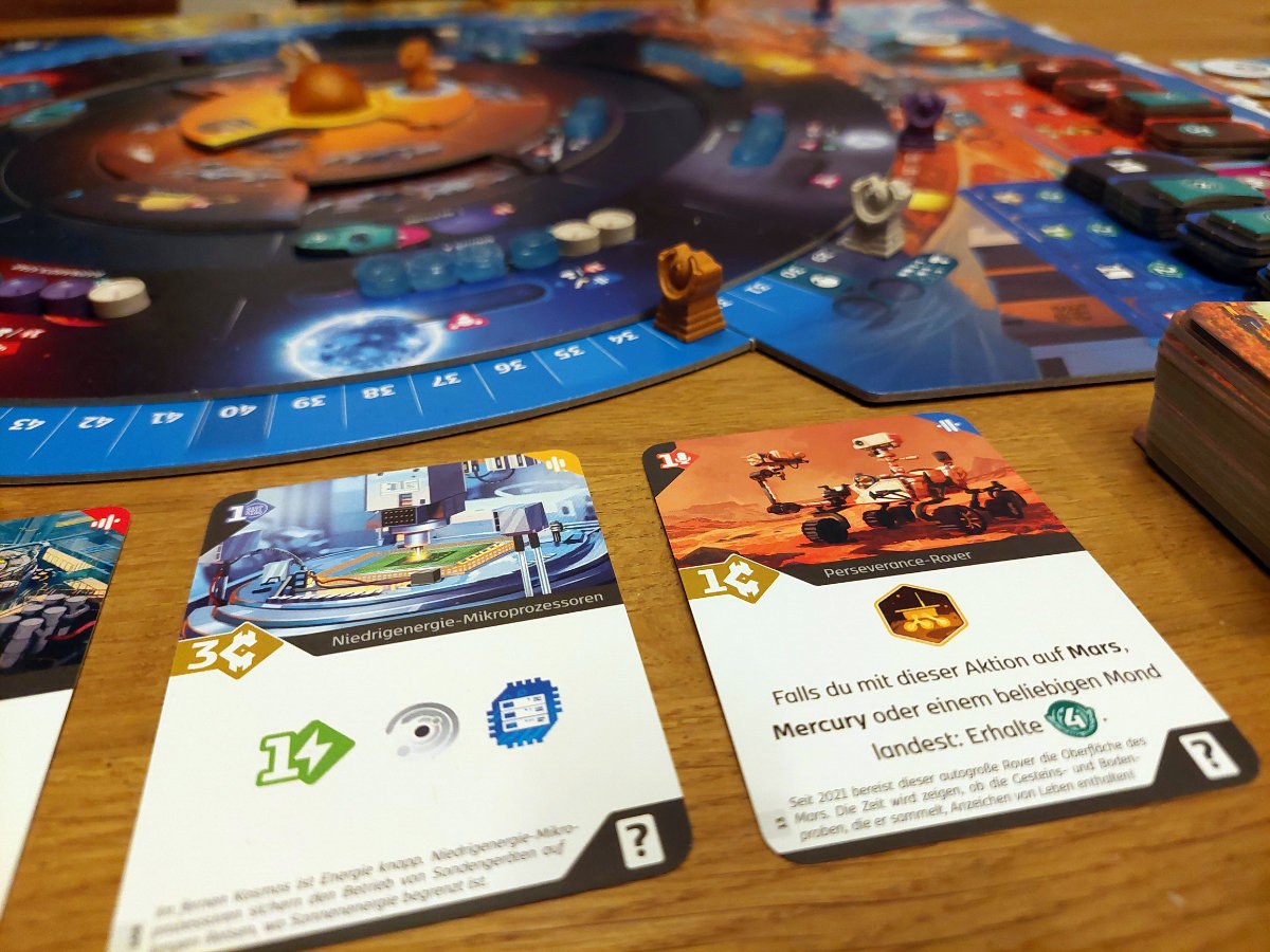 Immer wieder wird nach Forschungsaktionen auch der Spielbereich der Planeten gedreht (mehrschichtige Papprondelle), um die Umlaufbahnbewegungen zu simulieren und damit auch die Sonden eventuell zwangszubewegen (kann vorausgeplant recht nützlich sein, um Energie zu sparen).