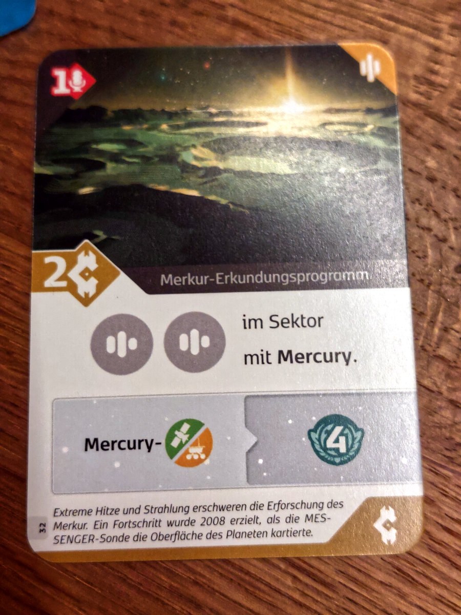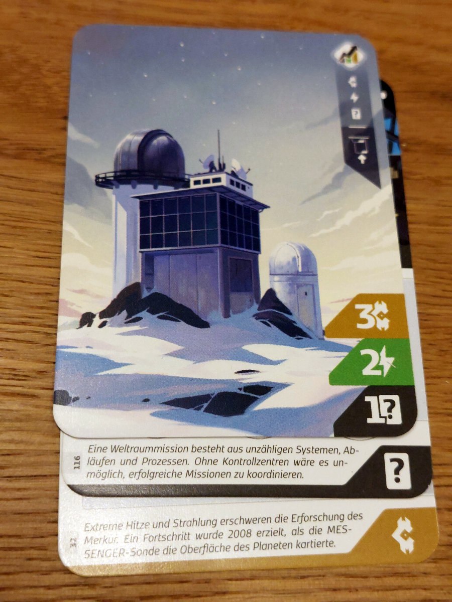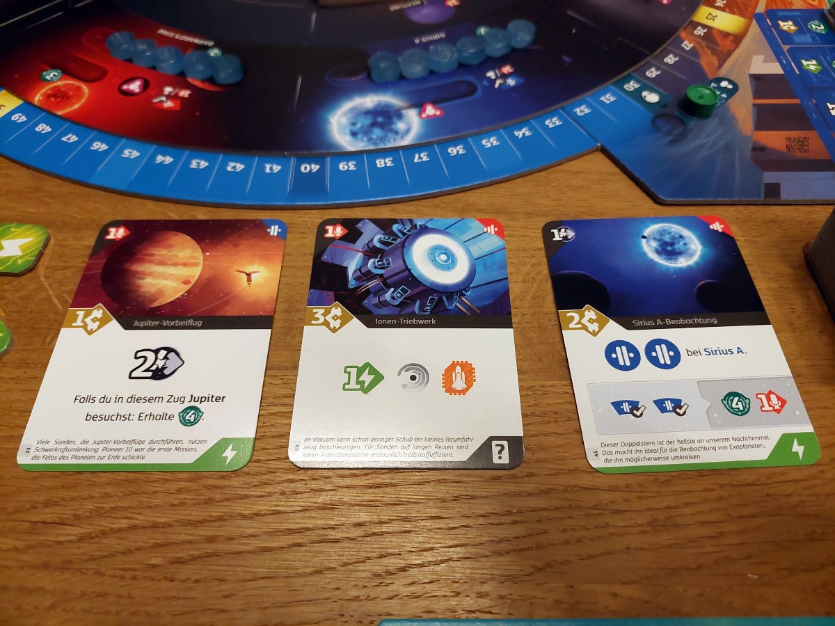 Die gefühlt ewig knappen Ressourcen und der Drang mehr machen zu wollen, als per Runde möglich ist, ist dabei typisch für das Spielgenre, fordert aber so auch heraus und macht an sich Spaß. Zusammen mit den variierenden Aliens pro Partie kommt so ein hoher Wiederspielreiz zusammen, denn bis man wirklich alles gesehen und an Taktiken ausprobiert hat, vergehen so manche Spielabende. Die Interaktion begrenzt sich zwar auf dem Wettrennen um die besseren Punkteplätze, aber dies kann schon was ausmachen. Ein gewisser Glücksanteil bleibt auch nicht aus, aber generell lässt sich immer etwas bewerkstelligen – allein durch die enorme Kartenauswahl und -vielfalt und den damit möglichen freien Aktionen. Je nach Spielerzahl und Spielertypen kann es schon mal zu längeren Wartezeiten zwischen den Zügen kommen, da eben eine Menge geplant und bedacht werden will. Aber sobald die Sonden fleissig fliegen, die Einnahmen dauerhaft gesichert sind und die ersten Alienspuren verfolgt werden, fühlt sich alles geschmeidiger an…..es läuft^^.
