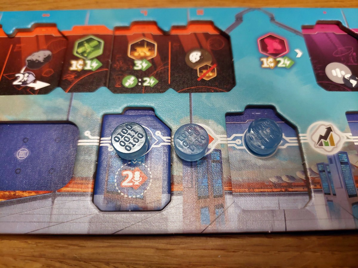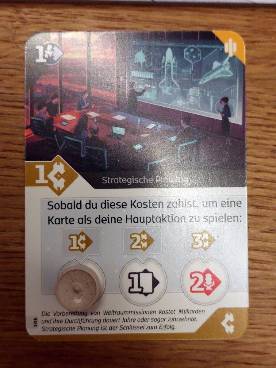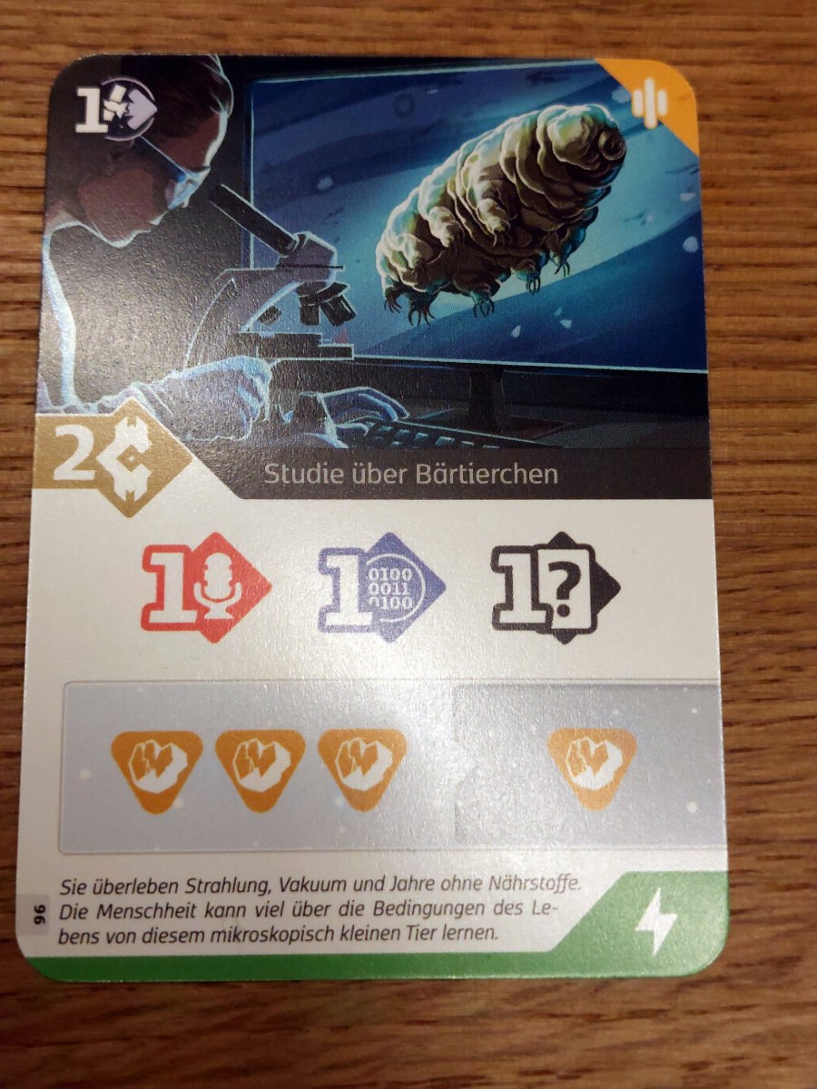 Die gefühlt ewig knappen Ressourcen und der Drang mehr machen zu wollen, als per Runde möglich ist, ist dabei typisch für das Spielgenre, fordert aber so auch heraus und macht an sich Spaß. Zusammen mit den variierenden Aliens pro Partie kommt so ein hoher Wiederspielreiz zusammen, denn bis man wirklich alles gesehen und an Taktiken ausprobiert hat, vergehen so manche Spielabende. Die Interaktion begrenzt sich zwar auf dem Wettrennen um die besseren Punkteplätze, aber dies kann schon was ausmachen. Ein gewisser Glücksanteil bleibt auch nicht aus, aber generell lässt sich immer etwas bewerkstelligen – allein durch die enorme Kartenauswahl und -vielfalt und den damit möglichen freien Aktionen. Je nach Spielerzahl und Spielertypen kann es schon mal zu längeren Wartezeiten zwischen den Zügen kommen, da eben eine Menge geplant und bedacht werden will. Aber sobald die Sonden fleissig fliegen, die Einnahmen dauerhaft gesichert sind und die ersten Alienspuren verfolgt werden, fühlt sich alles geschmeidiger an…..es läuft^^.