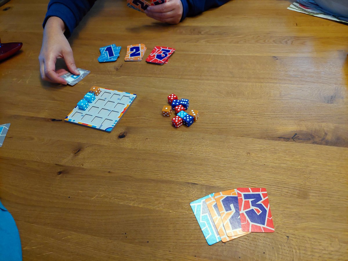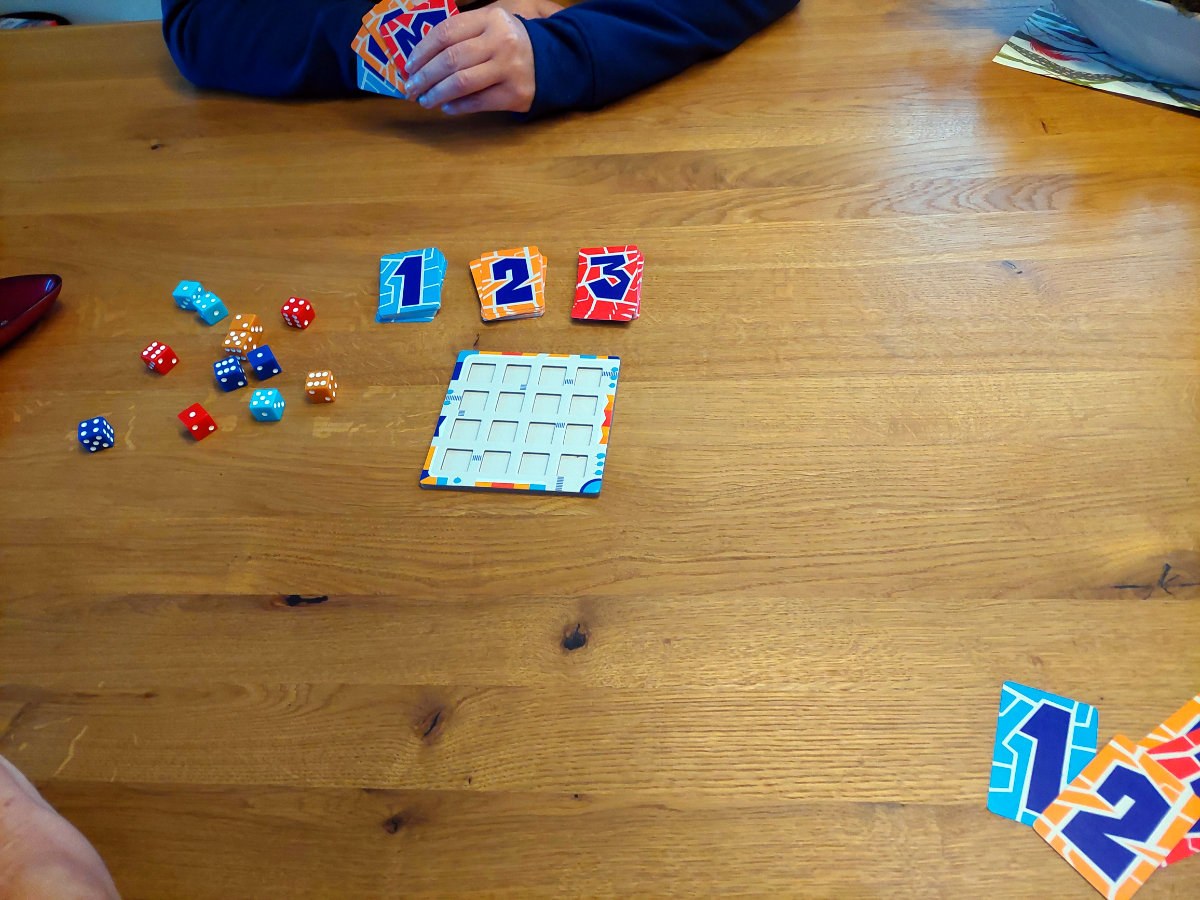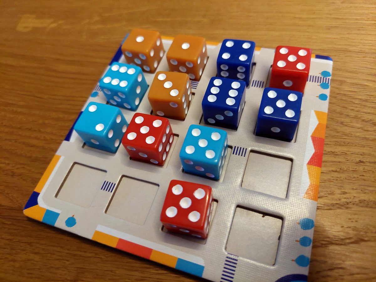 Der Startspieler wirft einmal alle 12 Würfel und legt sie dann für alle griffbereit – die Ergebnisse dürfen nicht mehr verändert werden! Einmal dürfte erneut geworfen werden, dann muss das Ergebnis akzeptiert werden. Nun wählt er einen Würfel und legt diesen auf ein beliebiges Feld des 4×4-Rasters (2×2 bei 2 Spielern). Danach folgen die Mitspieler, welche ebenfalls immer nur einen Würfel wählen und platzieren. Jeder versucht dabei die Würfel so abzulegen, dass eine (oder vielleicht sogar mehrere) seiner Aufgabenkarten erfüllt werden (können). Gelegentlich kommt es vor, dass Mitspieler die Würfel so arrangieren, dass man selbst eine Aufgabe ohne weiteres Zutun lösen kann^^. Wurden Aufgaben erledigt, zieht man Karten nach, bis man wieder 4 auf der Hand hat, wobei es erneut egal ist, von welchem Schwierigkeitsgrad man sie wählt. Die Aufgaben sind dabei entsprechend ihres Levels Punkte wert (1, 2, 3) und am Ende gewinnt, wer die meisten hat.